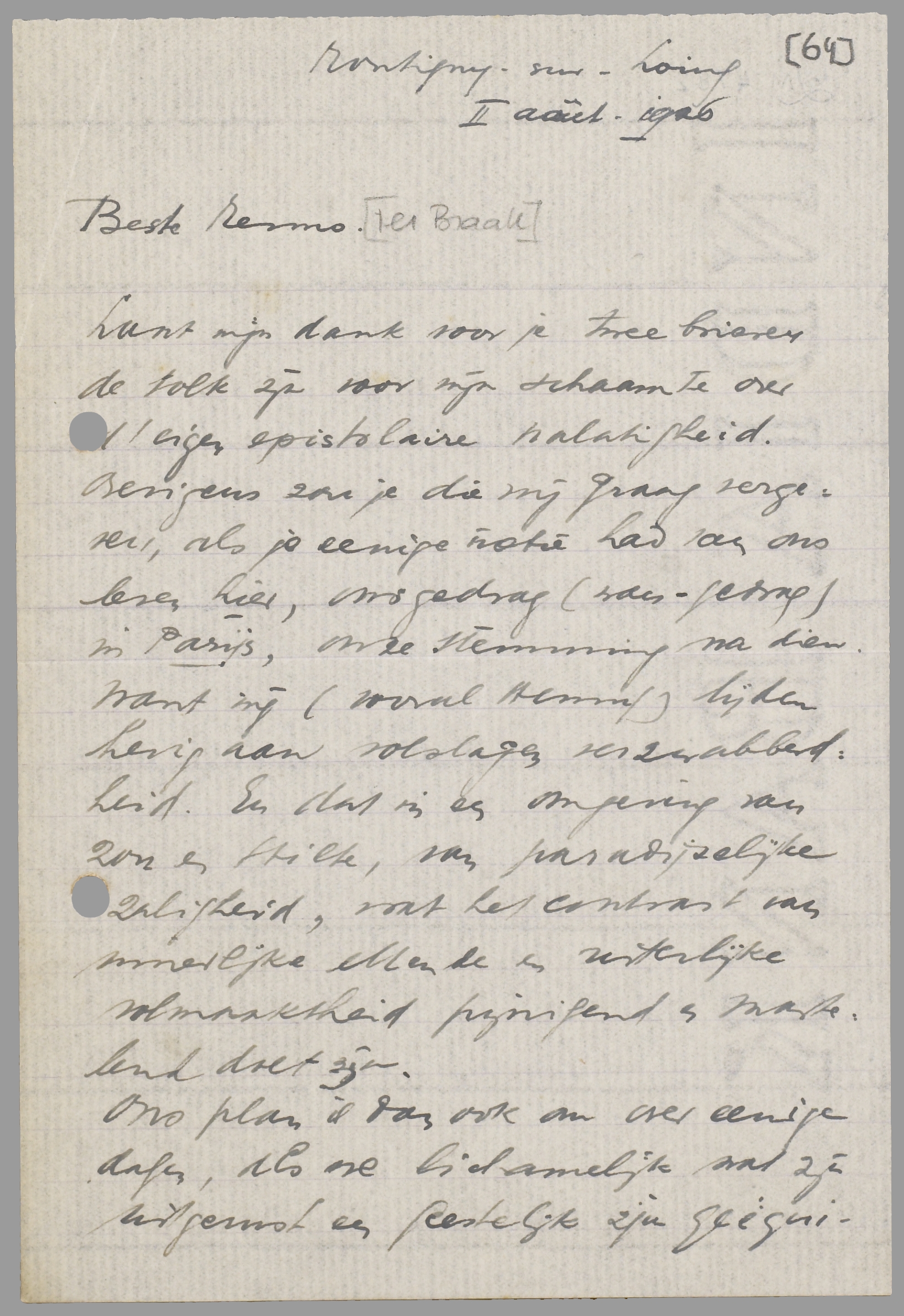 Laat mijn dank voor je twee brieven de tolk zijn voor mijn schaamte over d'eigen epistolaire nalatigheid. Overigens zou je die mij graag vergeven, als je eenige notie had van ons leven hier, ons gedrag (wan-gedrag) in Parijs, onze stemming na dien. Want wij, vooral Henny, lijden hevig aan volslagen verzwabberdheid. En dat in een omgeving van zon en stilte, van paradijselijke zaligheid, wat het contrast van innerlijke ellende en uiterlijke volmaaktheid pijnigend en martelend doet zijn.