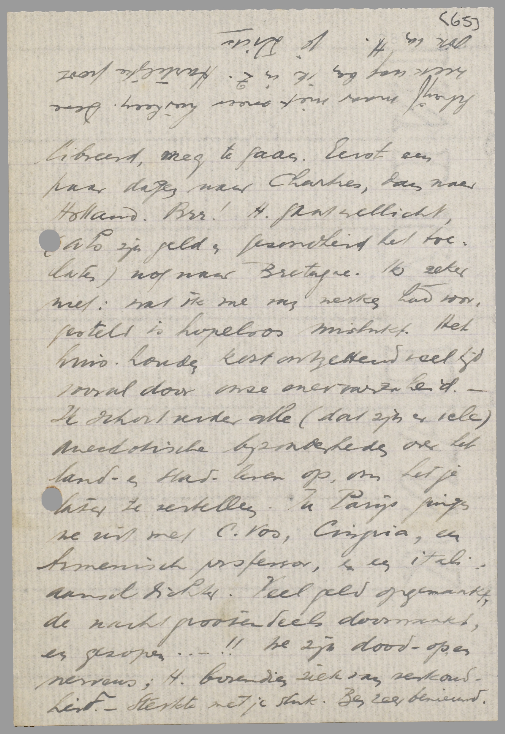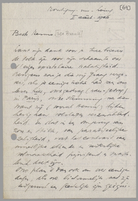 Ons plan is dan ook om over eenige dagen, als we lichamelijk wat zijn uitgerust, en feestelijk zijn geëquilibreerd, weg te gaan. Eerst een paar dagen naar Chartres, dan naar Holland. Brr! H. gaat wellicht (als zijn geld en gezondheid het toelaten) nog naar Bretagne. Ik zeker niet: wat ik me van werken had voorgesteld is hopeloos mislukt. Het huis-houden kost ontzettend veel tijd, vooral door onze onervarenheid. - Ik schort verder alle (dat zijn er vele) anecdotische bijzonderheden over het land- en stad- leven liever op, om het je later te vertellen. In Parijs gingen we uit met C. Vos, Cingria, een Armenisch professor, en een Italiaansch dichter. Veel geld opgemaakt, de nacht grootendeels doorwaakt en gezopen...!! We zijn dood-op en nerveus; H. bovendien ziek van verkoudheid. - Sterkte met je stuk. Ben zeer benieuwd. Schrijf maar niet meer hierheen. Deze week nog ben ik in Z.