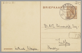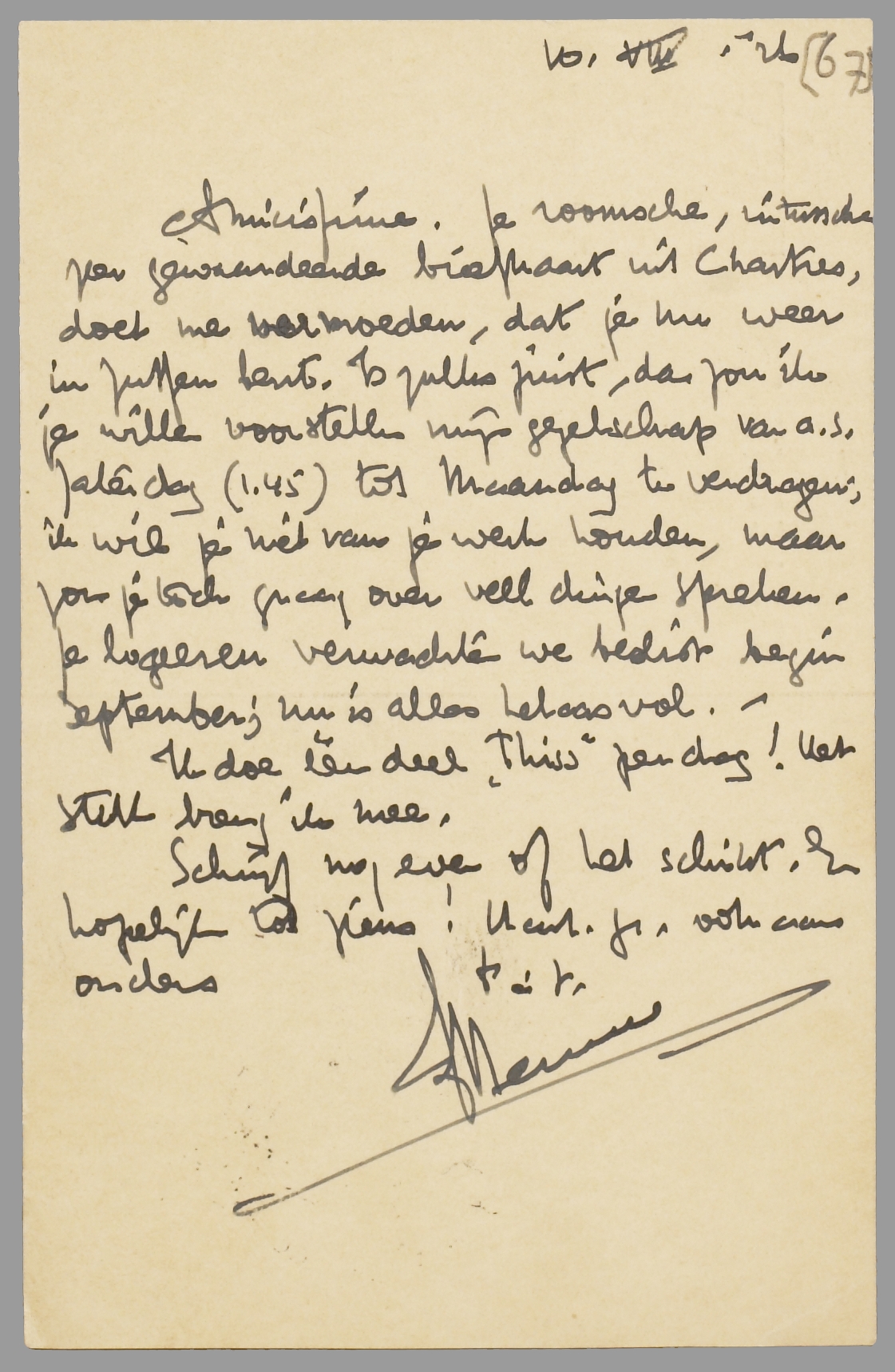 Je roomsche, intuschen zeer gewaardeerde briefkaart uit Chartres, doet me vermoeden, dat je nu weer in Zutfen bent. Is zulks juist, dan zou ik je willen voorstellen mijn gezelschap van a.s. Zaterdag (1.45) tot Maandag te verdragen; ik wil je niet van je werk houden, maar zou je toch graag over veel dingen spreken. Je logeeren verwachten we beslist begin September; nu is alles helaas vol. -