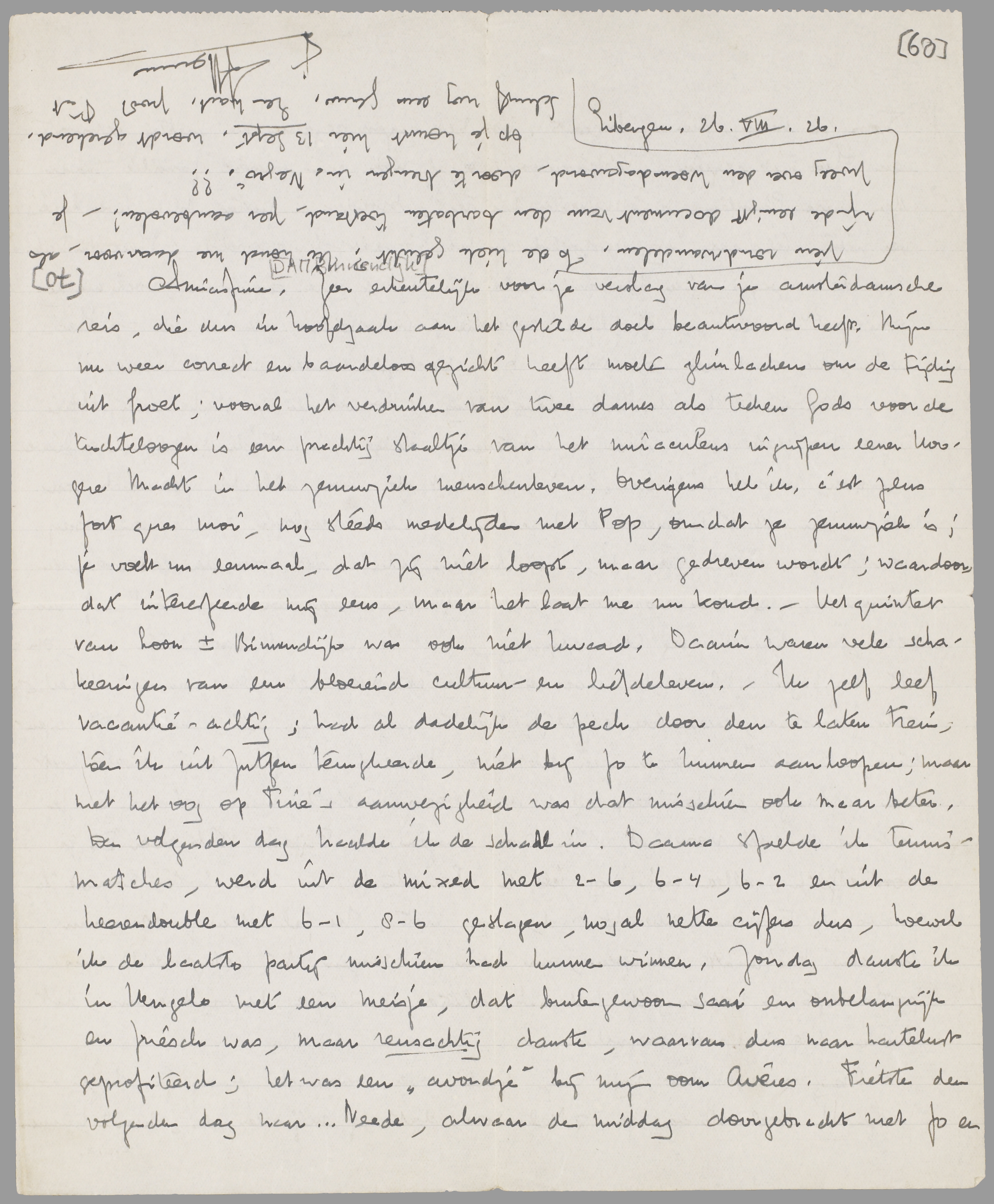 Zeer erkentelijk voor je verslag van je amsterdamsche reis, die dus in hoofdzaak aan het gestelde doel beantwoord heeft. Mijn nu weer correct en baardeloos gezicht heeft moeten glimlachen om de tijding uit Groet; vooral het verdrinken van twee dames als teeken Gods voor de tuchteloozen is een prachtig staaltje van het miraculeus ingrijpen eener hoogere Macht in het zenuwziek menschenleven. Overigens heb ik, c’est plus fort que moi, nog steeds medelijden met Pop, omdat ze zenuwziek is; je voelt nu eenmaal, dat zij niet loopt, maar gedreven wordt; waardoor, dat interesseerde mij eens, maar het laat me nu koud. - Het quintet van Loon + Binnendijk was ook niet kwaad. Daarin waren vele schakeeringen van een bloeiend cultuur- en liefdeleven. - Ik zelf leef vacantie-achtig; had al dadelijk de pech door den te laten trein, toen ik uit Zutfen terugkeerde, niet bij Jo te kunnen aanloopen; maar met het oog op Tine’s aanwezigheid was dat misschien ook maar beter. Den volgenden dag haalde ik de schade in. Daarna speelde ik tennismatches, werd uit de mixed met 2-6, 6-4, 6-2 en uit de heerendouble met 6-1, 8-6 geslagen, nogal nette cijfers dus, hoewel ik de laatste partij misschien had kunnen winnen. Zondag danste ik in Hengelo met een meisje, dat buitengewoon saai en onbelangrijk en friesch was, maar reusachtig danste, waarvan dus naar hartelust geprofiteerd; het was een ‘avondje’ bij mijn oom Avéres. Fietste den volgenden dag naar... Neede, alwaar de middag doorgebracht met Jo en Tops ter Haar, die er logeert. Op het gazon gezeten en prettig gepraat en Theo niet gezien. Gisterenavond begaf zich mijn gansche familie naar den huize Planten, mijn moeder per trein, broeders en zusters, plus twee logé’s per fiets. Aldaar jazz gespeeld en me tooneelspeler gevoeld; Theo den heelen avond aanwezig. Ik kwam er als een halve gare vandaan, voel me nog onwezenlijk van een dergelijke comedie; intusschen, ik heb me op Theo’s wijn, die goed was, gewroken. Dit moet zich maar niet herhalen. -