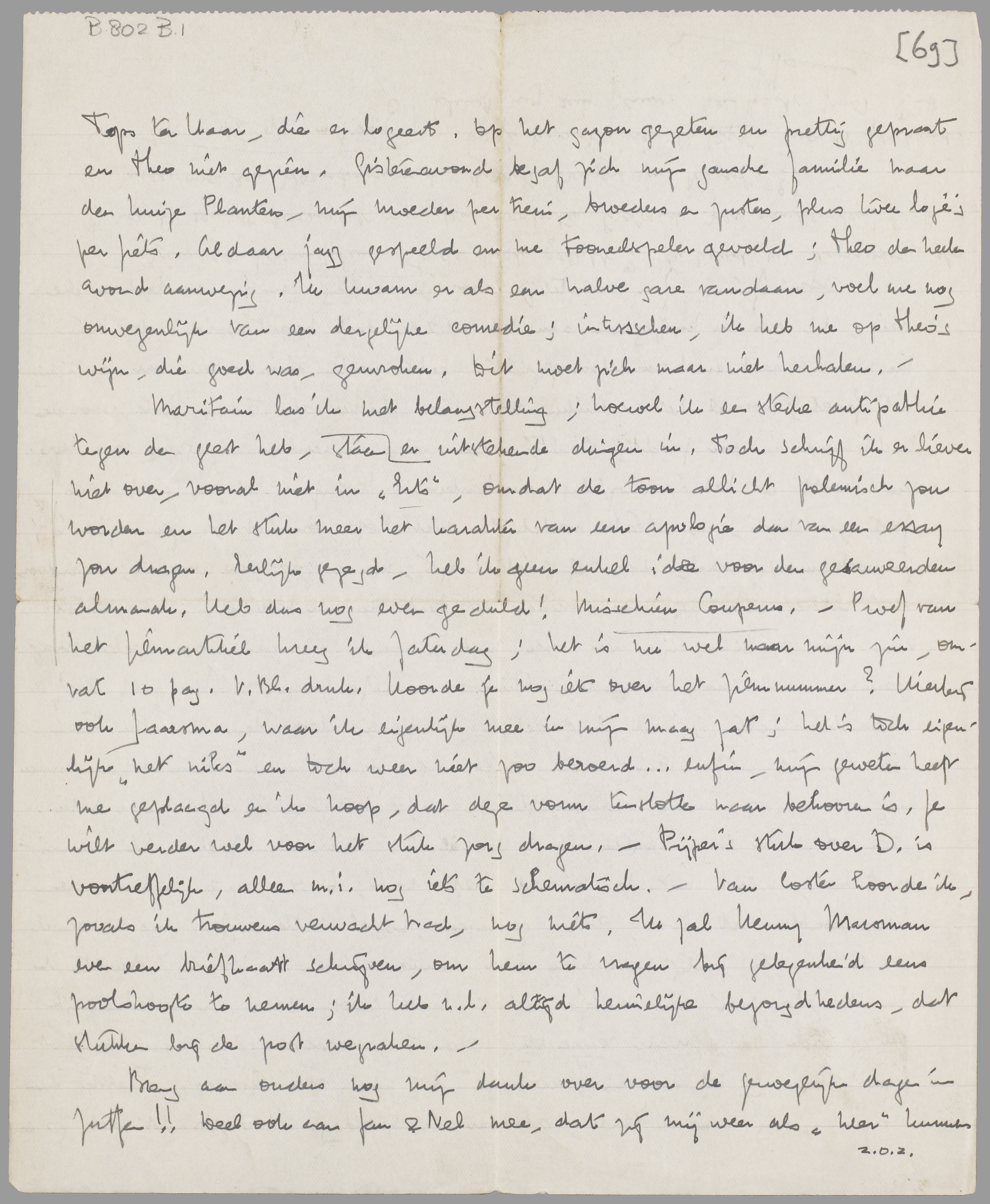 Maritain las ik met belangstelling; hoewel ik een sterke antipathie tegen den geest heb, er staan uitstekende dingen in. Toch schrijf ik er liever niet over, vooral niet in ‘Erts’, omdat de toon allicht polemisch zou worden en het stuk meer het karakter van een apologie dan van een essay zou dragen. Eerlijk gezegd, heb ik geen enkel idee voor den gesauveerden almanak. Heb dus nog even geduld! Misschien Couperus. - Proef van het filmartikel kreeg ik Zaterdag; het is nu wel naar mijn zin, omvat 10 pag. V.Bl. druk. Hoorde je nog iets over het filmnummer? Hierbij ook Jaarsma waar ik eigenlijk mee in mijn maag zat; het is toch eigenlijk ‘net niks’ en toch weer niet zoo beroerd... enfin, mijn geweten heeft me geplaagd en ik hoop, dat deze vorm tenslotte naar behooren is. Je wilt verder wel voor het stuk zorg dragen. - Pijper’s stuk over D. is voortreffelijk, alleen m.i. nog iets te schematisch. - Van Coster hoorde ik, zooals ik trouwens verwacht had, nog niets. Ik zal Henny Marsman even een briefkaart schrijven, om hem te vragen bij gelegenheid eens poolshoogte te nemen; ik heb n.l. altijd heimelijke bezorgdhedens, dat stukken bij de post wegraken.-