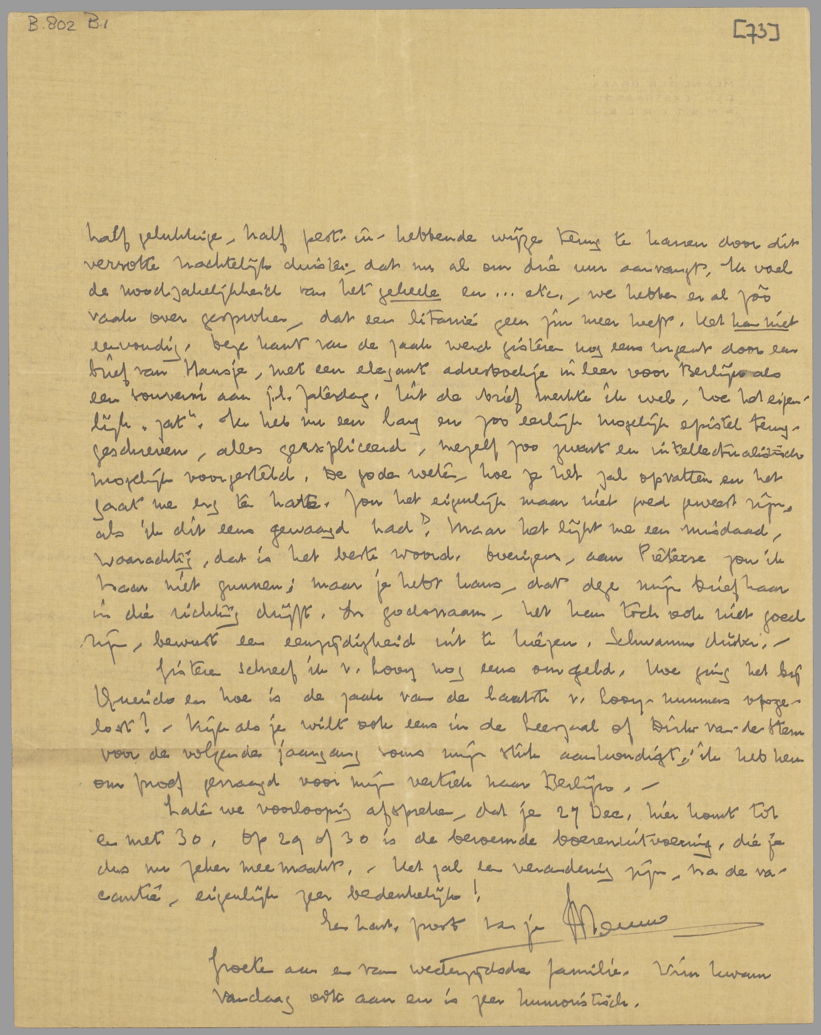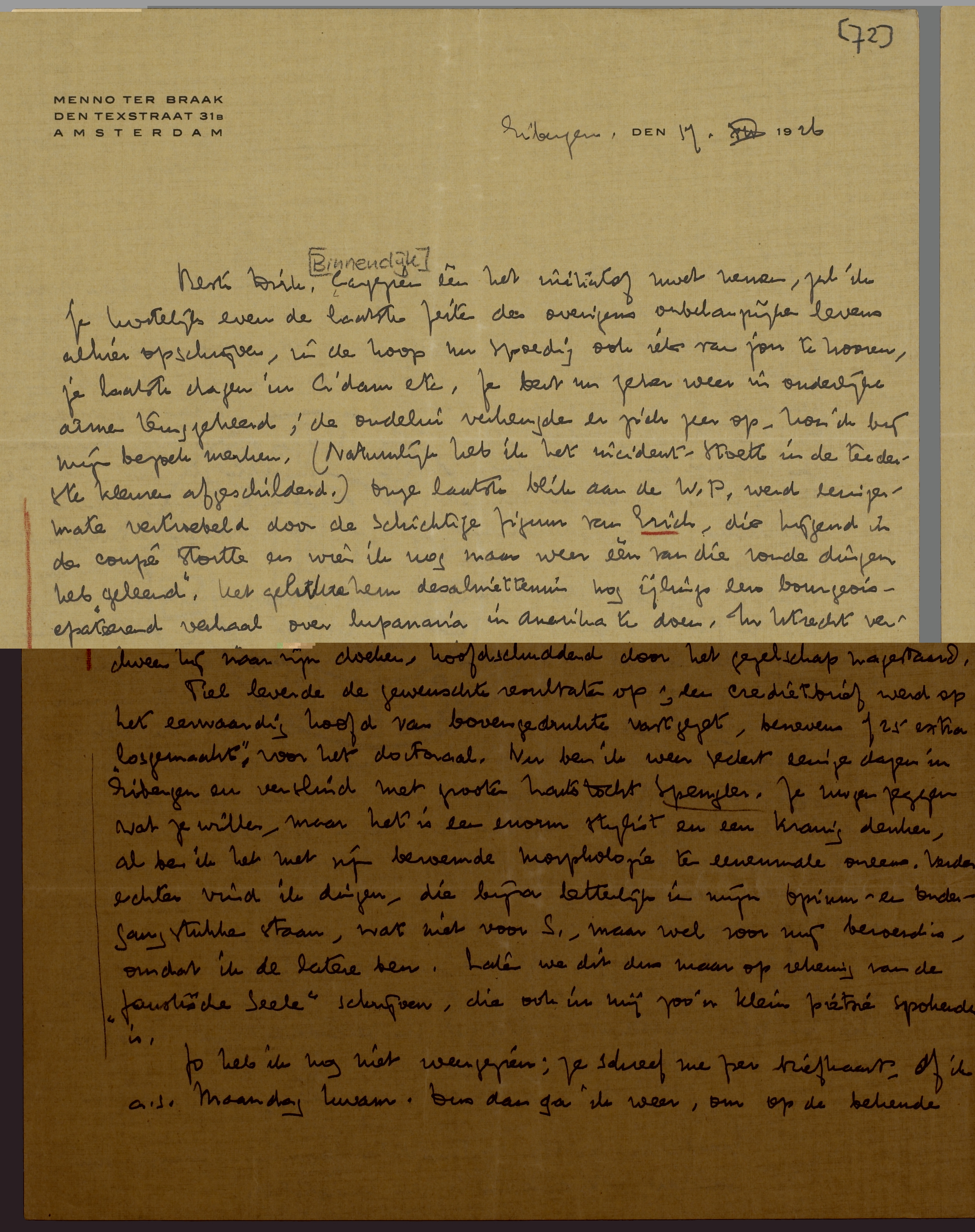 Aangezien één het initiatief moet nemen, zal ik je kostelijk even de laatste feiten des overigens onbelangrijken levens alhier opschrijven, in de hoop nu spoedig ook iets van jou te hooren, je laatste dagen in A’dam etc. Je bent nu zeker weer in ouderlijke armen teruggekeerd; de oudelui verheugden er zich zeer op, kon ik bij mijn bezoek merken. (Natuurlijk heb ik het incident-Stoett in de teederste kleuren afgeschilderd.) Onze laatste blik aan de W.P. werd eenigermate vertroebeld door de schichtige figuur van Erich, die hijgend in de coupé stortte en wien ik nog maar weer één van die ronde dingen heb ‘geleend’. Het gelukte hem desalniettemin nog ijlings een bourgeois-epateerend verhaal over lupanaria in Amerika te doen. In Utrecht verdween hij naar zijn doeken, hoofdschuddend door het gezelschap nagestaard.
