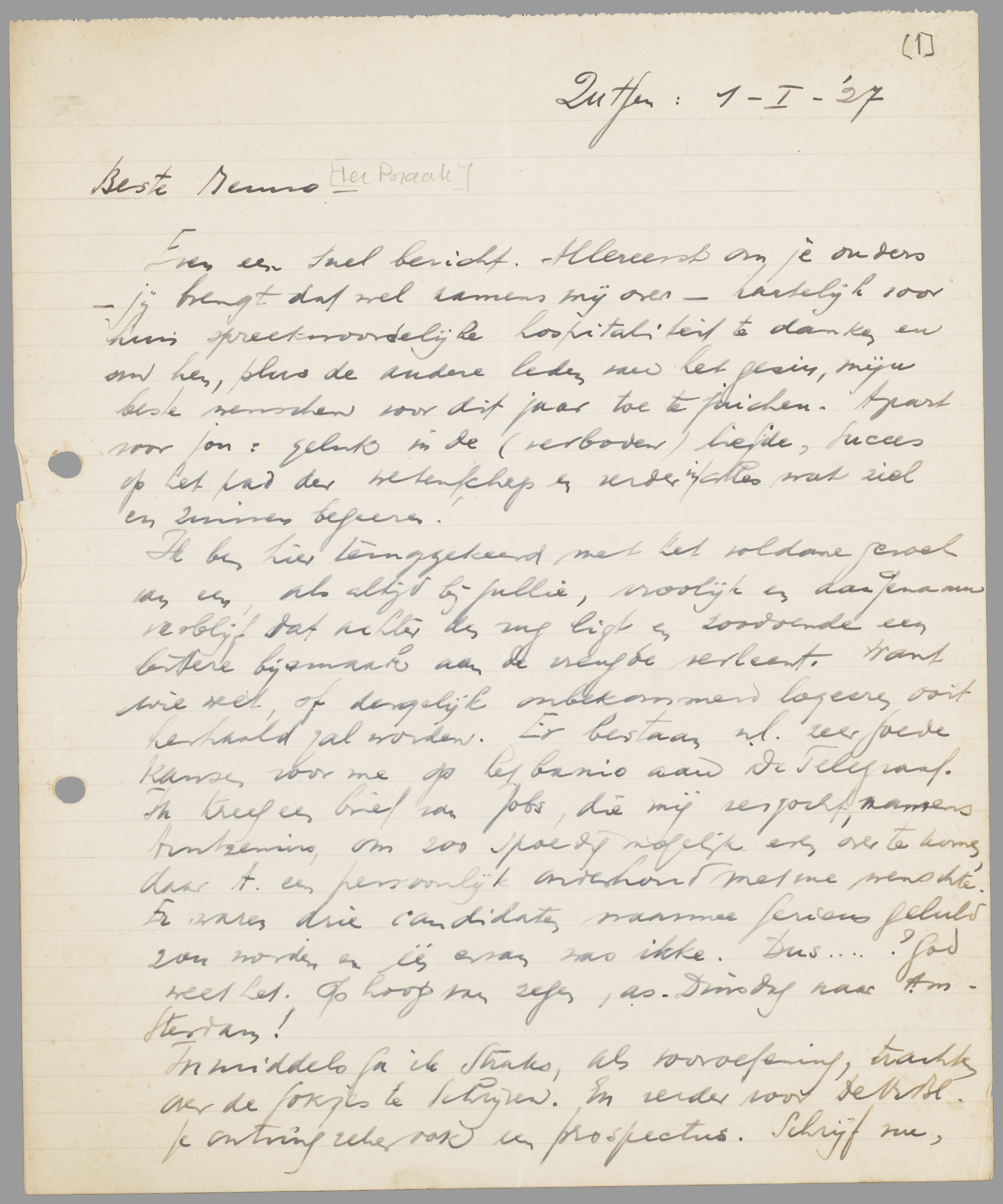 Ik ben hier teruggekeerd met het voldane gevoel van een, als altijd bij jullie, vroolijk en aangenaam verblijf dat achter den rug ligt en zoodoende een bittere bijsmaak aan de vreugde verleent. Want wie weet, of dergelijk onbekommerd logeeren ooit herhaald zal worden. Er bestaan namelijk zeer goede kansen voor me op het banio aan De Telegraaf. Ik kreeg een brief van Jobs die mij verzocht, namens Arntzenius om zoo spoedig mogelijk even over te komen, daar A. een persoonlijk onderhoud met me wenschte. Er waren drie candidaten waarmee serieus geluld zou worden en één ervan was ikke. Dus...? God weet het. Op hoop van zegen, a.s. Dinsdag naar Amsterdam!
