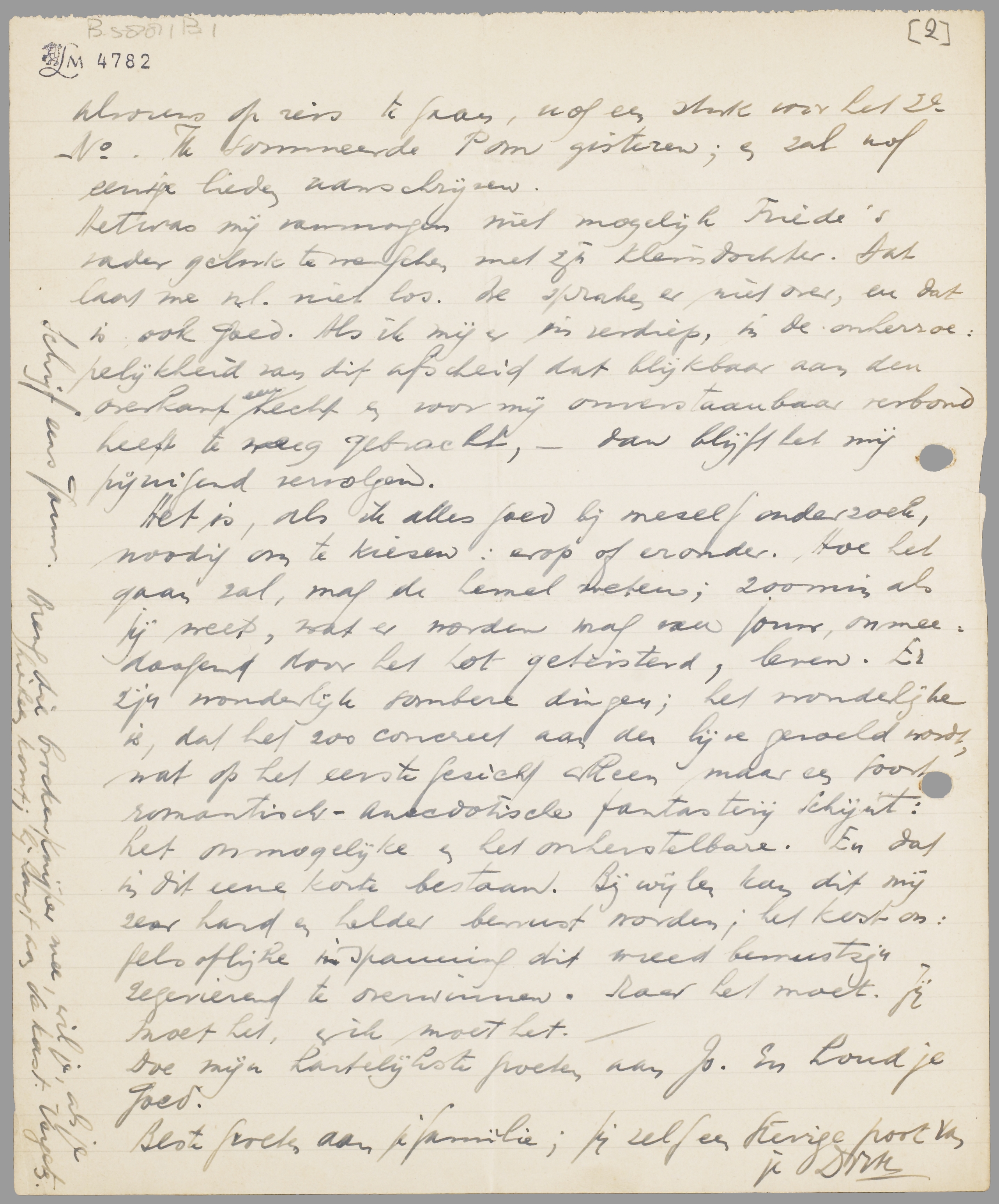 Het is, als ik alles goed bij mezelf onderzoek, noodig om te kiezen: erop of eronder. Hoe het gaan zal, mag de hemel weten; zoomin als jij weet, wat er worden mag van jouw, onmeedoogend door het lot geteisterd, leven. Er zijn wonderlijk sombere dingen; het wonderlijke is dat het zoo concreet aan den lijve gevoeld wordt, wat op het eerste gezicht alleen maar een soort romantisch-anecdotische fantasterij schijnt: het onmogelijke en het onherstelbare. En dat in dit eene korte bestaan. Bij wijlen kan dit mij zeer hard en helder bewust worden; het kost ongelooflijke inspanning dit wreed bewustzijn zegevierend te overwinnen. Maar het moet. Jij moet het, en ik moet het. -