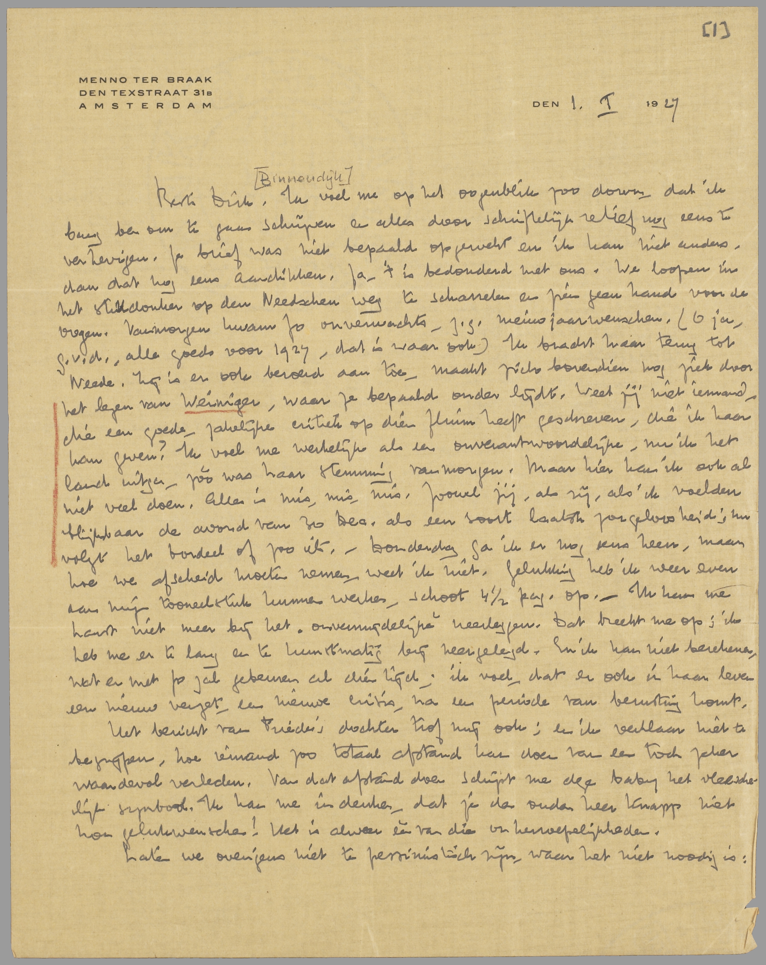 Ik voel me op het oogenblik zoo down, dat ik bang ben om te gaan schrijven en alles door schriftelijk relief nog eens te verhevigen. Je brief was niet bepaald opgewekt en ik kan niet anders, dan dat nog eens aandikken. Ja, ’t is bedonderd met ons. We loopen in het stikdonker op den Needschen weg te scharrelen en zien geen hand voor de oogen. Vanmorgen kwam Jo onverwachts, z.g. nieuwjaarwenschen. (O ja, g.v.d., alle goeds voor 1927, dat is waar ook.) Ik bracht haar terug tot Neede. Zij is er ook beroerd aan toe, maakt zich bovendien nog ziek door het lezen van Weininger, waar ze bepaald onder lijdt. Weet jij niet iemand, die een goede, zakelijke critiek op dien fluim heeft geschreven, die ik haar kan geven? Ik voel me werkelijk als een onverantwoordelijke, nu ik het land uitga, zóó was haar stemming vanmorgen. Maar hier kan ik ook al niet veel doen. Alles is mis, mis, mis. Zoowel jij, als zij, als ik voelden blijkbaar de avond van 30 Dec. als een soort laatste zorgeloosheid; nu volgt het bordeel of zoo iets. - Donderdag ga ik er nog eens heen, maar hoe we afscheid moeten nemen, weet ik niet. Gelukkig heb ik weer even aan mijn tooneelstuk kunnen werken, schoot 4½ pag. op. - Ik kan me haast niet meer bij het ‘onvermijdelijke’ neerleggen. Dat breekt me op; ik heb me er te lang en te kunstmatig bij neergelegd. En ik kan niet berekenen, wat er met Jo zal gebeuren al dien tijd; ik voel, dat er ook in haar leven een nieuw verzet, een nieuwe crisis, na een periode van berusting komt.
