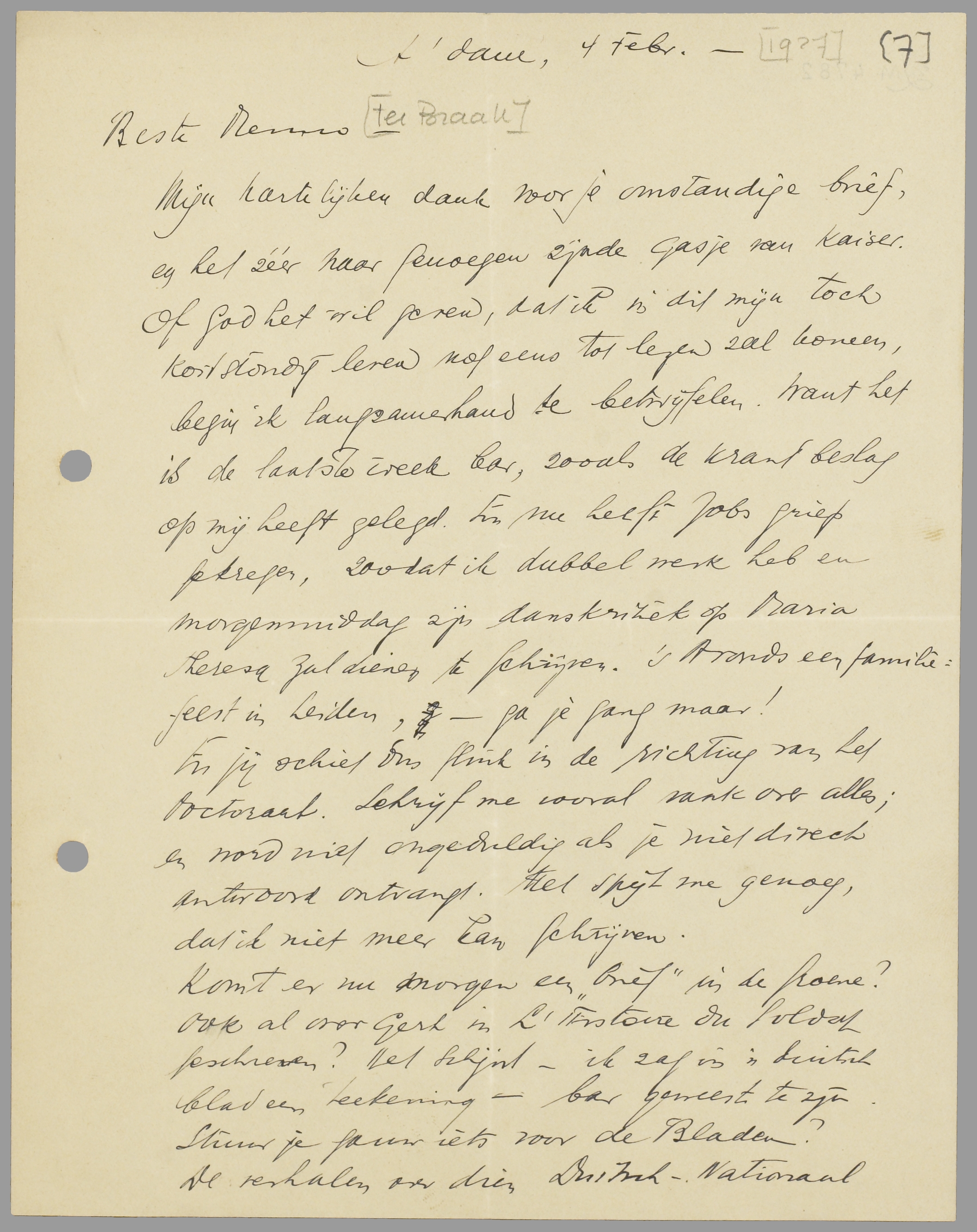 Ik stop. Ik ben moe en somber. Nog steeds niet bij Stoett geweest ook. Die vent is - geloof ik - mijn fatum; hij heeft althans een minder vroolijke invloed op mijn huidige levenstand. Ging je De Dictator van Bassermann zien? Top Naeff is er geweest. Verbeek hier is schandelijk slecht. Ik was er Zaterdag.