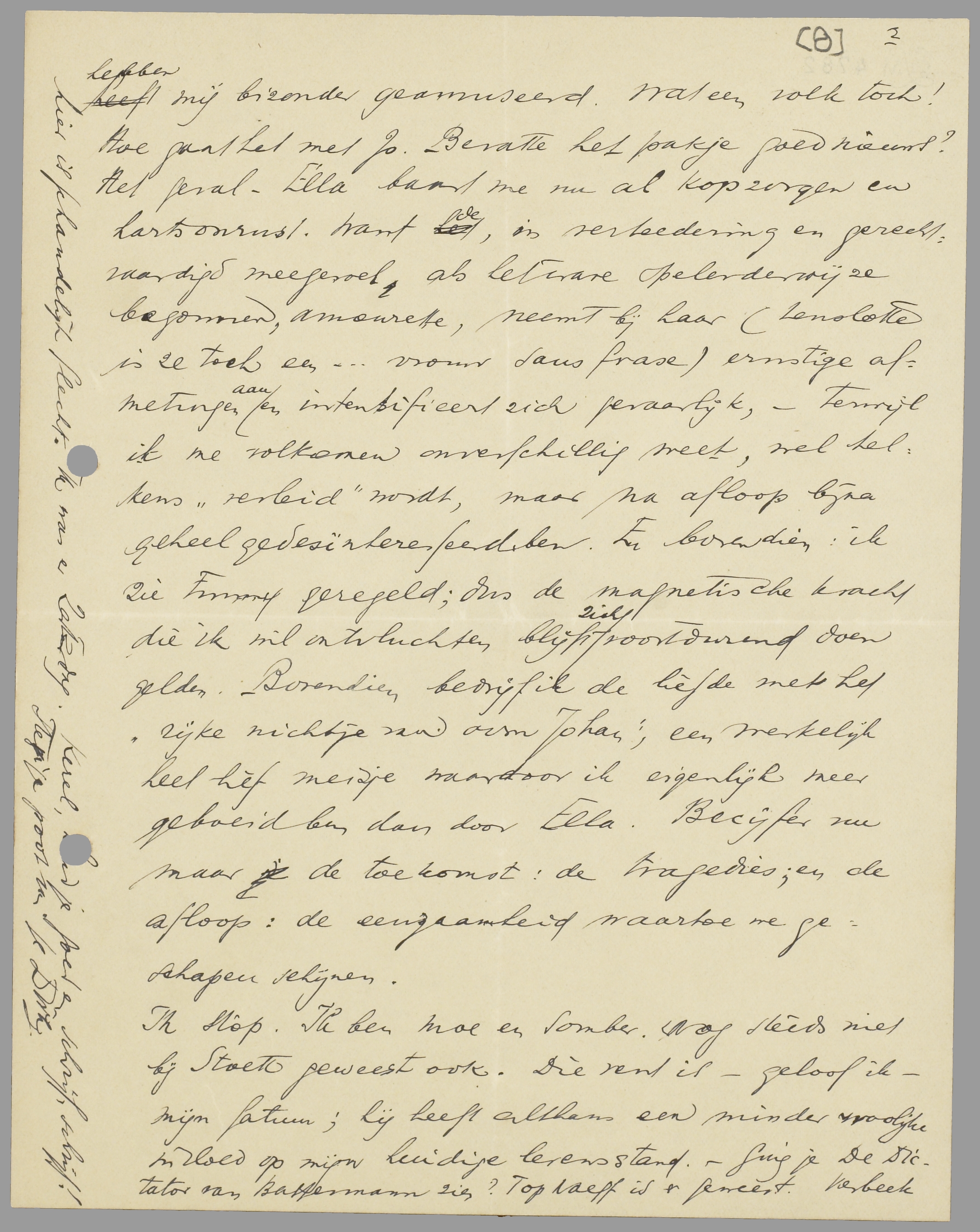 Hoe gaat het met Jo. Bevatte het pakje goed nieuws? Het geval-Ella baart me nu al kopzorgen en hartsonrust. Want de, in verteedering en gerechtvaardigd meegevoel als het ware spelenderwijze begonnen, amourette, neemt bij haar (tenslotte is ze toch een... vrouw sans frase) ernstige afmetingen aan en intensifieert zich gevaarlijk, - terwijl ik me volkomen onverschillig weet, wel telkens ‘verleid’ word, maar na afloop bijna geheel gedesinteresseerd ben. En bovendien: ik zie Emmy geregeld; dus de magnetische kracht die ik wil ontvluchten blijft zich voortdurend doen gelden. Bovendien bedrijf ik de liefde met ‘het rijke nichtje van oom Johan’, een werkelijk heel lief meisje waardoor ik eigenlijk meer geboeid ben dan door Ella. Becijfer nu maar de toekomst: de tragedies; en de afloop: de eenzaamheid waartoe we geschapen schijnen.
