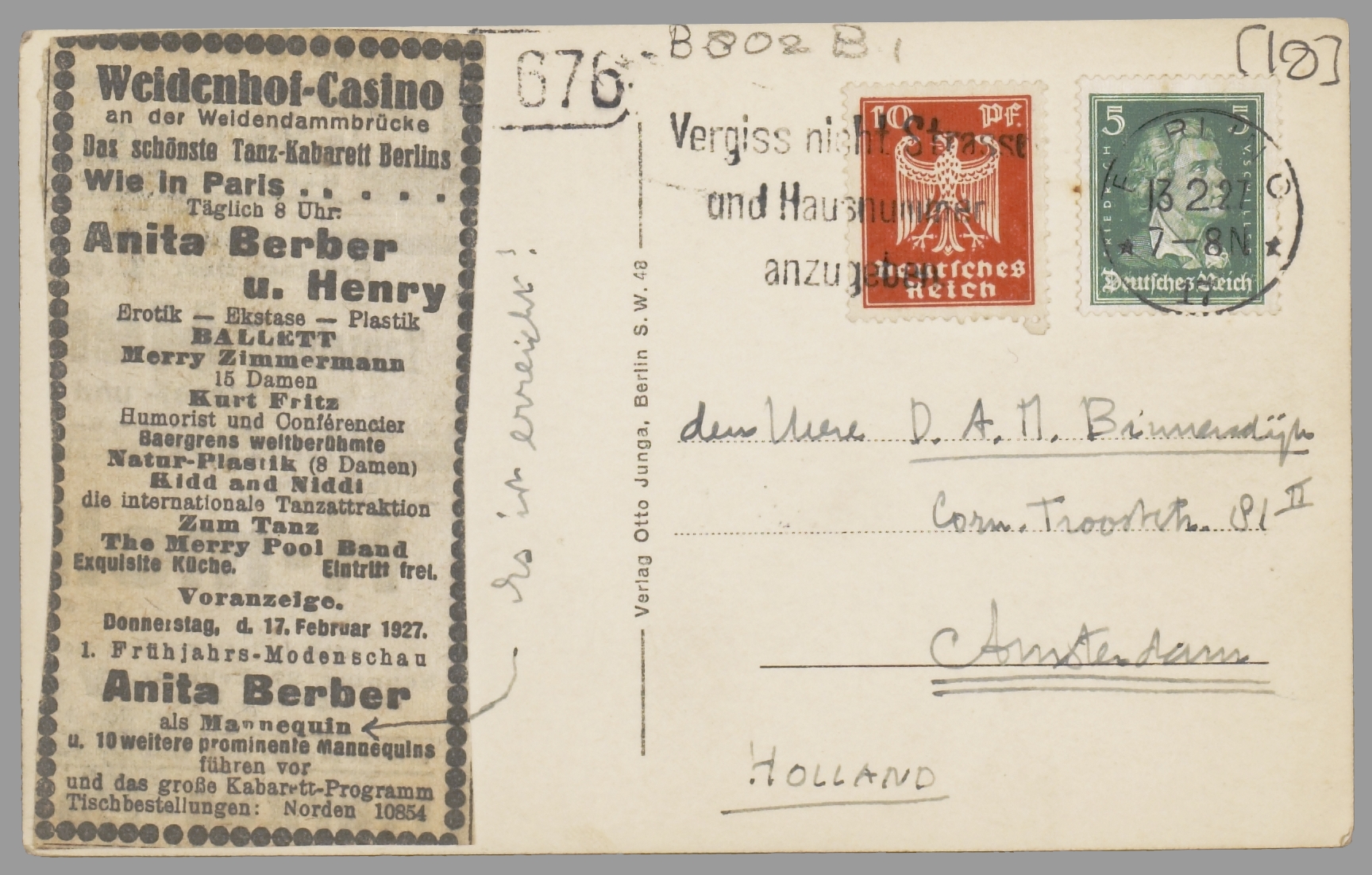 ‘[...] Voranzeige, Donnerstag d. 17 Februar 1927, 1. Frühjahrs-Modenschau, Anita Berber als Mannequin [...]’