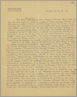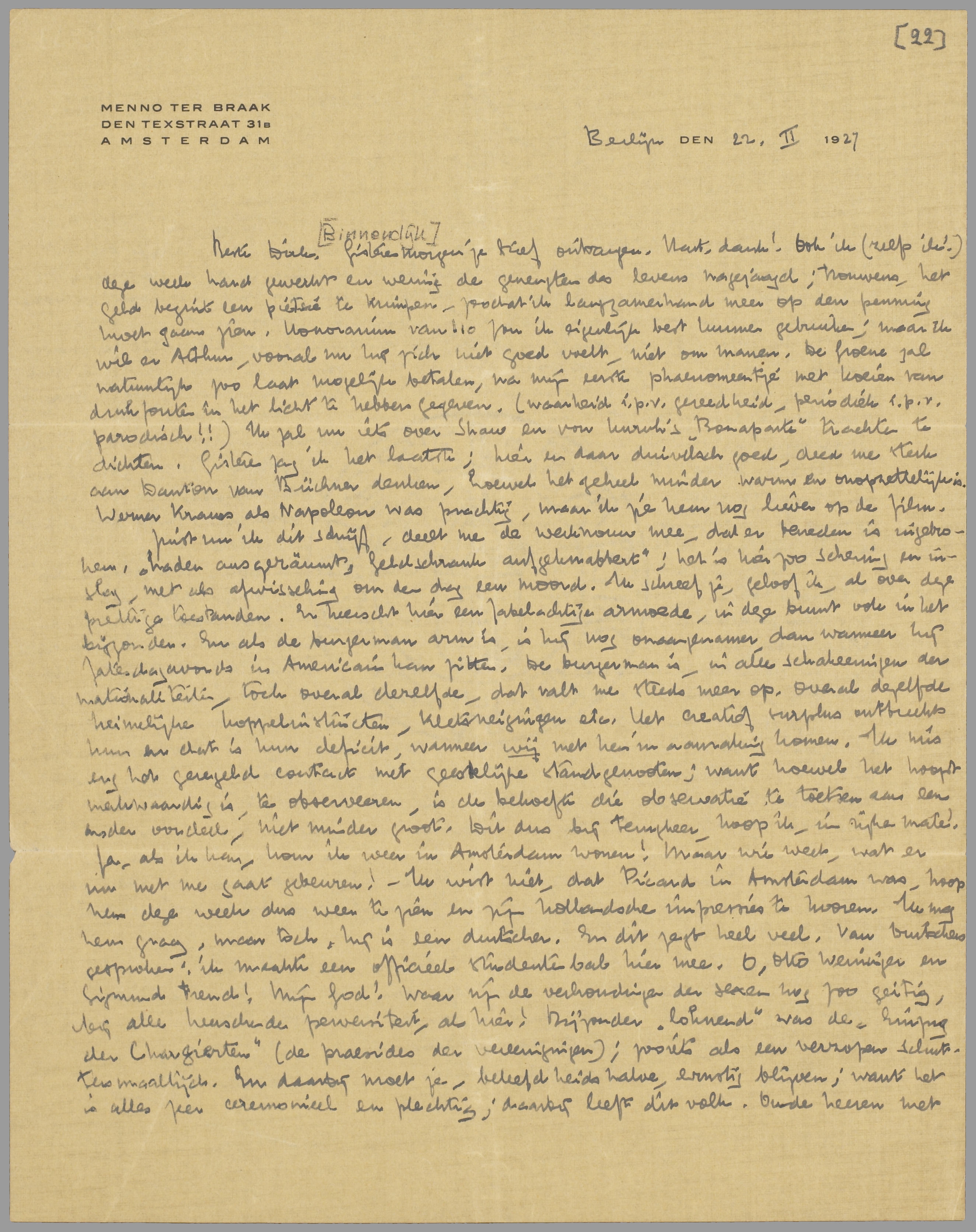 Gisterenmorgen je brief ontvangen. Hart. dank! Ook ik (zelfs ik!) heb deze week hard gewerkt en weinig de geneugten des levens nagejaagd; trouwens, het geld begint een pietsie te krimpen, zoodat ik langzamerhand meer op den penning moet gaan zien. Honorarium van I 10 zou ik eigenlijk best kunnen gebruiken; maar ik wil er Arthur, vooral nu hij zich niet goed voelt, niet om manen. De Groene zal natuurlijk zoo laat mogelijk betalen, na mijn eerste phaenomeentje met koeien van drukfouten in het licht te hebben gegeven. (Waarheid i.p.v. gereedheid, periodiek i.p.v. parodisch!!) Ik zal nu iets over Shaw en von Unruh’s ‘Bonaparte’ trachten te dichten. Gisteren zag ik het laatste; hier en daar duivelsch goed, deed me sterk aan Danton van Büchner denken, hoewel het geheel minder warm en onopzettelijk is. Werner Kraus als Napoleon was prachtig, maar ik zie hem nog liever op de film.