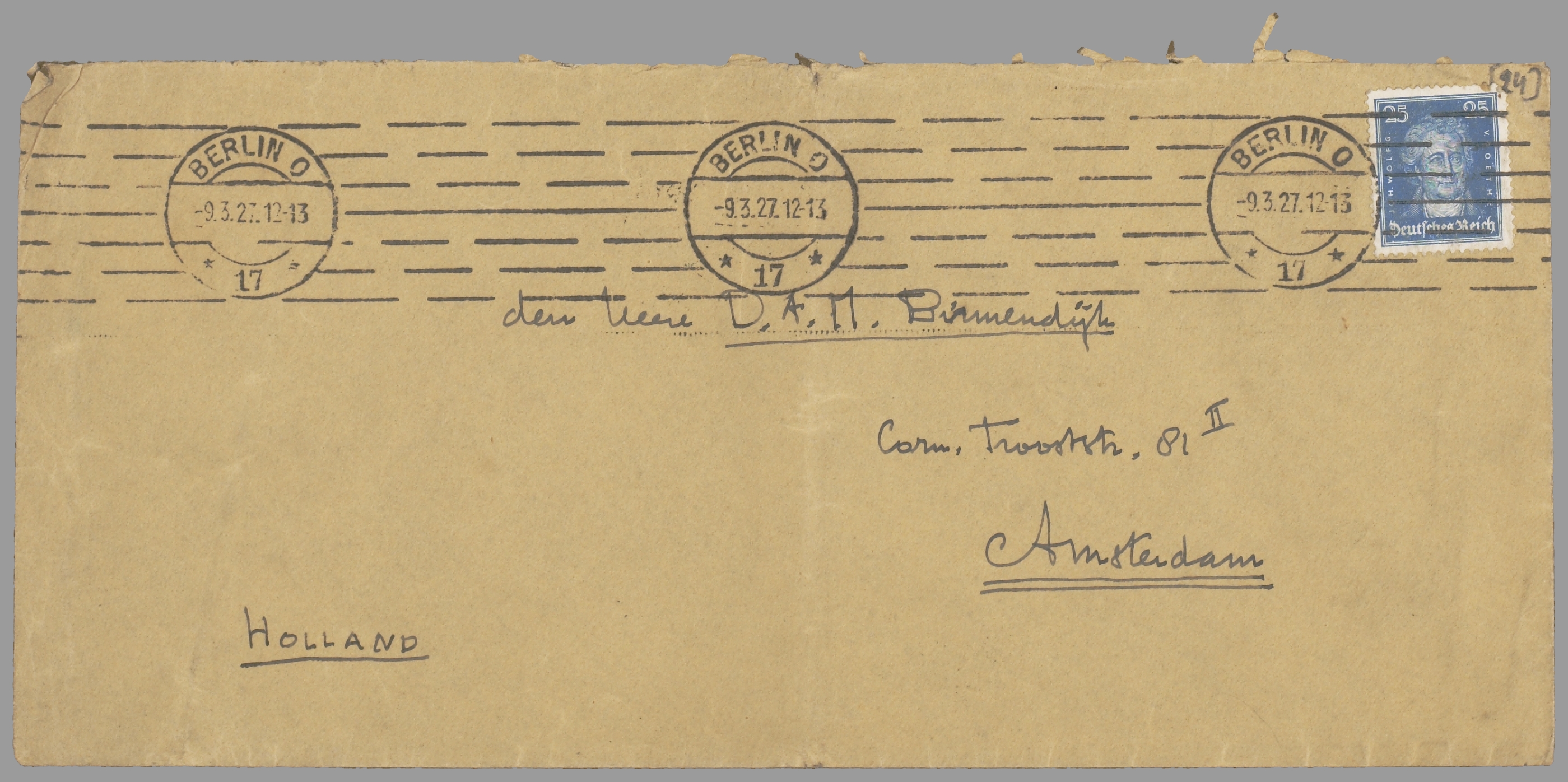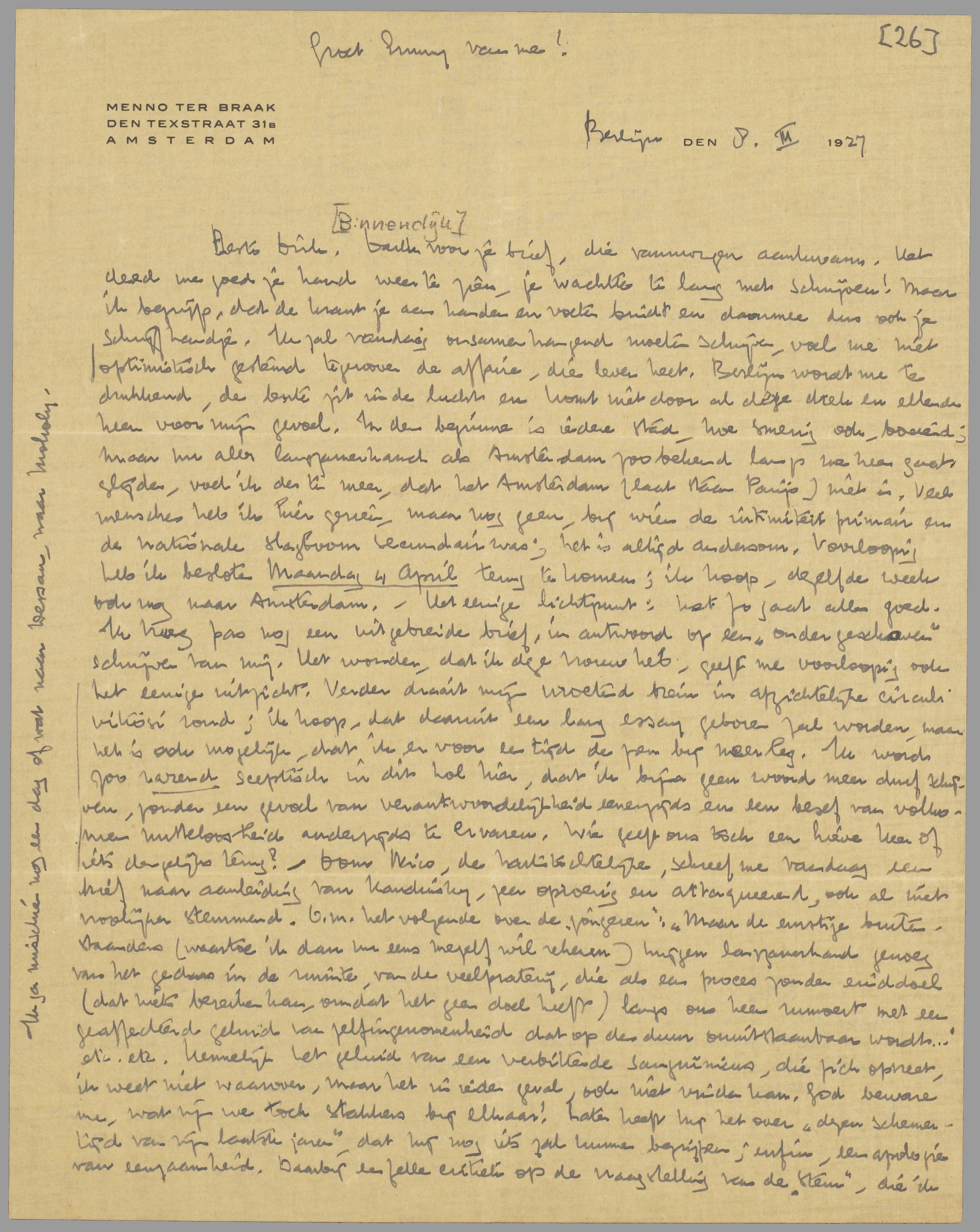 Dank voor je brief, die vanmorgen aankwam. Het deed me goed je hand weer te zien, je wachtte te lang met schrijven! Maar ik begrijp, dat de krant je aan handen en voeten bindt en daarmee dus ook je schrijfhandje. Ik zal vandaag onsamenhangend moeten schrijven, voel me niet optimistisch gestemd tegenover de affaire, die leven heet. Berlijn wordt me te drukkend, de lente zit in de lucht en komt niet door al deze drek en ellende heen voor mijn gevoel. In den beginne is iedere stad, hoe smerig ook, boeiend; maar nu alles langzamerhand als Amsterdam zoo bekend langs me heen gaat glijden, voel ik des te meer, dat het Amsterdam (laat staan Parijs) niet is. Veel menschen heb ik hier gezien, maar nog geen, bij wien de intimiteit primair en de nationale slagboom secundair was; het is altijd andersom. Voorlopig heb ik besloten Maandag 4 April terug te komen; ik hoop, dezelfde week ook nog naar Amsterdam. - Het eenige lichtpunt: met Jo gaat alles goed. Ik kreeg pas nog een uitgebreide brief, in antwoord op een ‘ondergeschoven’ schrijven van mij. Het wonder, dat ik deze vrouw heb, geeft me voorloopig ook het eenige uitzicht. Verder draait mijn wroetend brein in afzichtelijke circuli vitiosi rond; ik hoop, dat daaruit een lang essay geboren zal worden, maar het is ook mogelijk, dat ik er voor een tijd de pen bij neerleg. Ik word zoo razend sceptisch in dit hol hier, dat ik bijna geen woord meer durf schrijven, zonder een gevoel van verantwoordelijkheid eenerzijds en een besef van volkomen nutteloosheid anderzijds te ervaren. Wie geeft ons toch een Lieve Heer of iets dergelijks terug? - Oom Nico, de hartstochtelijke, schreef me vandaag een brief naar aanleiding van Kandinsky, zeer oproerig en attaqueerend, ook al niet vroolijker stemmend. O.m. het volgende over de ‘jongeren’: ‘Maar de ernstige buitenstaanders (waartoe ik dan nu eens mezelf wil rekenen) krijgen langzamerhand genoeg van het gedaas in de ruimte, van de veelpraterij, die als een proces zonder einddoel (dat niets bereiken kan, omdat het geen doel heeft) langs ons heen rumoert met een geaffecteerd geluid van zelfingenomenheid dat op den duur onuitstaanbaar wordt...’ etc. etc. Kennelijk het geluid van een verbitterde sanguïnicus, die zich opvreet, ik weet niet waarover, maar het in ieder geval, ook niet vinden kan. God beware me, wat zijn we toch stakkers bij elkaar! Later heeft hij het over ‘dezen schemertijd van zijn laatste jaren’, dat hij nog iets zal kunnen begrijpen; enfin, een apologie van eenzaamheid. Daarbij een felle critiek op de vraagstelling van de ‘Stem’, die ik ook idioot vind en nog steeds niet beantwoord heb.