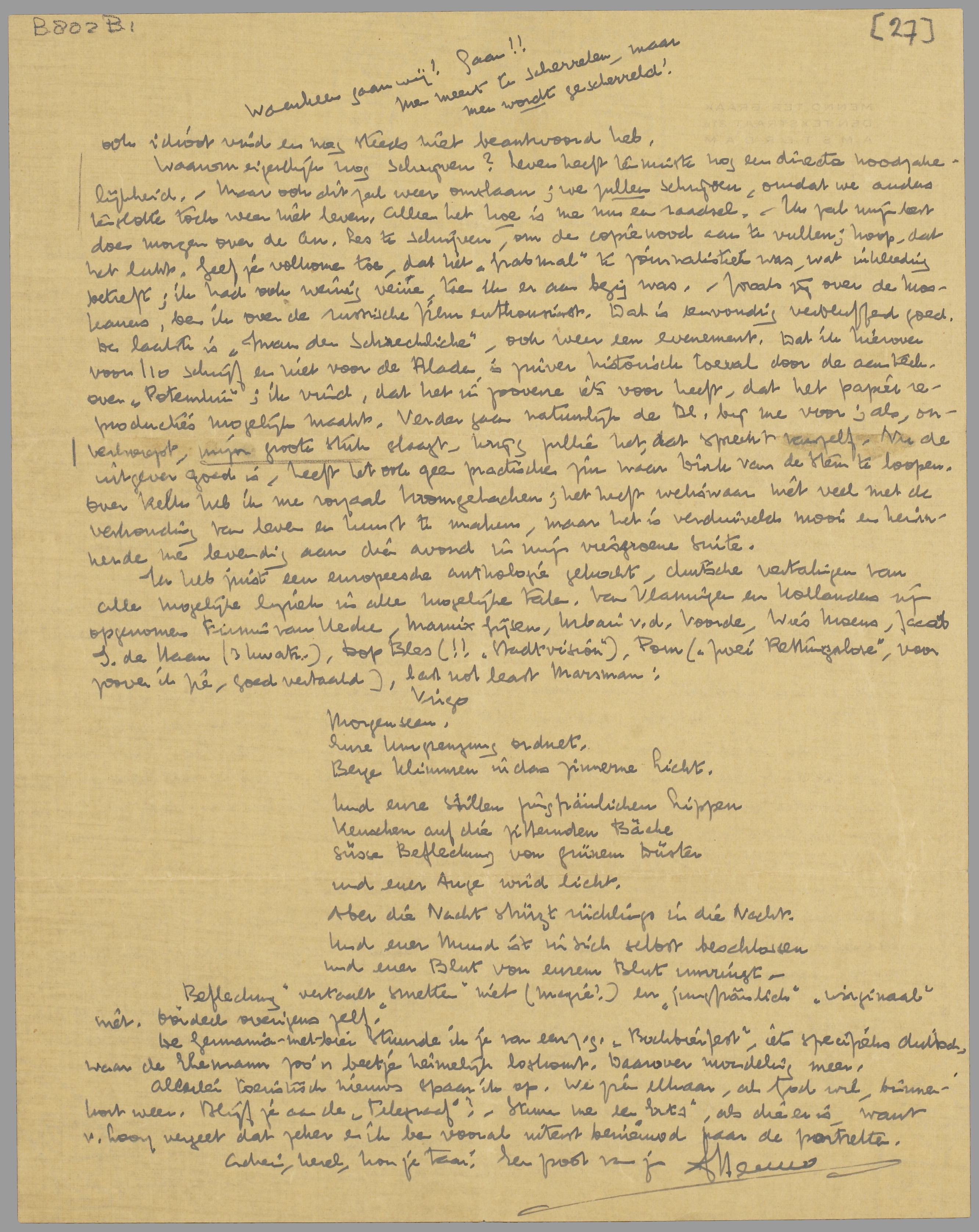 Ik heb juist een europeesche anthologie gekocht, duitsche vertalingen van alle mogelijke lyriek in alle mogelijke talen. Van Vlamingen en Hollanders zijn opgenomen Firmin van Hecke, Marnix Gijsen, Urbain v.d. Voorde, Wies Moens, Jacob I. de Haan (3 kwatr.), Dop Bles (!! ‘Stadtvision’), Pom (‘Zwei Rettungslose’, voor zoover ik zie, goed vertaald), last not least Marsman!: