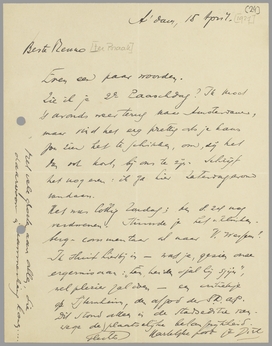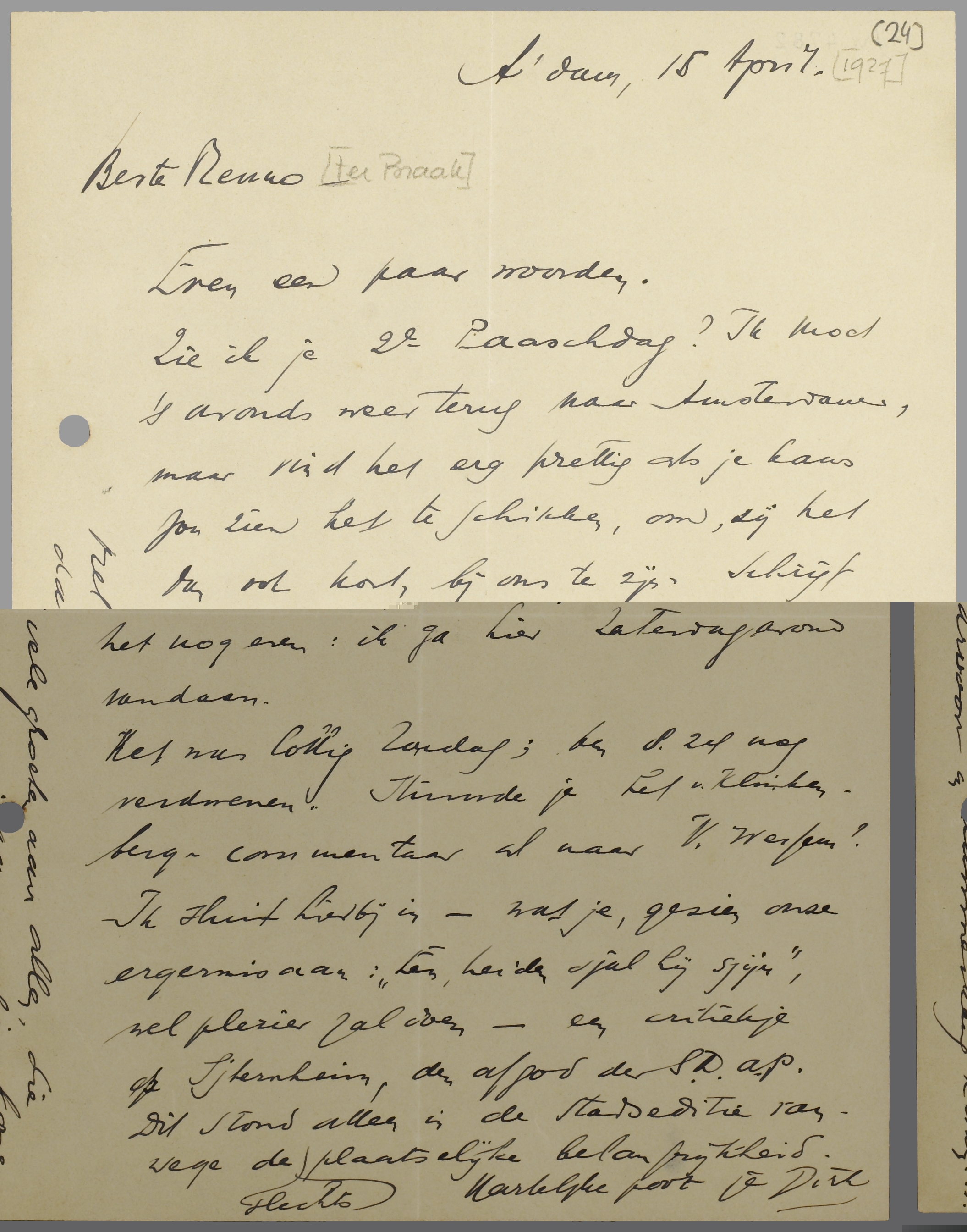 Zie ik je 2e Paasdag? Ik moet 's avonds weer terug naar Amsterdam, maar vind het erg prettig als je kans zou zien het te schikken, om, zij het dan ook kort, bij ons te zijn. Schrijf het nog even: ik ga hier Zaterdagavond vandaan.