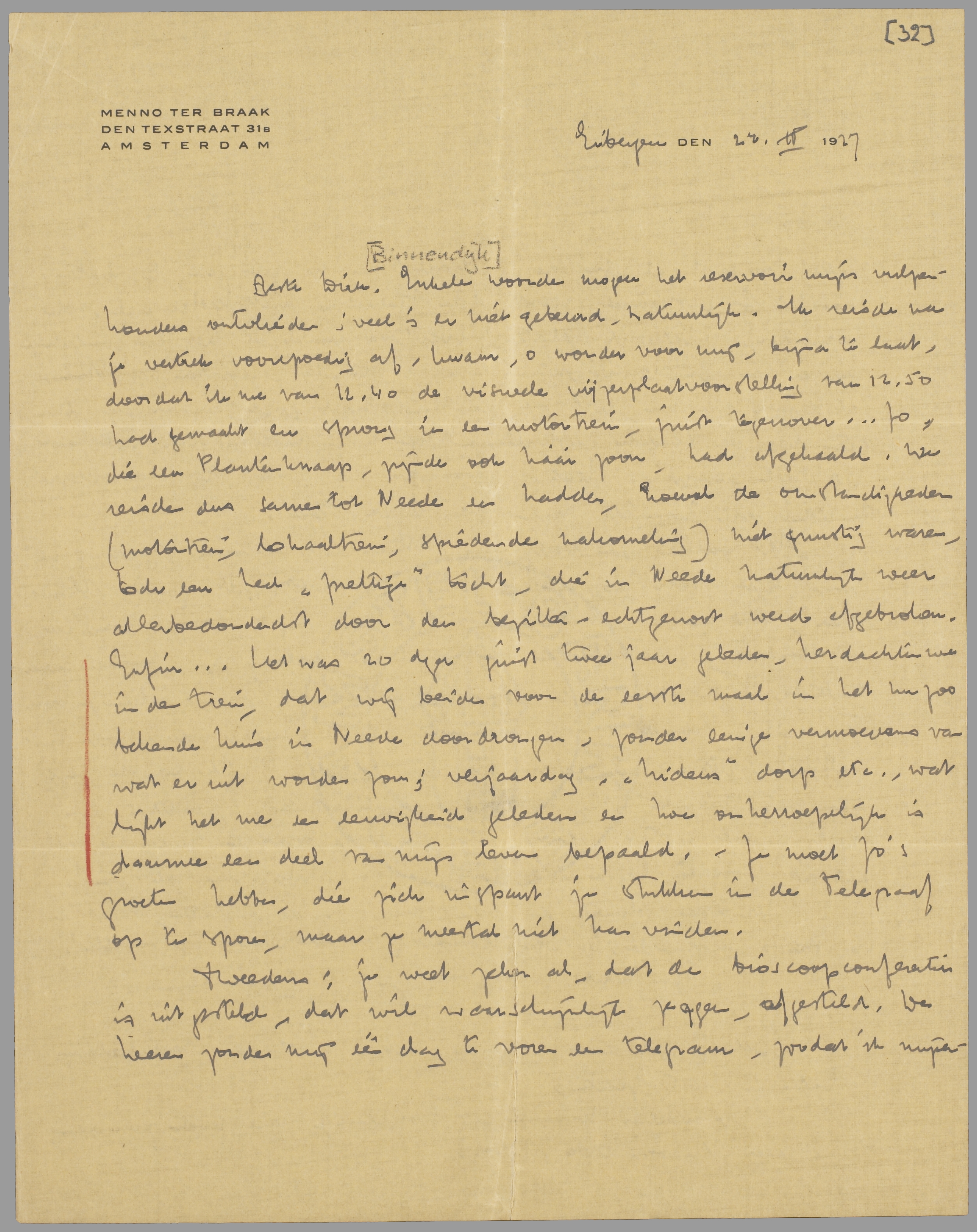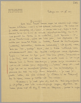 Enkele woorden mogen het reservoir mijns vulpenhouders ontvlieden; veel is er niet gebeurd, natuurlijk. Ik reisde na je vertrek voorspoedig af, kwam, o wonder voor mij, bijna te laat, doordat ik me van 12.40 de visuele wijzerplaatvoorstelling van 12.50 had gemaakt en sprong in een motortrein, juist tegenover... Jo, die een Plantenknaap, zijnde ook háár zoon, had afgehaald. We reisden dus samen tot Neede en hadden, hoewel de omstandigheden (motortrein, lokaaltrein, spiedende nakomeling) niet gunstig waren, toch een heel ‘prettige’ tocht, die in Neede natuurlijk weer allerbedonderdst door den bezitter-echtgenoot werd afgebroken. Enfin... Het was 20 dezer juist twee jaar geleden, herdachten we in den trein, dat wij beiden voor den eersten maal in het nu zoo bekende huis in Neede doordrongen, zonder eenige vermoedens van wat er uit worden zou; verjaardag, ‘hideus’ dorp etc., wat lijkt het me een eeuwigheid geleden en hoe onherroepelijk is daarmee een deel van mijn leven bepaald. - Je moet Jo’s groeten hebben, die zich inspant je stukken in de Telegraaf op te sporen, maar ze meestal niet kan vinden.