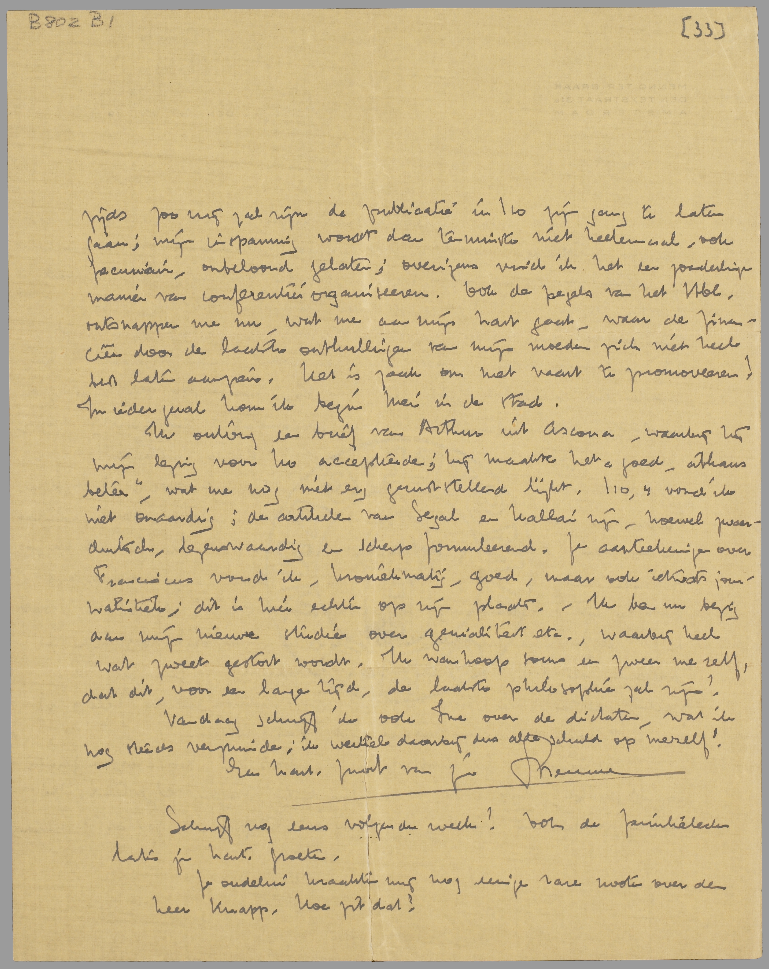 Ik ontving een brief van Arthur uit Ascona, waarbij hij mijn lezing voor I 10 accepteerde; hij maakte het ‘goed, althans beter’, wat me nog niet erg geruststellend lijkt. I 10, 4 vond ik niet onaardig: de artikelen van Segal en Kallai zijn, hoewel zwaarduitsch, lezenswaardig en scherp formuleerend. Je aanteekeningen over Franciscus vond ik, kroniekmatig, goed, maar ook ietwat journalistiek; dit is hier echter op zijn plaats. - Ik ben nu bezig aan mijn nieuwe studie over genialiteit etc., waarbij heel wat zweet gestort wordt. Ik wanhoop soms en zweer me zelf, dat dit, voor een lange tijd, de laatste philosophie zal zijn!
