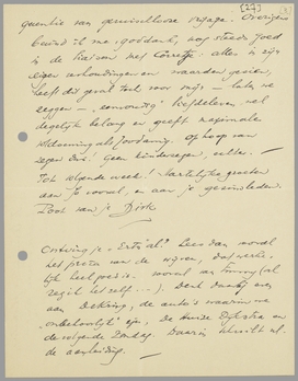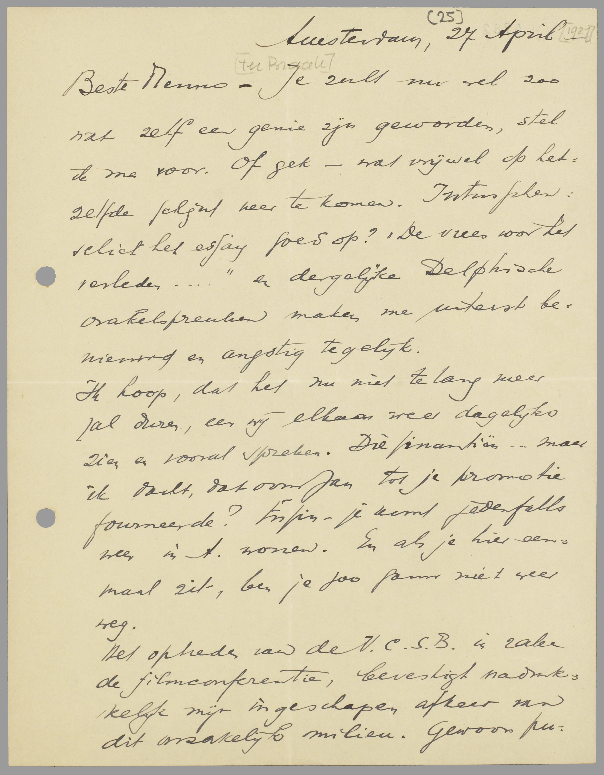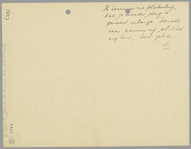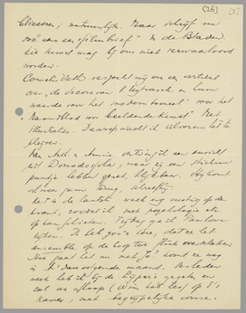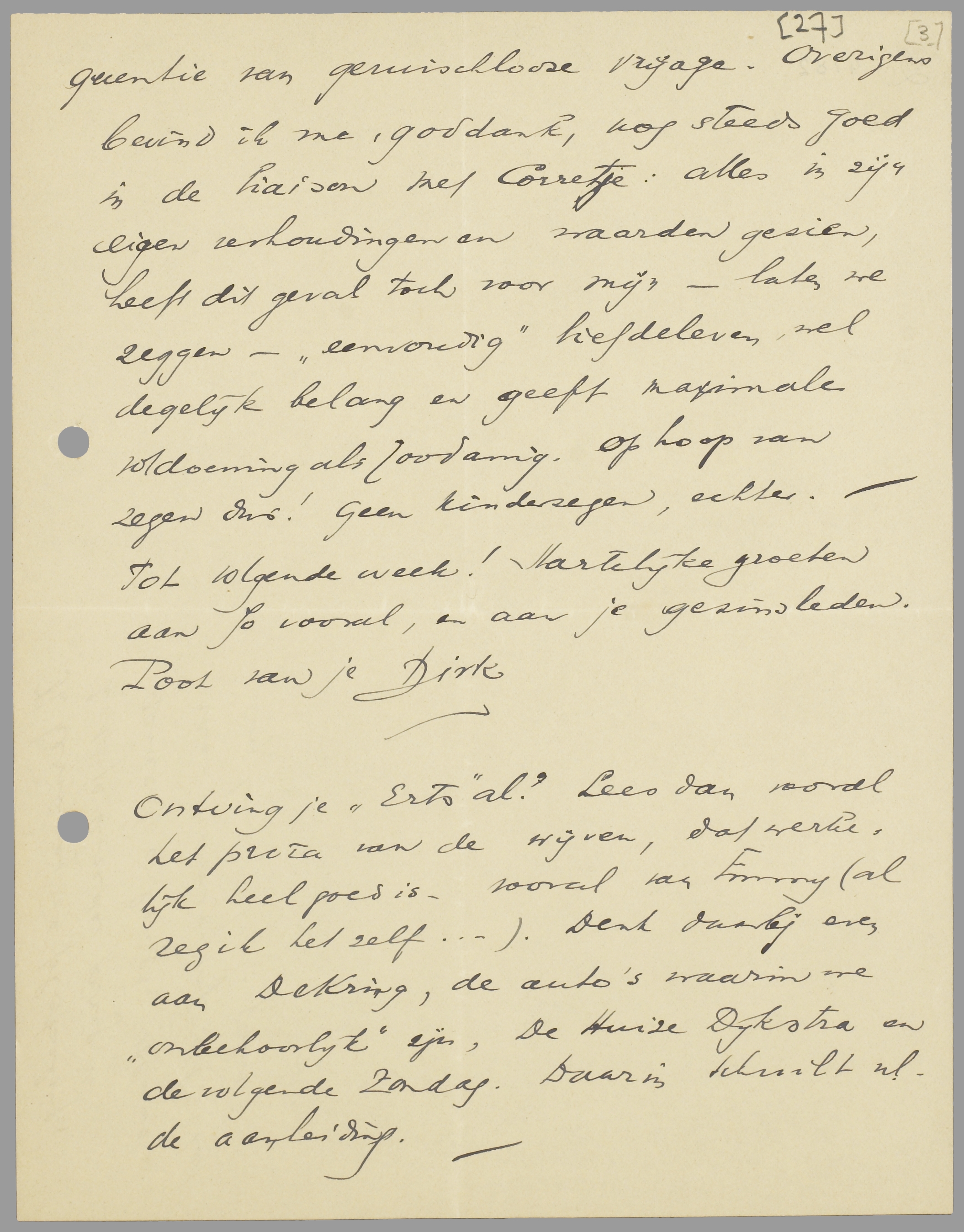 Het is de laatste week erg rustig op de krant, zoodat ik met psychologie etc. op kan schieten. Vrijdag ga ik Pawlowa kijken. Ik heb zoo'n idee, dat ze het ensemble op de koop toe flink overschatten. Hoe gaat het nu met Jo? komt ze nog in A'dam volgende maand. Verleden week heb ik bij de Pijper's gegeten en zat na afloop (Wim had les) op E's kamer, met begrijpelijke consequentie van geruischlooze vrijage. Overigens bevind ik me, goddank, nog steeds goed in de liaison met Corretje: alles in zijn eigen verhoudingen en waarden gezien, heeft dit geval toch voor mijn - laten we zeggen - ‘eenvoudig’ liefdeleven, wel degelijk belang en geeft maximale voldoening als zoodanig. Op hoop van zegen dus! Geen kinderzegen, echter. -