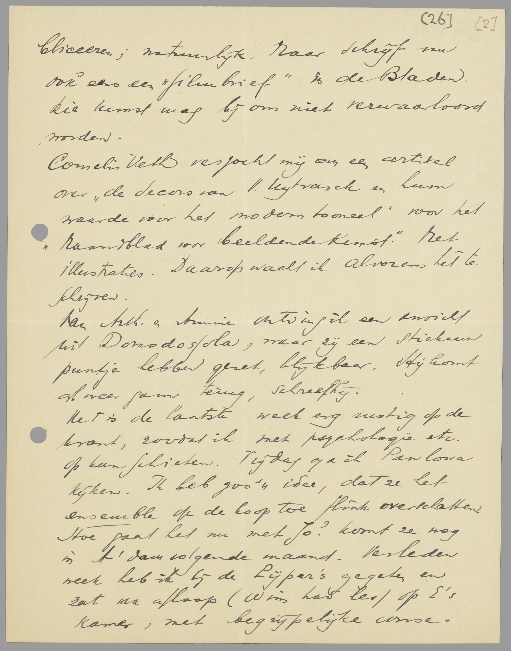 Cornelis Veth verzocht mij om een artikel over ‘de decors van V. Uytvanck en hun waarde voor het modern tooneel’ voor het ‘Maandblad voor beeldende Kunst’. Met illustraties. Daarop wacht ik alvorens het te schrijven.