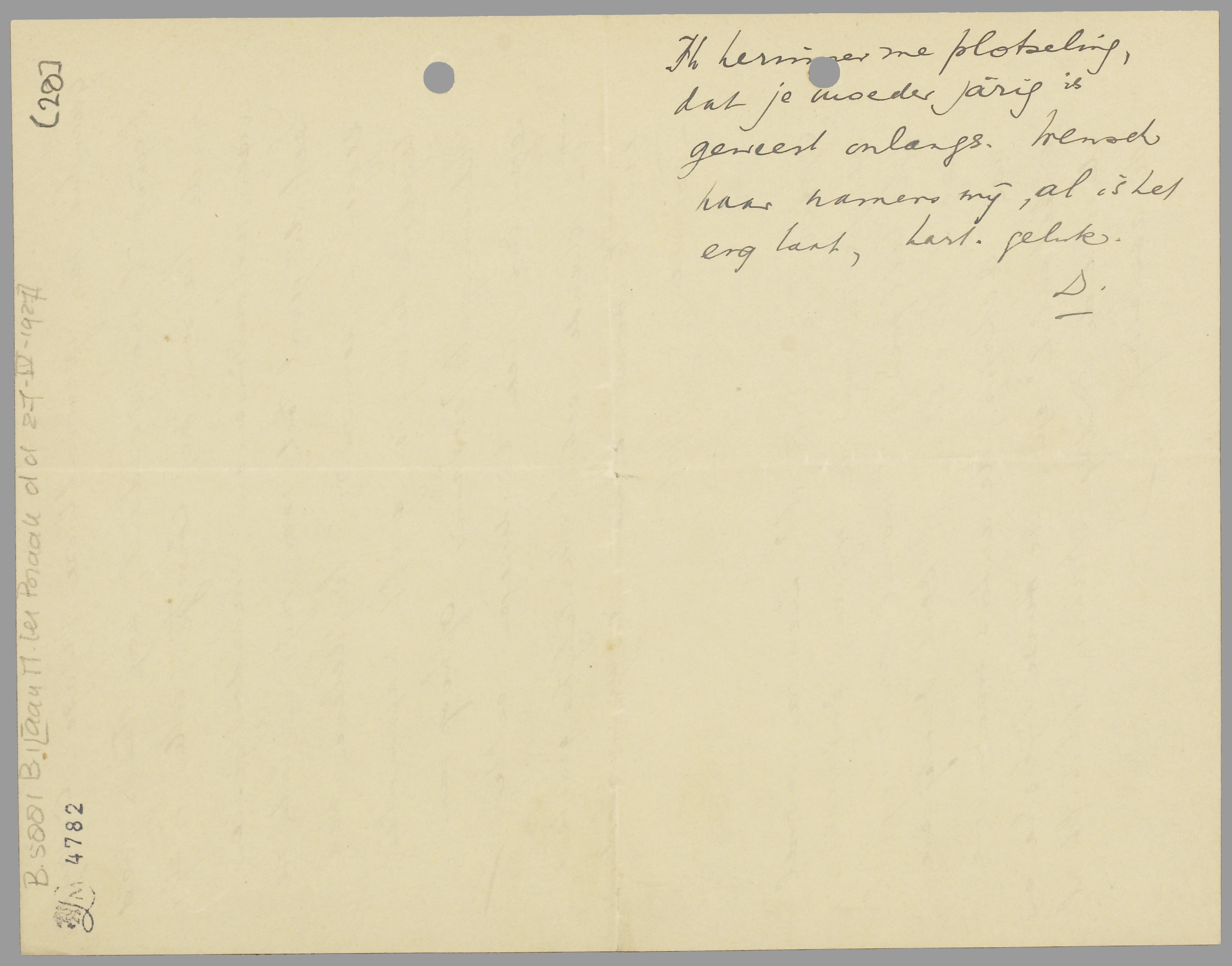 Ik herinner me plotseling, dat je moeder jarig is geweest onlangs. Wensch haar namens mij, al is het erg laat, hart. geluk. D.