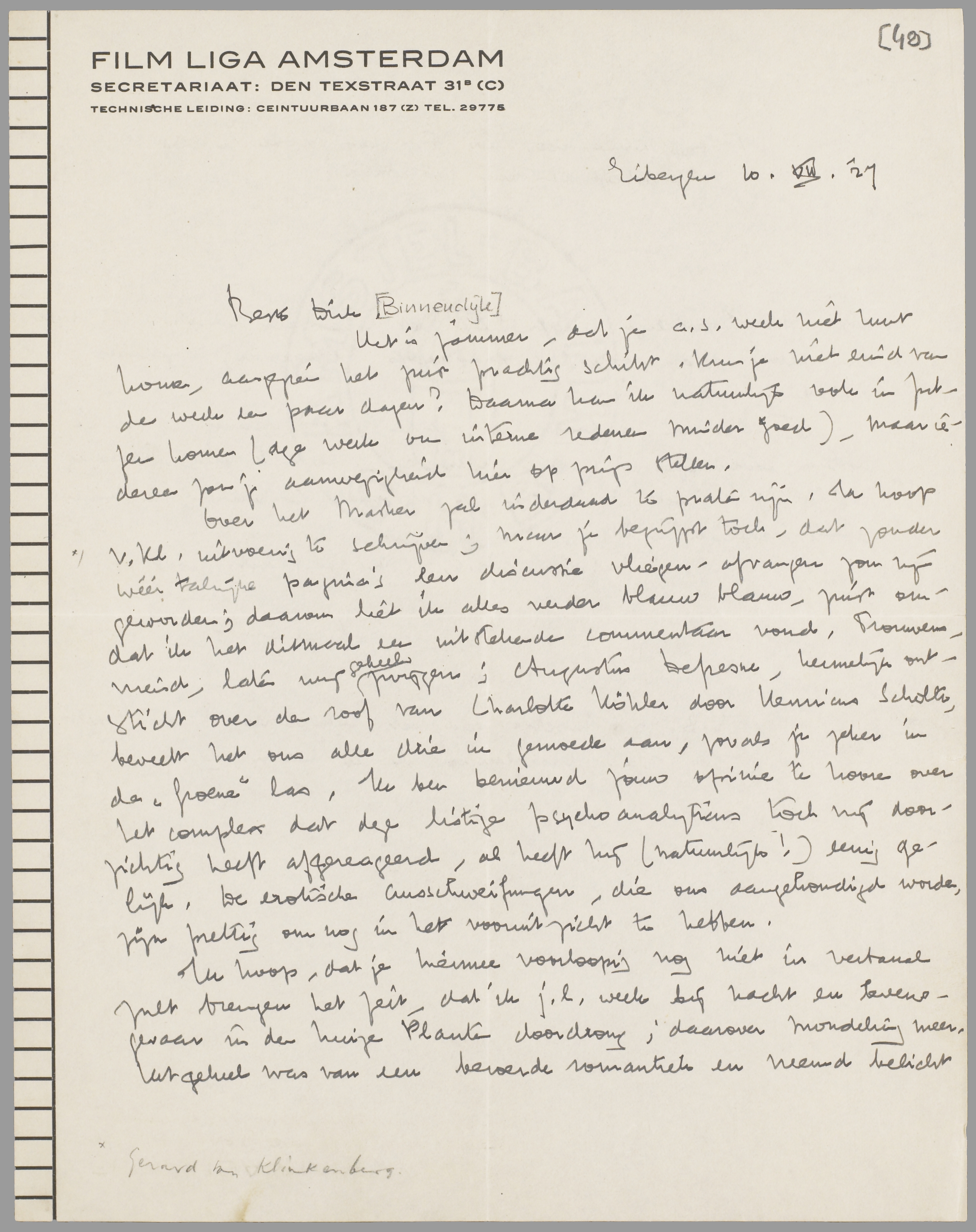 Over het Masker zal inderdaad te praten zijn. Ik hoop v. Kl. uitvoerig te schrijven; maar je begrijpt toch, dat zonder wéér talrijke pagina's een discussie vliegen-afvangen zou zijn geworden; daarom liet ik alles verder blauw blauw, juist omdat ik het ditmaal een uitstekende commentaar vond. Trouwens, vriend, laten wij geheel zwijgen; Augustus Defresne, heimelijk ontsticht over den roof van Charlotte Köhler door Henricus Scholte, beveelt het ons alle drie in gemoede aan, zooals je zeker in de ‘Groene’ las. Ik ben benieuwd jouw opinie te hooren over het complex dat deze listige psychoanalyticus toch vrij doorzichtig heeft afgereageerd, al heeft hij (natuurlijk!) eenig gelijk. De erotische Ausschweifungen, die ons aangekondigd worden, zijn prettig om nog in het vooruitzicht te hebben.