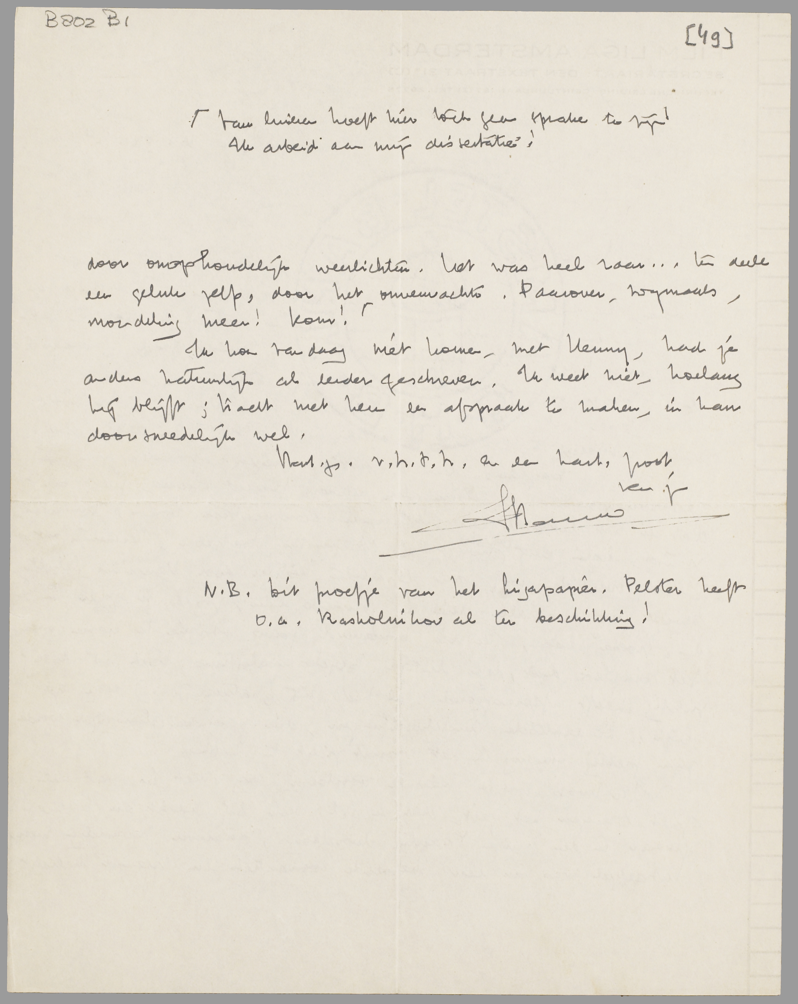 Ik kon vandaag niet komen, met Henny, had je anders natuurlijk al eerder geschreven. Ik weet niet, hoelang hij blijft; tracht met hem een afspraak te maken, ik kan doorsneedelijk wel.