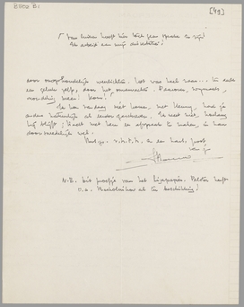 Ik hoop, dat je hiermee voorloopig nog niet in verband zult brengen het feit, dat ik j.l. week bij nacht en levensgevaar in den huize Planten doordrong; daarover mondeling meer. Het geheel was van een beroerde romantiek en vreemd belicht door onophoudelijk weerlichten. Het was heel raar... ten deele een geluk zelfs, door het onverwachte. Daarover, nogmaals, mondeling meer! Kom! Van luieren hoeft hier toch geen sprake te zijn! Ik arbeid aan mijn dissertatie!