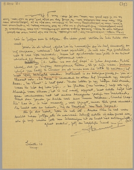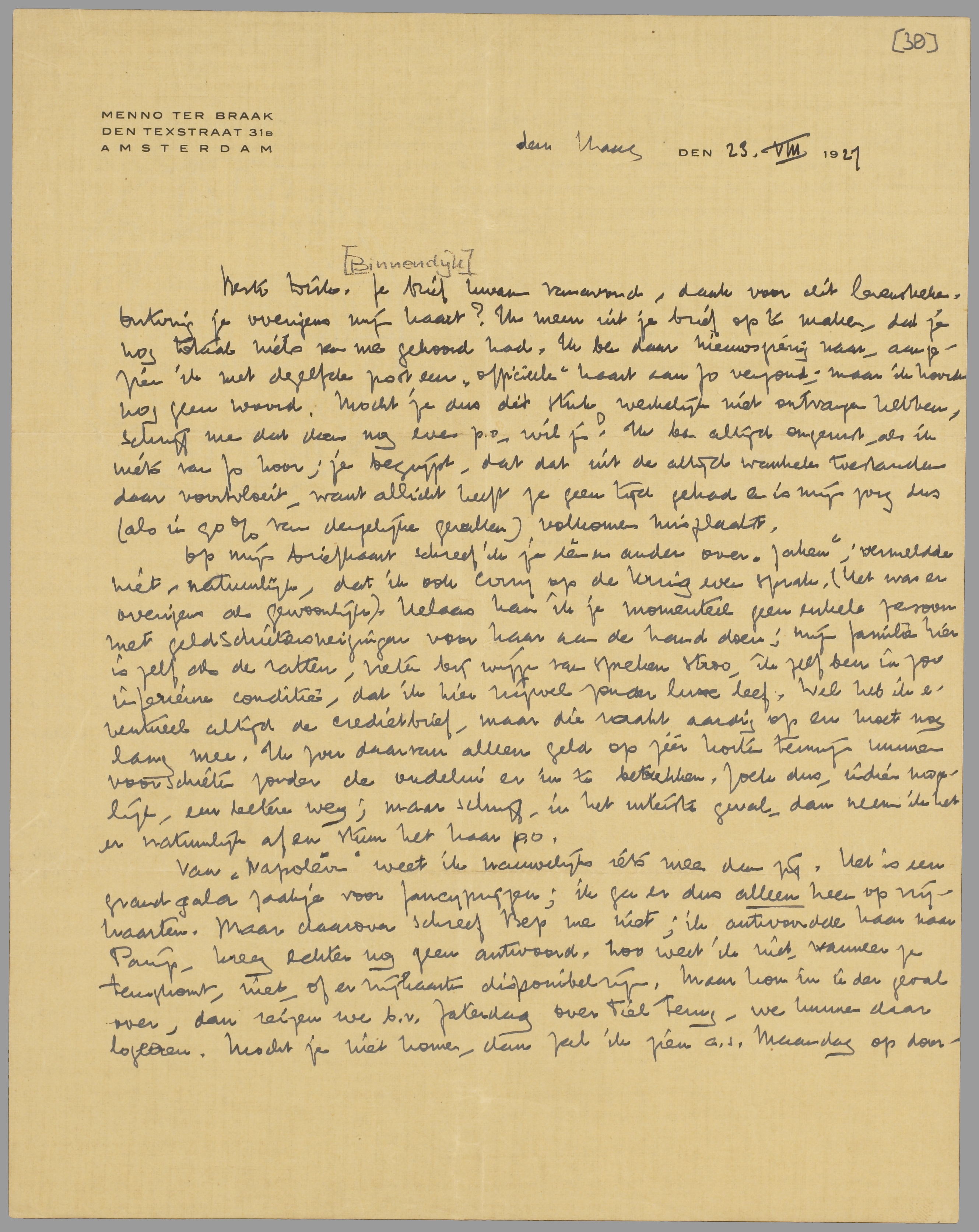 Van ‘Napoleon’ weet ik nauwelijks iets meer dan jij. Het is een grand gala zaakje voor fancyprijzen; ik ga er dus alleen heen op vrijkaarten. Maar daarover schreef Bep me niet; ik antwoordde haar naar Parijs, kreeg echter nog geen antwoord. Zoo weet ik niet, wanneer ze terugkomt, niet, of er vrijkaarten disponibel zijn. Maar kom in ieder geval over, dan reizen we b.v. Zaterdag over Tiel terug, we kunnen daar logeeren. Mocht je niet komen, dan zal ik zien a.s. Maandag op doorreis in Zutfen over te blijven. In ieder geval vertrek ik hier einde der week.
