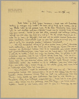 Juist bericht van Bep; geen vrijkaarten. Ik kan dus niet gaan, want ben geheel platzak, moet nog reizen. Bovendien dringend bericht uit Amsterdam, om daar Vrijdagavond te gaan proefdraaien. Mijn gedragslijn is nu deze: ik laat Kurhaus loopen, ga Vrijdagavond naar A'dam, waar ik Zaterdagmiddag 2 uur nog in American moet zijn en ga Zaterdagsavonds naar Tiel. Kom daar dan eventueel ook. Ik schrijf Bep met gelijke post, dat ik niet kom. Laat me nu in ieder geval even hooren, wat jij doet.
