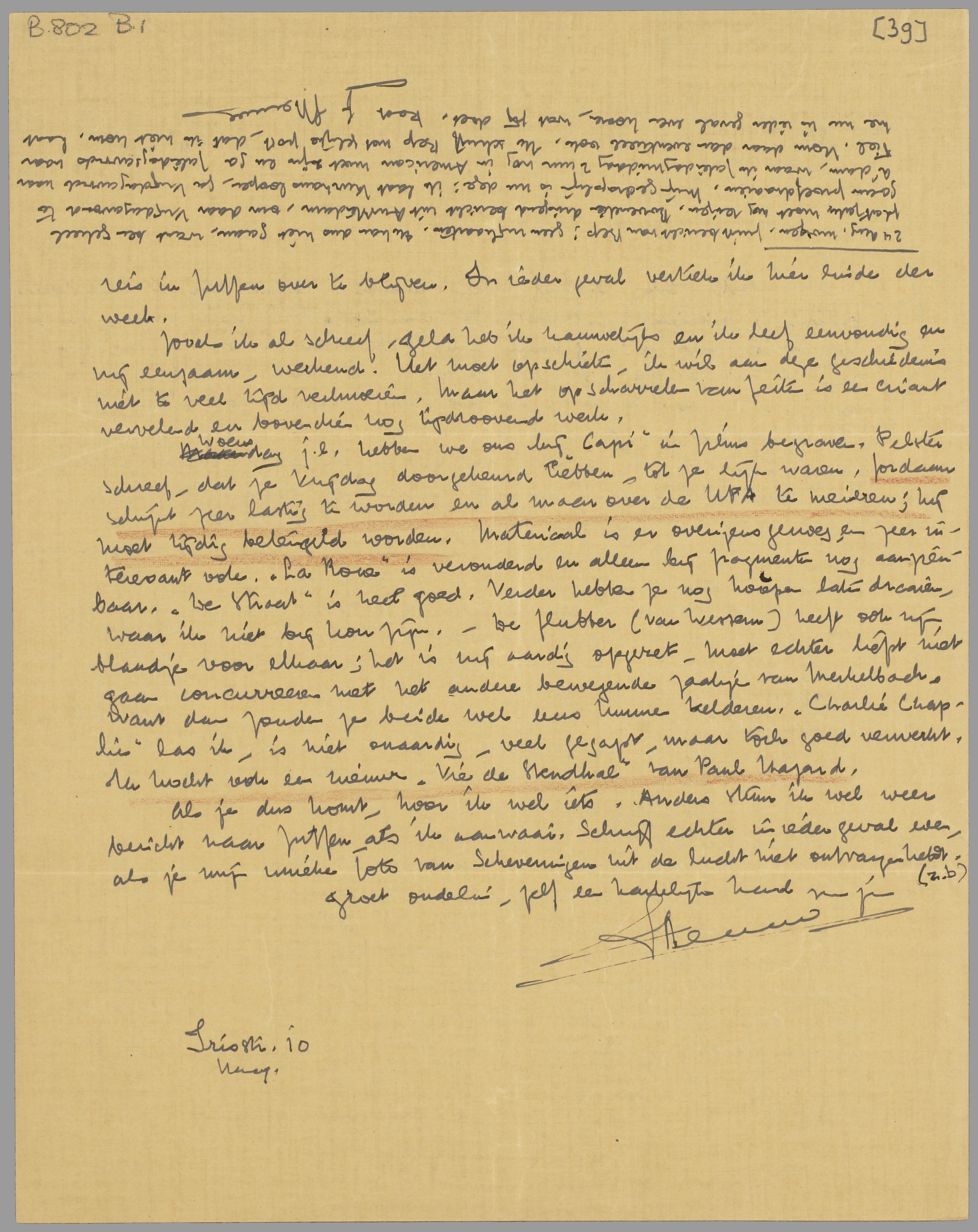 Woensdag j.l. hebben we ons bij ‘Capi’ in films begraven. Pelster schreef, dat ze Vrijdag doorgekeurd hebben, tot ze lijk waren. Jordaan schijnt zeer lastig te worden en al maar over de UFA te meieren; hij moet tijdig beteugeld worden. Materiaal is er overigens genoeg, en zeer interessant ook. ‘La Roue’ is verouderd en alleen bij fragmenten nog aanzienbaar. ‘De Straat’ is heel goed. Verder hebben ze nog hoopen laten draaien, waar ik niet bij kon zijn. - De flubber (van Wessem) heeft ook zijn blaadje voor elkaar; het is vrij aardig opgezet, moet echter liefst niet gaan concurreeren met het andere bewegende zaakje van Merkelbach, want dan zouden ze beide wel eens kunnen kelderen. ‘Charlie Chaplin’ las ik, is niet onaardig, veel gegapt, maar toch goed verwerkt. Ik kocht ook een nieuwe ‘Vie de Stendhal’ van Paul Hazard.