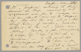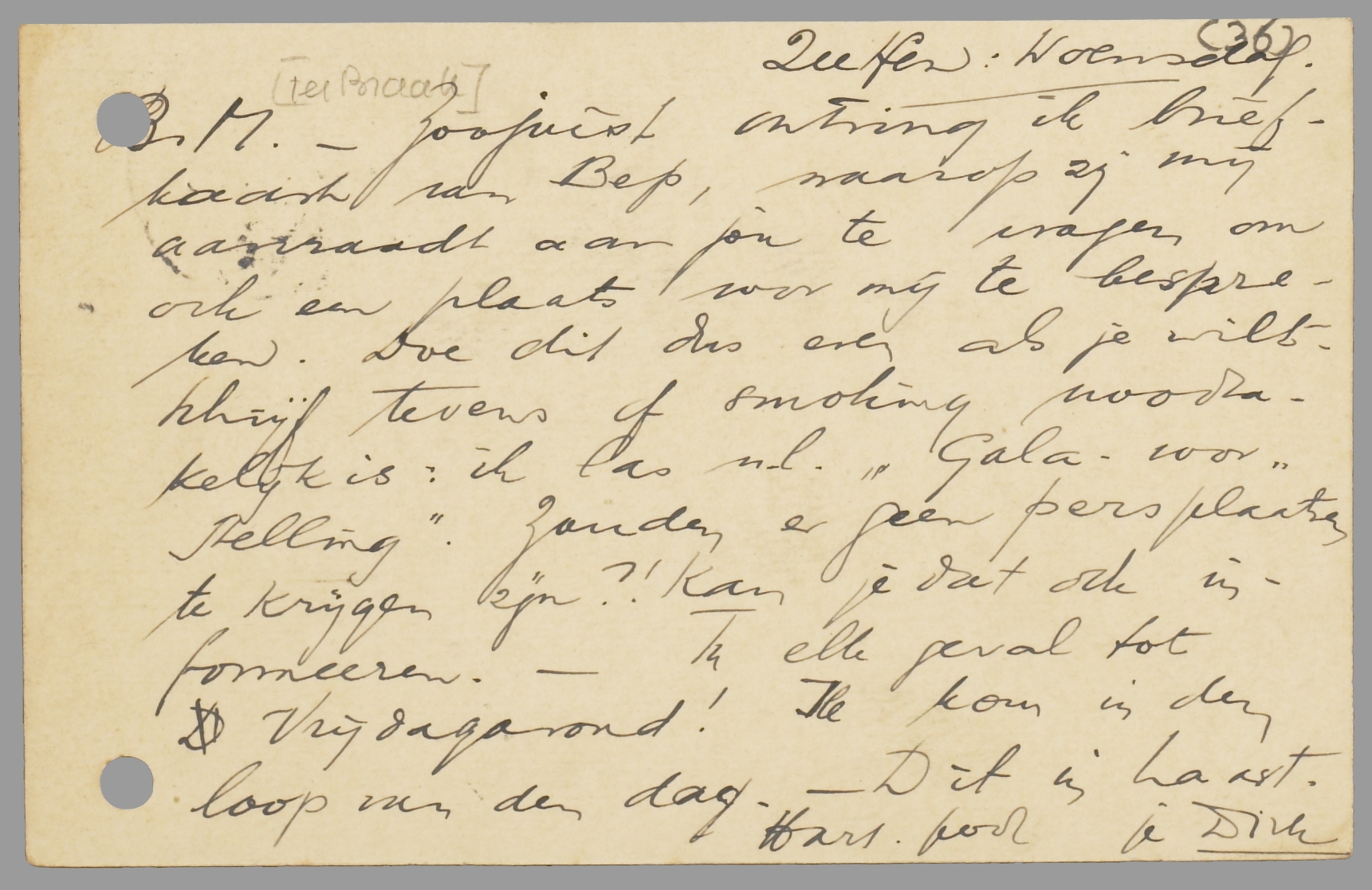 Zoojuist ontving ik briefkaart van Bep, waarop zij mij aanraadt aan jou te vragen om ook een plaats voor mij te bespreken. Doe dit dus even als je wilt. Schrijf tevens of smoking noodzakelijk is: ik las n.l. ‘Gala-voorstelling’. Zouden er geen perskaarten te krijgen zijn?! Kan jij dat ook informeeren. - in elk geval tot Vrijdagavond! Ik kom in de loop van den dag. - Dit in haast.