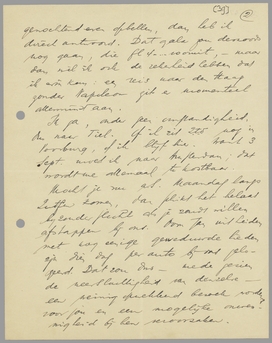 Maar nu ter dringendste zake. Jij gaat dus Vrijdagmiddag naar A'dam en komt noch op de filmgala, noch bij Bep logeeren. Dat is jammer. Want nu zullen wij elkaar waarschijnlijk niet kunnen zien. Ik was n.l. van plan om te gaan, zooals je uit mijn briefkaart van vanmiddag zult hebben gemerkt, en wilde bijv. tot Maandag in Voorburg blijven. Maar als jij geen kaarten koopt (of hebt gekocht) noch voor mij noch voor Bep, dan blijf ik maar weg, want persplaatsen geven zij blijkbaar niet. Of kocht je toch voor Bep? Over deze zaken zal ik haar morgenochtend even opbellen, dan heb ik direct antwoord. Dat gala zou desnoods nog gaan, die fl 4 -... vooruit, - maar dan wil ik ook de zekerheid hebben dat ik erin kan: een reis naar den Haag zonder Napoleon zit er momenteel allerminst aan.