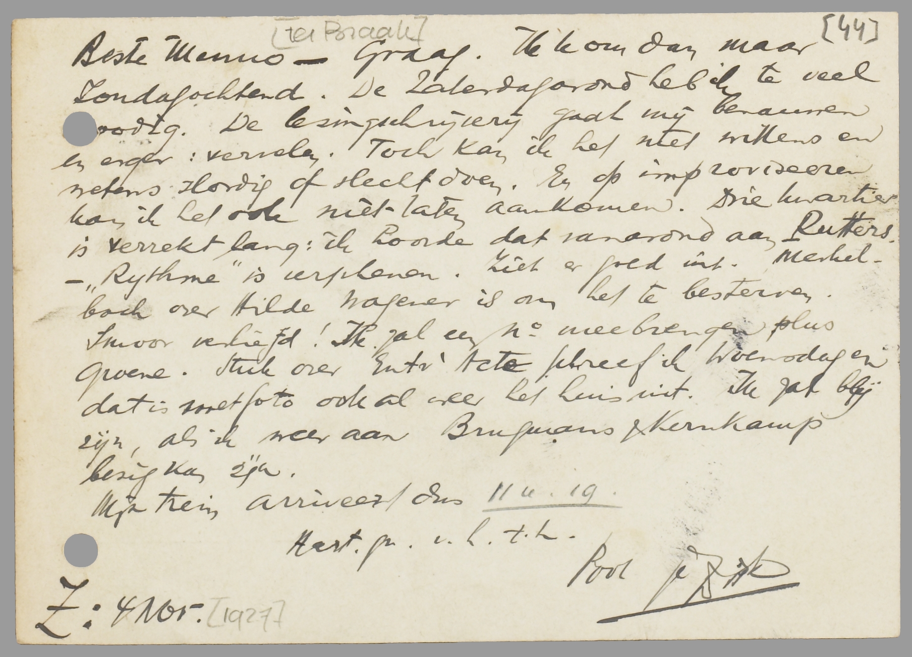 Graag. Ik kom dan maar Zondagochtend. De Zaterdagavond heb ik te veel noodig. De lezingschrijverij gaat mij benauwen en erger: vervelen. Toch kan ik het niet willens en wetens slordig of slecht doen. En op improviseeren kan ik het ook niet laten aankomen. Drie kwartier is verrekt lang: ik hoorde dat vanavond aan Rutters. - ‘Rythme’ is verschenen. Ziet er goed uit. Merkelbach over Hilde Wagener is om het te besterven.