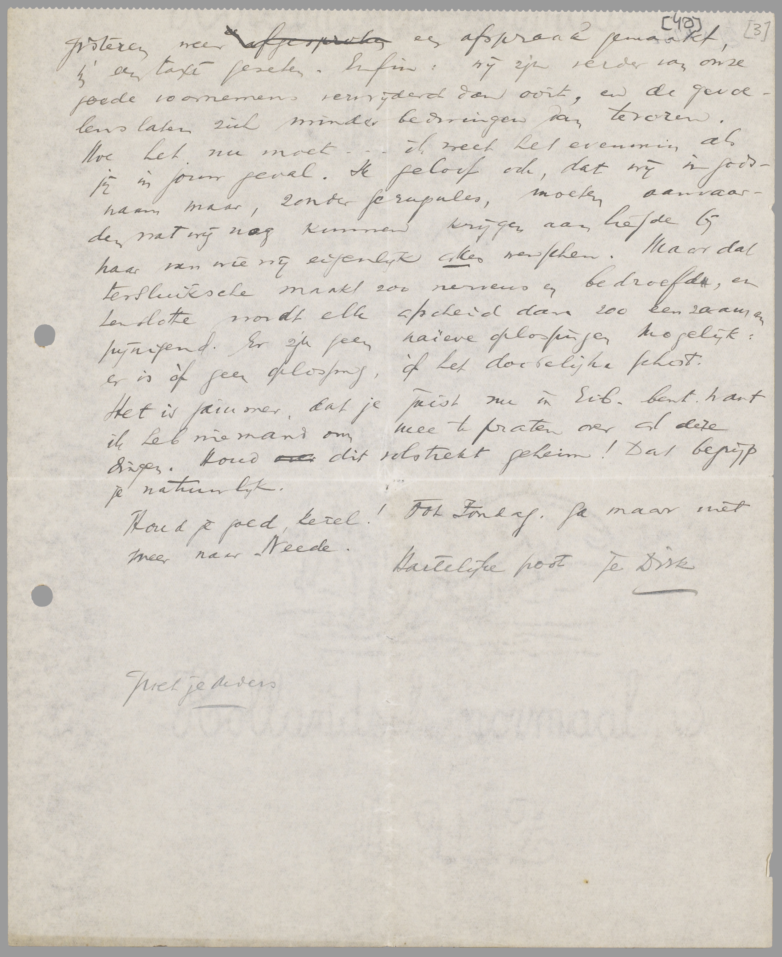 En om nu tot het persoonlijke te komen: Willem heeft dan aan een soupertje Zondag gezegd, dat hij hetzelfde zou doen zoodra zijn vrouw er met een ander liefdesbetrekkingen op na hield: hij trekt dus de parallel-Kuiper, die destijds in die omstandigheden verkeerde, en poneerde het als ‘eenige oplossing’. Hoe, overigens, de kwestie met Emmy zich zal ontwikkelen, is weer onvoorspelbaarder dan ooit. (De verhouding tusschen mij en Corry is ten einde. Niet om Emmy alleen (daarvan heb ik met haar niet gesproken) maar in zichzelf is dit voor mij onmogelijk geworden. Overigens trachten wij ‘goede vrienden’ te blijven.) Maar sinds Zondag (of eigenlijk sinds vandaag voor twee weken) is Emmy tot de ontdekking gekomen, dat haar gevoel voor mij zich op onnaspeurbare doch snelle wijze overrompelend ontwikkeld heeft; wat, helaas, nog steeds haar liefde voor Willem niet deert, maar wel ernaast een woekerende kracht blijkt. Woensdag spraken we, ten einde raad, af elkaar niet meer te zien. Expres ging ik verleden week op reis omdat ik haar Donderdag kon opbellen en zij mij. Dit wilde ik voorkomen. Vrijdag krijg ik in Zutfen een wilde brief: zij had mij opgebeld en verlangde. Een brief om gek van te worden. Zondagavond, na de vergadering, lang in den avond geloopen, gisteren weer een afspraak gemaakt, in een taxi gezeten. Enfin: wij zijn verder van onze goede voornemens verwijderd dan ooit, en de gevoelens laten zich minder bedwingen dan tevoren. Hoe het nu moet... ik weet het evenmin als jij in jouw geval. Ik geloof ook, dat wij in godsnaam maar, zonder scrupules, moeten aanvaarden wat wij nog kunnen krijgen aan liefde bij haar van wie wij eigenlijk alles wenschen. Maar dat tersluiksche maakt zoo nerveus en bedroefd, en tenslotte wordt elk afscheid dan zoo eenzaam en pijnigend. Er zijn geen naïeve oplossingen mogelijk: er is òf geen oplossing, òf het doodelijke schot. Het is jammer, dat je juist nu in Eib. bent. Want ik heb niemand om mee te praten over al deze dingen. Houd dit volstrekt geheim! Dat begrijp je natuurlijk.