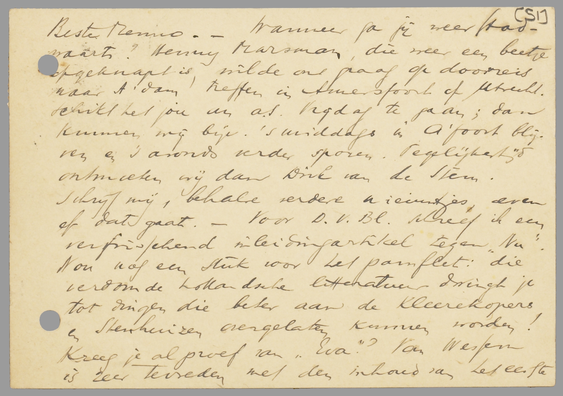 Schrijf mij, behalve verdere nieuwtjes, even of dat gaat. - Voor D.V.Bl. schreef ik een verfrisschend inleidingsartikel tegen ‘Nu’. Nou nog een stuk voor het pamflet: die verdomde hollandsche litteratuur dwingt je tot dingen die beter aan de Kleerekopers en Stenhuizen overgelaten kunnen worden!