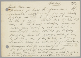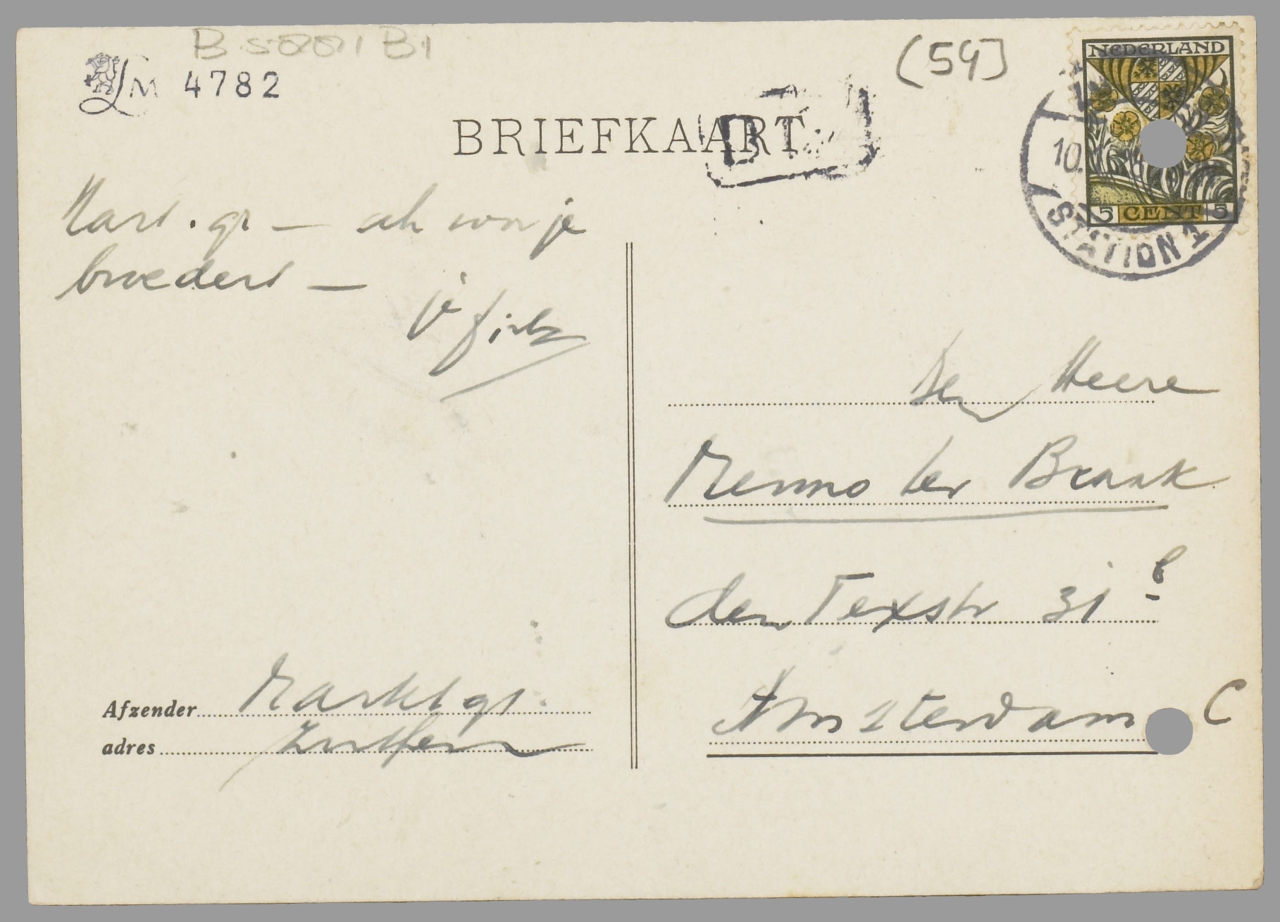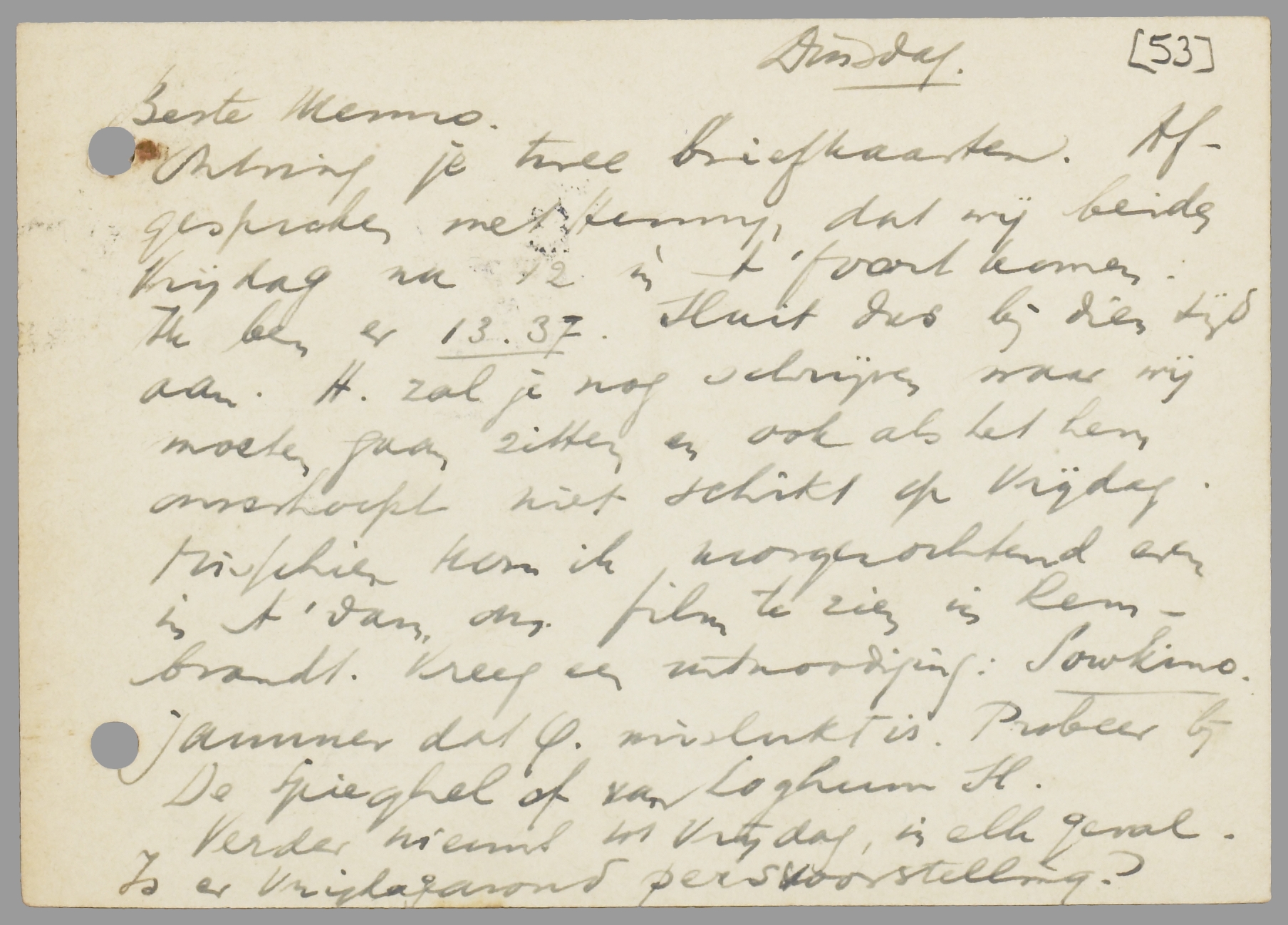Ontving je twee briefkaarten. Afgesproken met Henny, dat wij beiden Vrijdag na 12 in A'foort komen. Ik ben er 13.37. Sluit dus bij dien tijd aan. H. zal je nog schrijven waar wij moeten gaan zitten, en ook als het hem onverhoopt niet schikt op Vrijdag. Misschien kom ik morgenochtend even in A'dam, om film te zien in Rembrandt. Kreeg een uitnoodiging: Sowkino. Jammer dat Q. mislukt is. Probeer bij De Spieghel of van Loghum Sl.