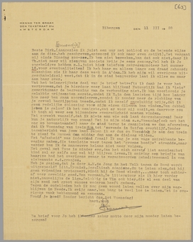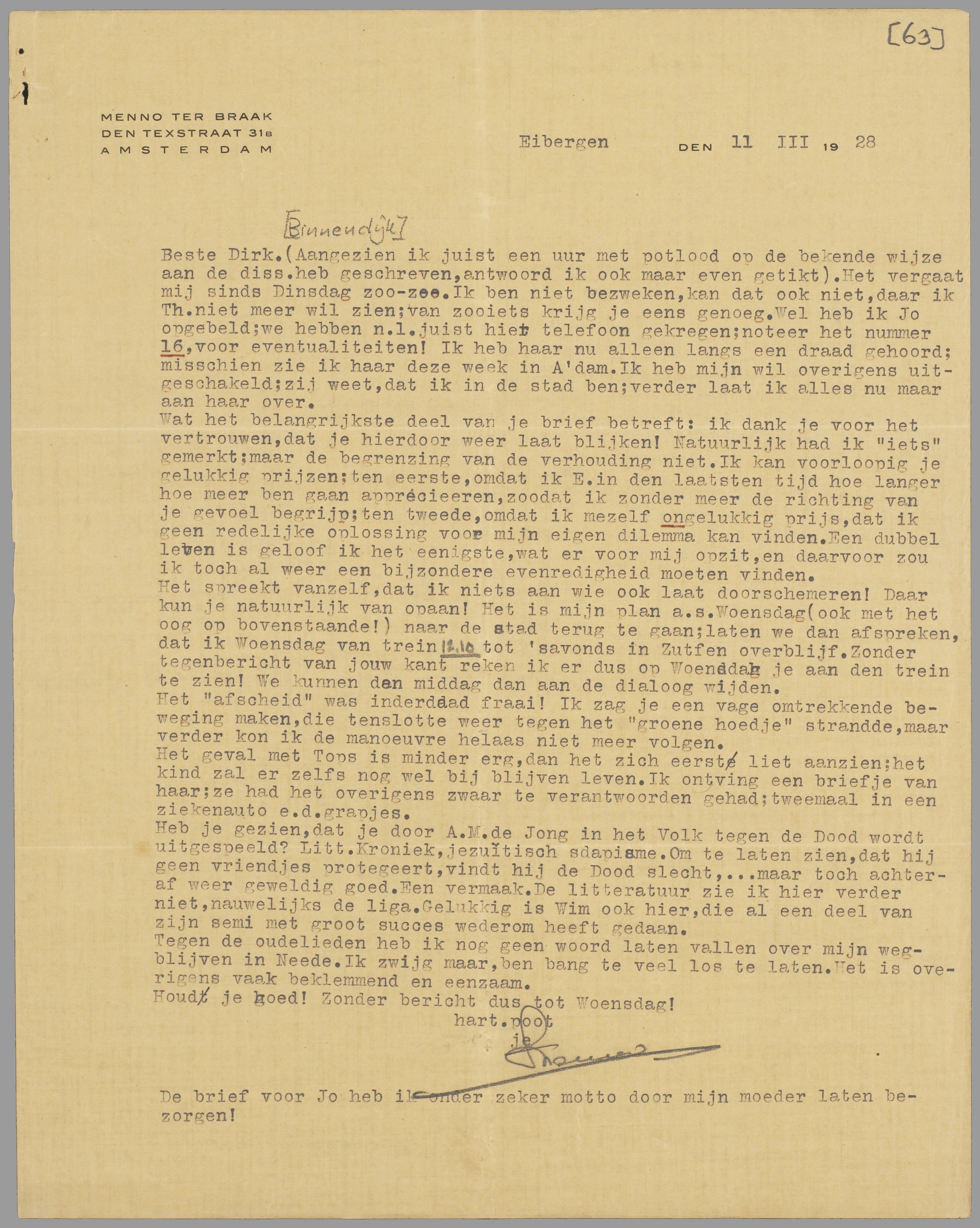 (Aangezien ik juist een uur met potlood op de bekende wijze aan de diss. heb geschreven, antwoord ik ook maar even getikt.) Het vergaat mij sinds Dinsdag zoo-zoo. Ik ben niet bezweken, kan dat ook niet, daar ik Th. niet meer wil zien; van zooiets krijg je eens genoeg. Wel heb ik Jo opgebeld; we hebben n.l. juist hier telefoon gekregen; noteer het nummer 16, voor eventualiteiten! Ik heb haar nu alleen langs een draad gehoord; misschien zie ik haar deze week in A’dam. Ik heb mijn wil overigens uitgeschakeld; zij weet, dat ik in de stad ben; verder laat ik alles nu maar aan haar over.