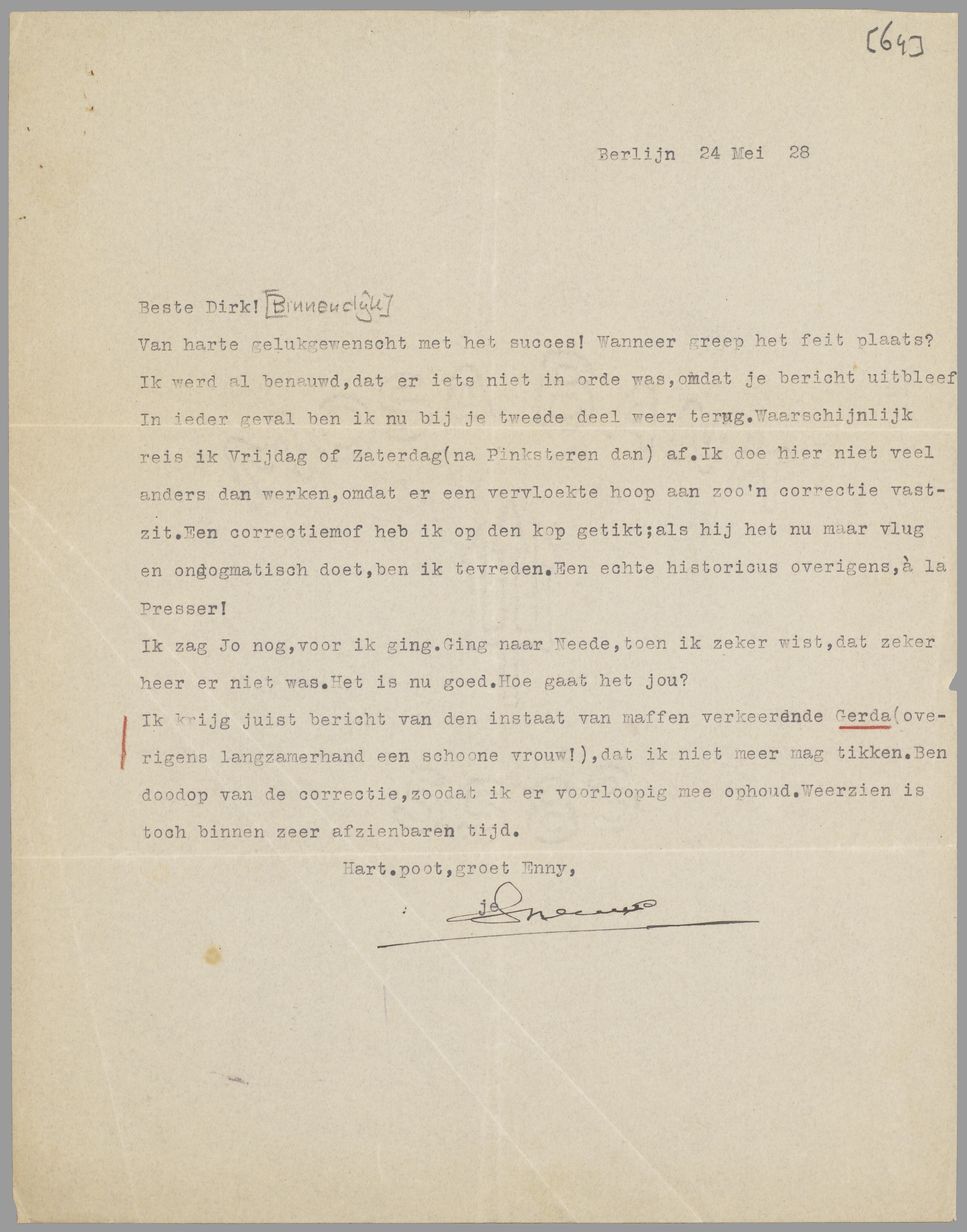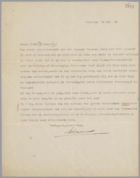 Van harte gelukgewenscht met het succes! Wanneer greep het feit plaats? Ik werd al benauwd, dat er iets niet in orde was, omdat je bericht uitbleef. In ieder geval ben ik nu bij je tweede deel weer terug. Waarschijnlijk reis ik Vrijdag of Zaterdag (na Pinksteren dan) af. Ik doe hier niet veel anders dan werken, omdat er een vervloekte hoop aan zoo'n correctie vastzit. Een correctiemof heb ik op den kop getikt; als hij het nu maar vlug en ondogmatisch doet, ben ik tevreden. Een echte historicus overigens, à la Presser!