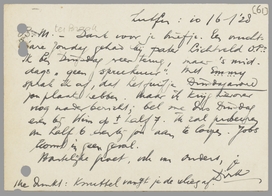 Dank je voor je briefje. Een vruchtbare Zondag gehad bij pater Lichtveld O.P.? Ik ben Dinsdag weer terug, maar 's middags ‘geen spreekuur’. Met Enny sprak ik af, dat het fuifje Dinsdagavond zou plaats hebben. Maar ik krijg hierover nog nader bericht; bel me dus Dinsdag even bij Wim op ± half 7. Ik zal probeeren om half 6 even bij jou aan te loopen. Jobs komt in geen geval.