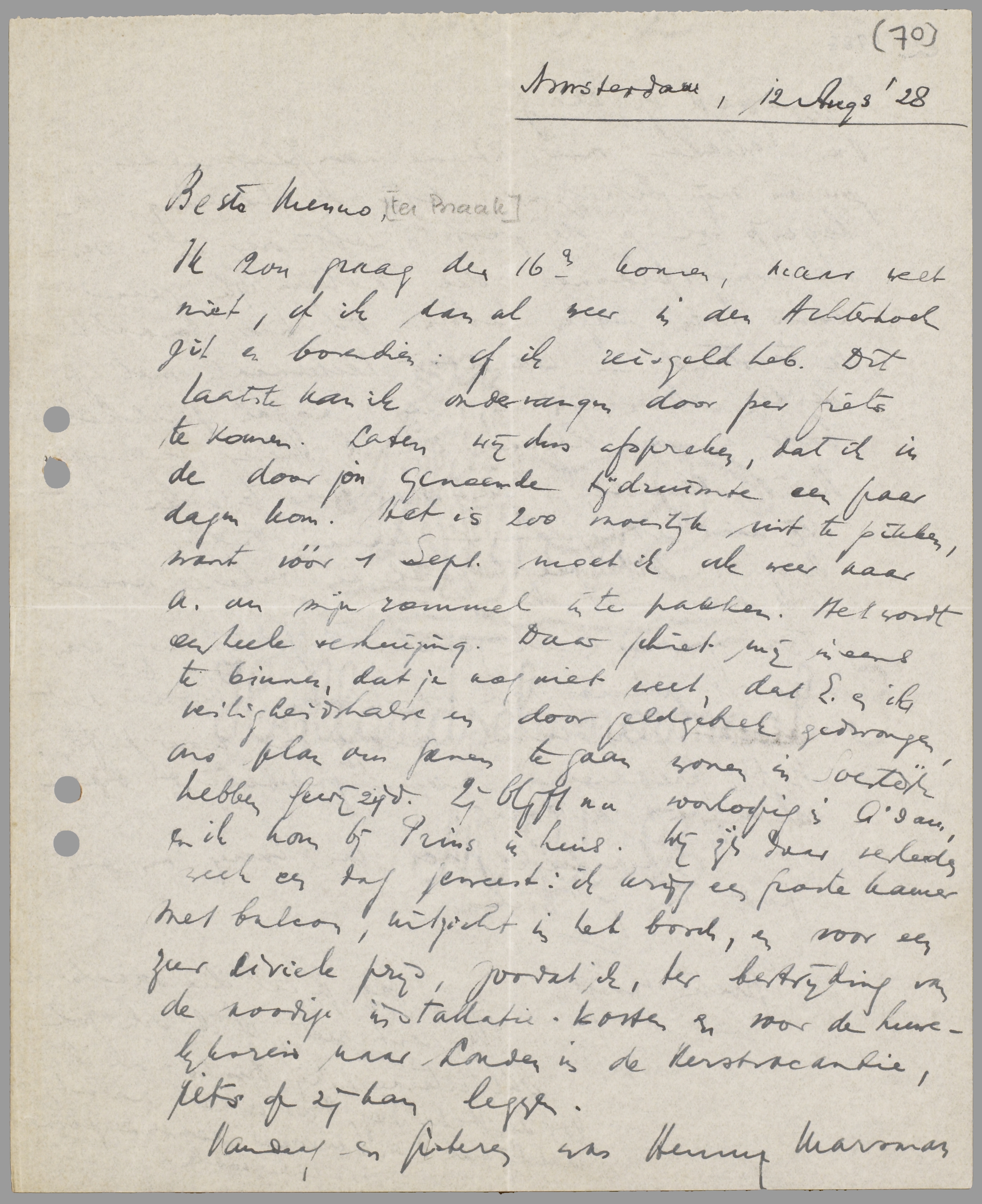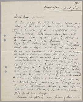 Ik zou graag den 16en komen, maar weet niet, of ik dan al weer in den Achterhoek zit en bovendien: of ik reisgeld heb. Dit laatste kan ik ondervangen door per fiets te komen. Laten wij dus afspreken, dat ik in de door jou genoemde tijdruimte een paar dagen kom. Het is zoo moeilijk uit te pikken, want vóór 1 Sept. moet ik ook weer naar A. om mijn rommel in te pakken. Het wordt een heele verhuizing. Daar schiet mij ineens te binnen, dat je nog niet weet, dat E. en ik, veiligheidshalve en door geldgebrek gedwongen, ons plan om samen te gaan wonen in Soestdijk hebben gewijzigd. Zij blijft nu voorloopig in A'dam, en ik kom bij Prins in huis. Wij zijn daar verleeden week een dag geweest: ik krijg een groote kamer met balcon, uitzicht in het bosch, en voor een zeer civiele prijs, zoodat ik, ter bestrijding van de noodige installatie-kosten en voor de huwelijksreis naar Londen in de Kerstvacantie, iets op zij kan leggen.