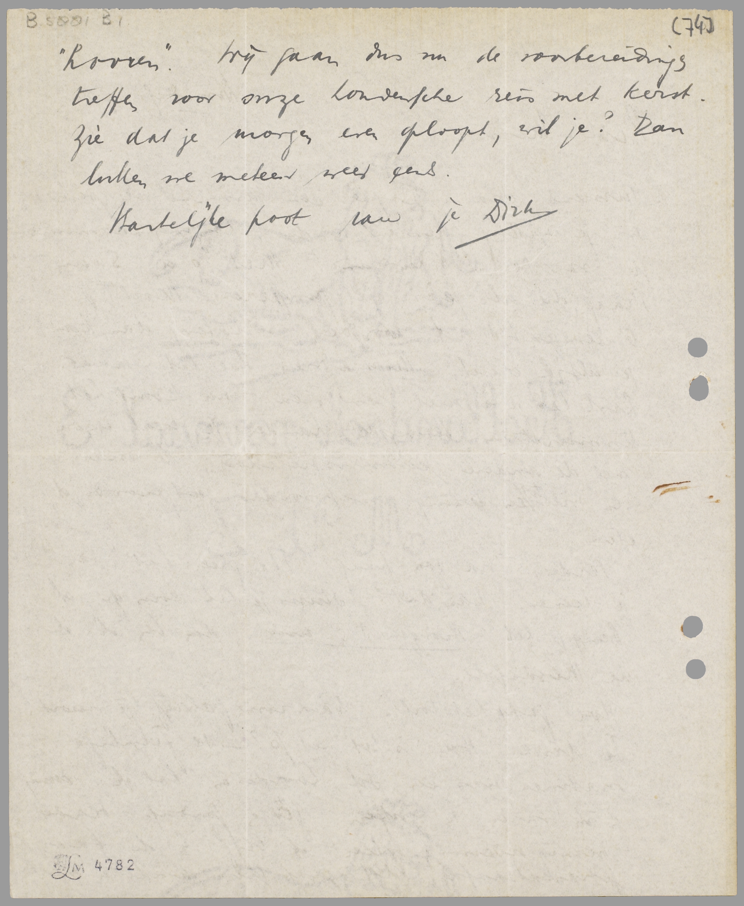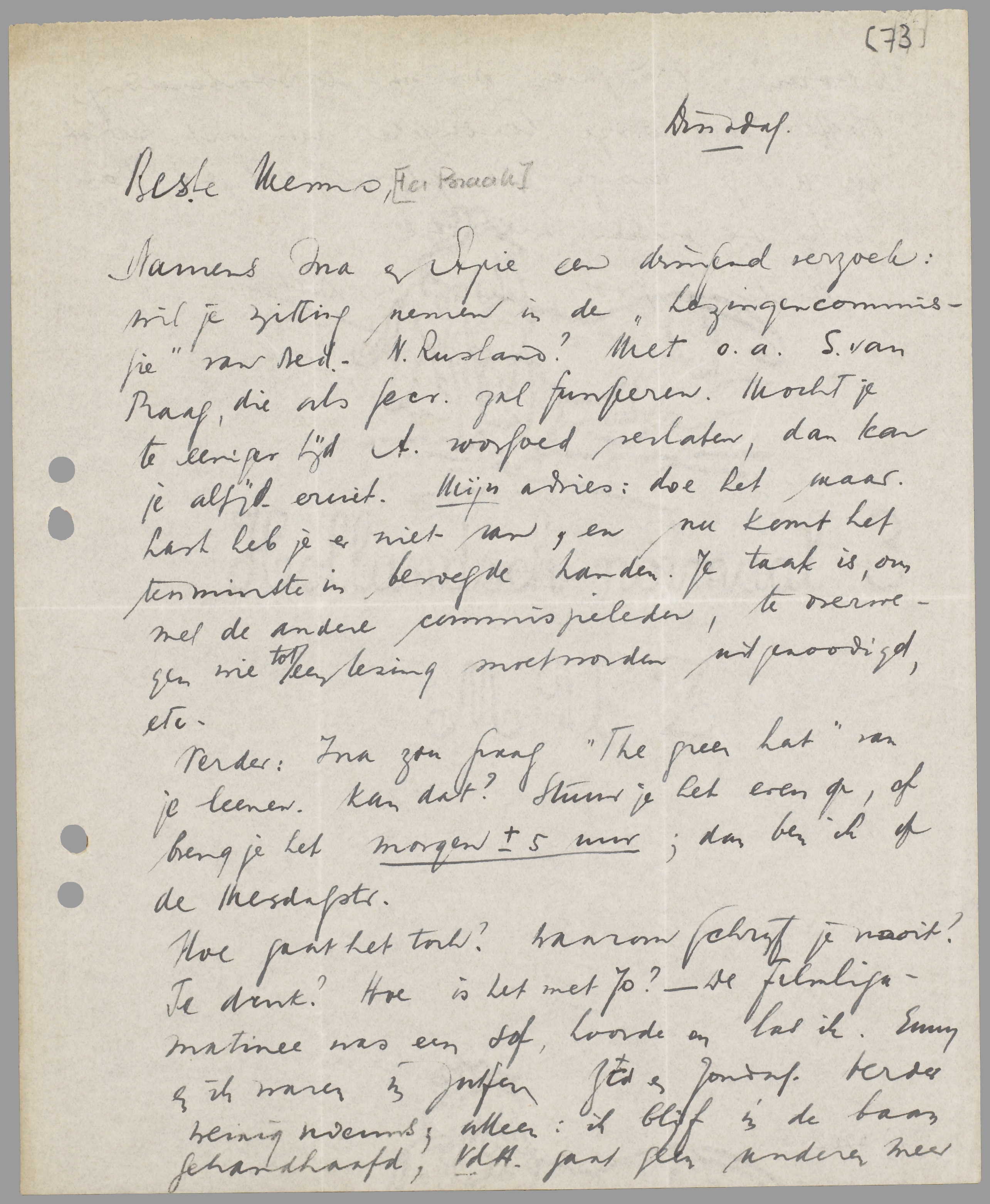 Namens Ina en Apie een dringend verzoek: wil je zitting nemen in de ‘Lezingencommissie’ van Ned.- N. Rusland? Met o.a. S. van Praag, die als secr. zal fungeeren. Mocht je te eeniger tijd A. voorgoed verlaten, dan kan je altijd eruit. Mijn advies: doe het maar. Last heb je er niet van, en nu komt het tenminste in bevoegde handen. Je taak is, om met de andere commissieleden, te overwegen wie tot een lezing moet worden uitgenoodigd, etc.