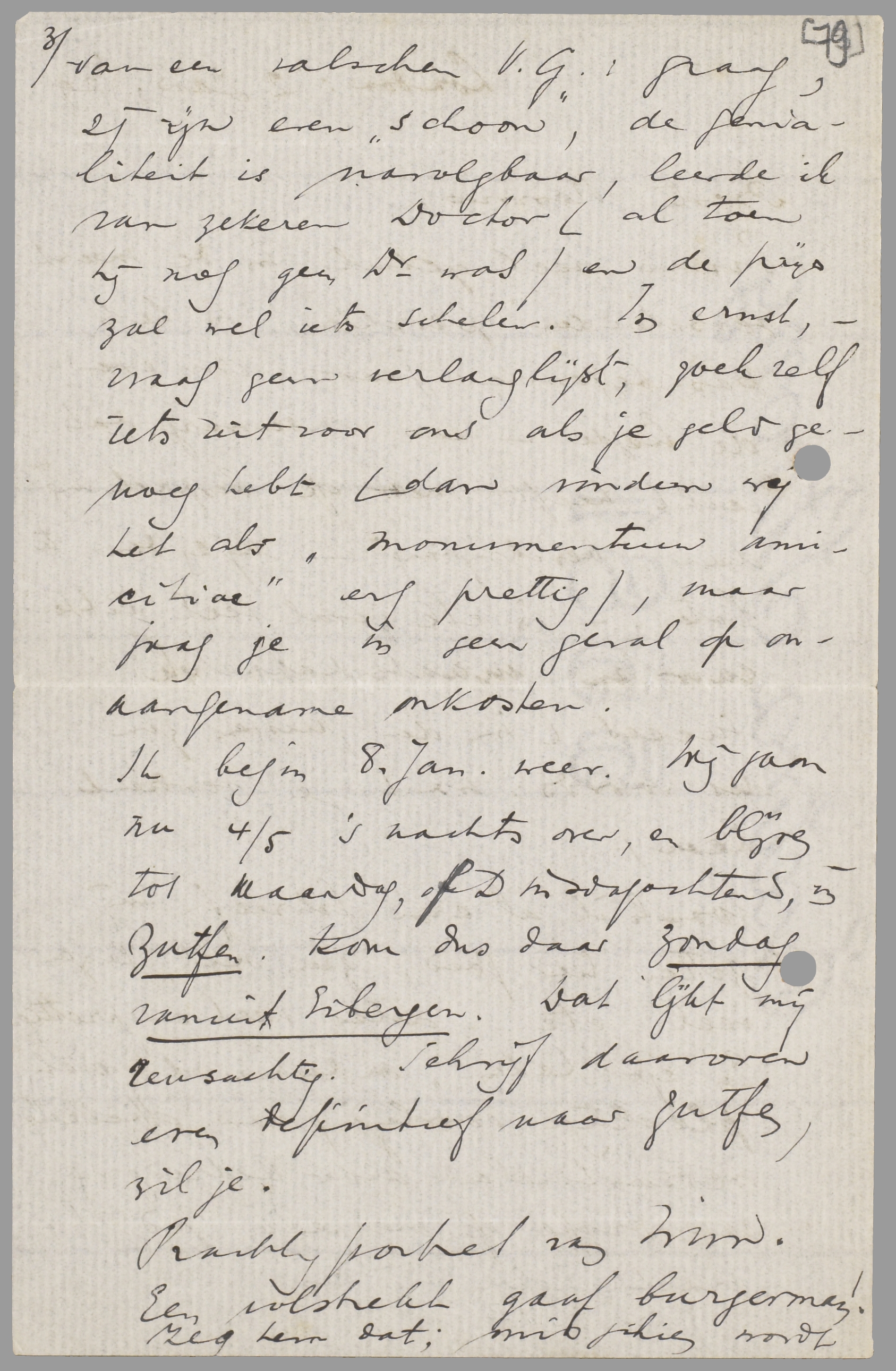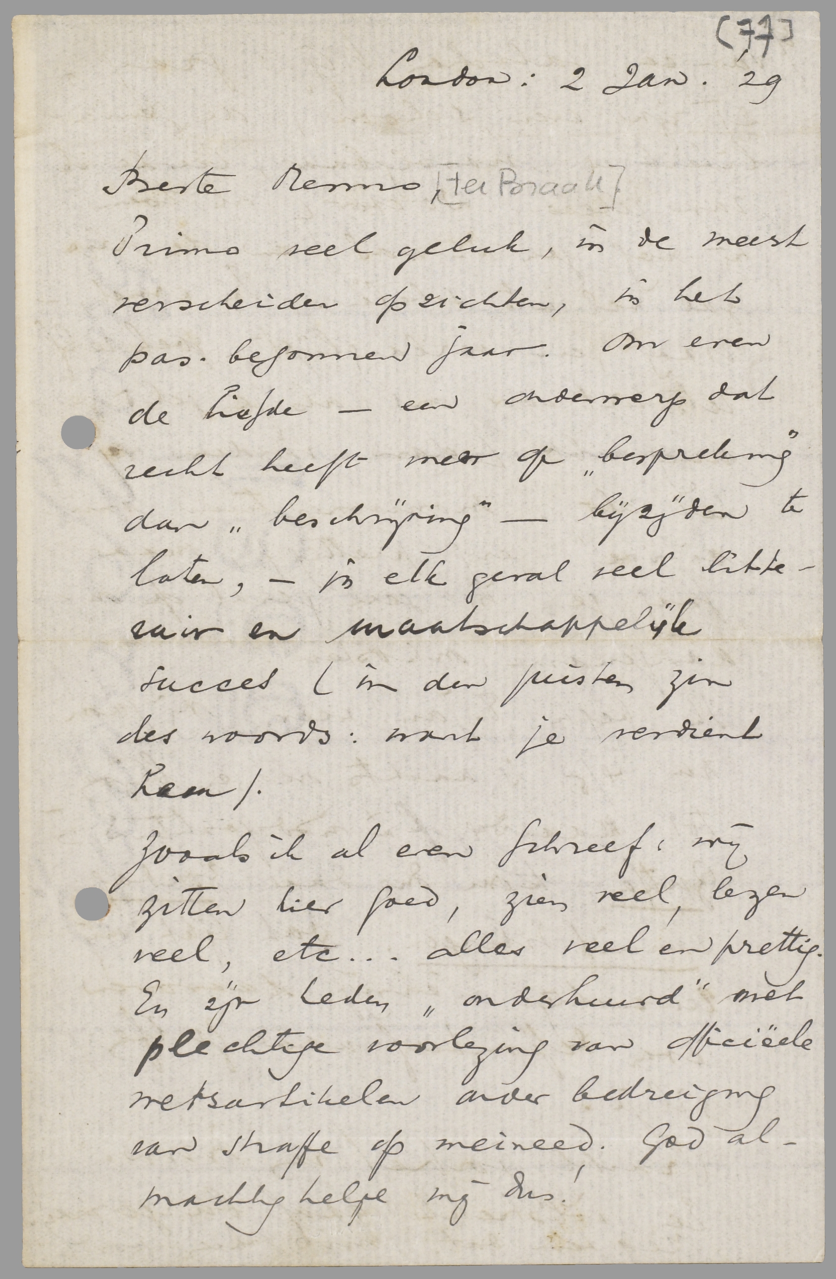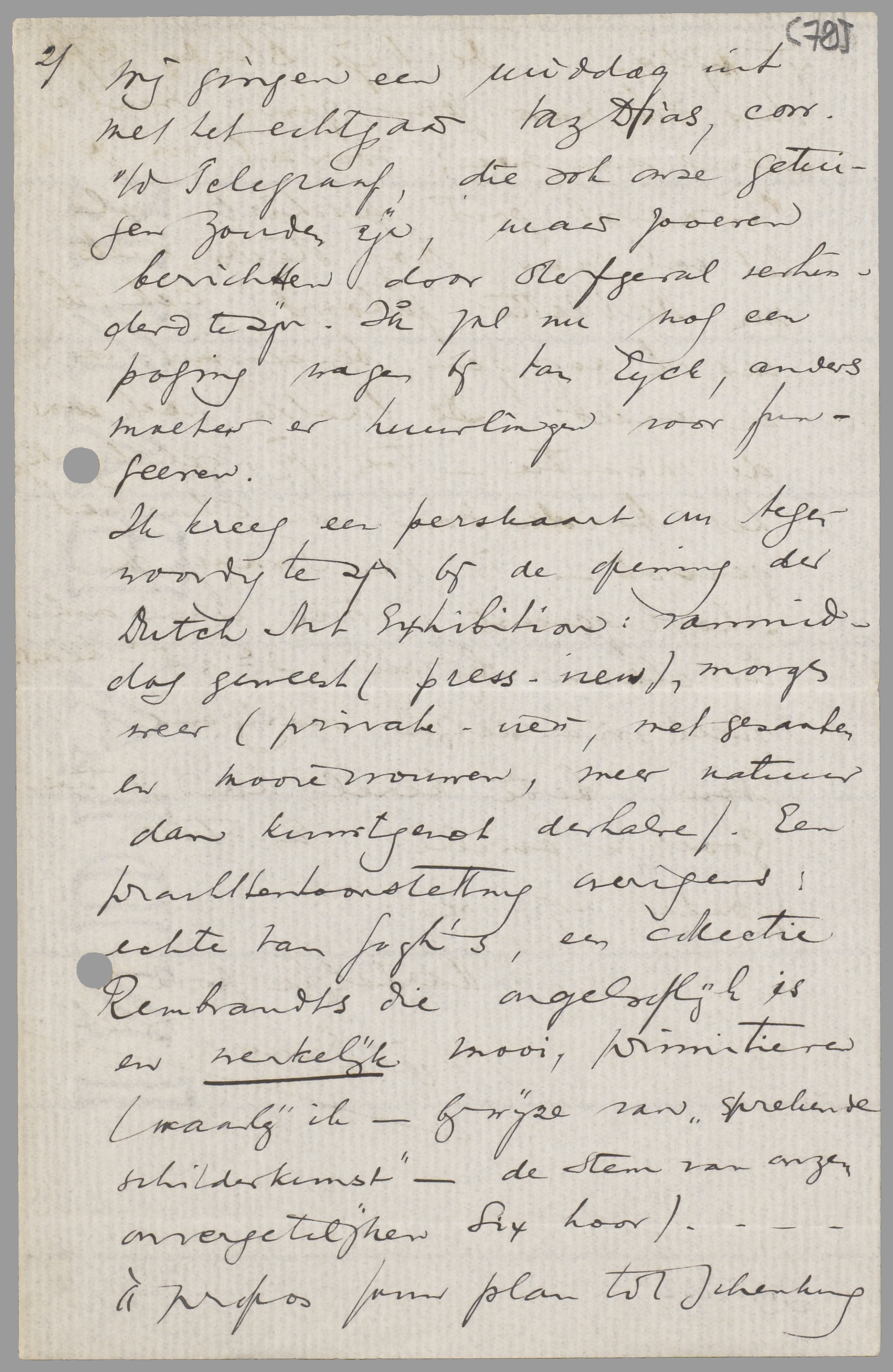 Ik kreeg een perskaart om tegenwoordig te zijn bij de opening der Dutch Art Exhibition: vanmiddag geweest (press-view), morgen weer (private-view, met gezanten en mooie vrouwen, meer natuur dan kunstgenot derhalve). Een prachttentoonstelling overigens: echte Van Gogh's, een collectie Rembrandts die ongelooflijk is en werkelijk mooi, primitieven (waarbij ik - bij wijze van ‘sprekende schilderkunst’ - de stem van onzen onvergetelijken Six hoor)... À propos jouw plan tot schenking van een valschen V.G.: graag, zij zijn even ‘schoon’, de genialiteit is navolgbaar, leerde ik van zekeren Doctor (al toen hij nog geen Dr was) en de prijs zal wel iets schelen. In ernst, - vraag geen verlanglijst, zoek zelf iets uit voor ons als je geld genoeg hebt (dan vinden wij het als ‘monumentum amicitiae’ erg prettig), maar jaag je in geen geval op onaangename onkosten.