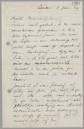 Primo veel geluk, in de meest verscheiden opzichten, in het pas-begonnen jaar. Om even de liefde - een onderwerp dat recht heeft meer op ‘bespreking’ dan op ‘beschrijving’ - bijzijden te laten, - in elk geval veel litterair en maatschappelijk succes (in den juisten zin des woords: want je verdient hem).