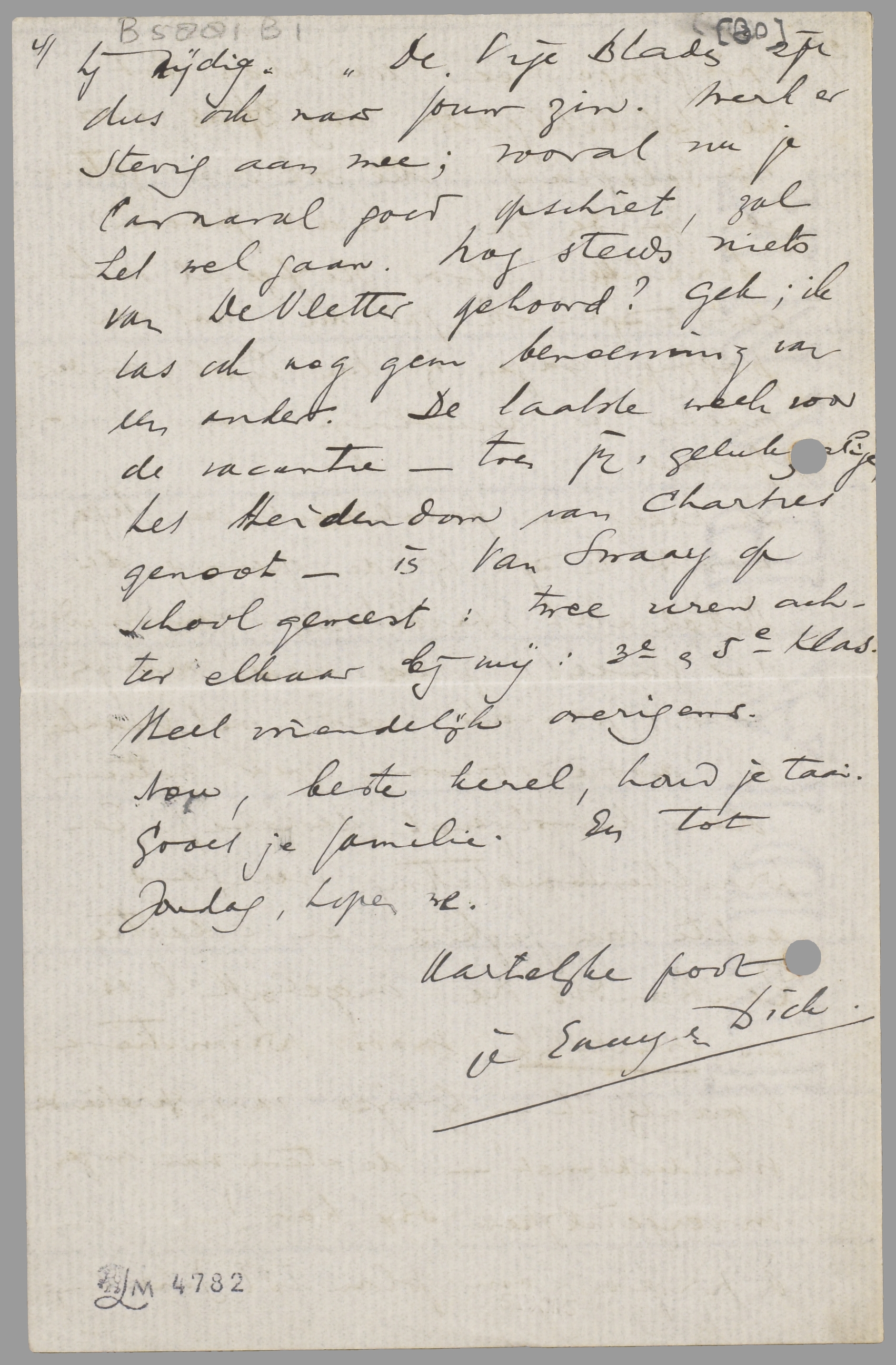 Prachtig portret van Wim. Een volstrekt gaaf burgerman! Zeg hem dat; misschien wordt hij nijdig. ‘De Vrije Bladen’ zijn dus ook naar jouw zin. Werk er stevig aan mee; vooral nu je Carnaval goed opschiet, zal het wel gaan. Nog steeds niets van De Vletter gehoord? Gek; ik las ook nog geen benoeming van een ander. De laatste week voor de vacantie - toen jij, gelukzalige, het Heidendom van Chartres genoot - is Van Swaay op school geweest: twee uren achter elkaar bij mij: 3e en 5e klas. Heel vriendelijk overigens.