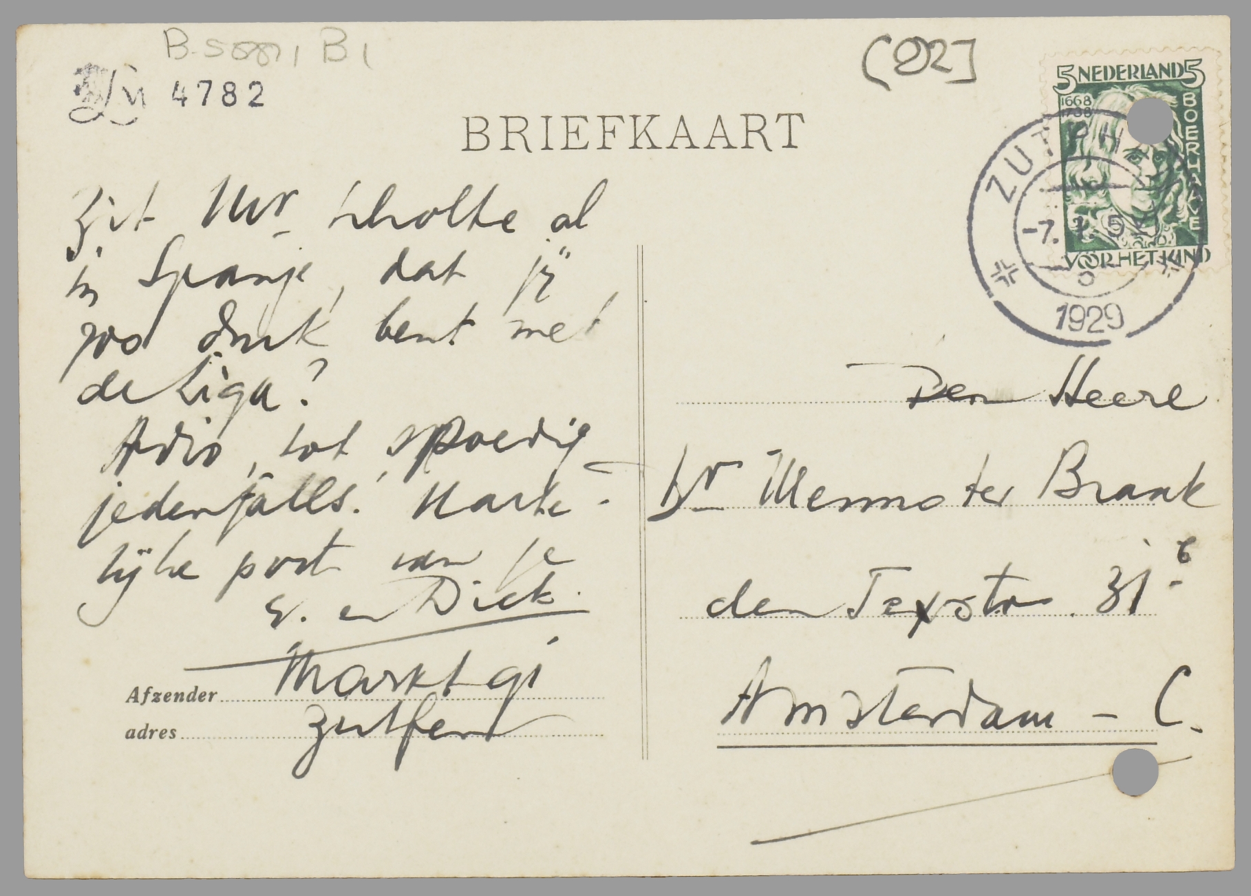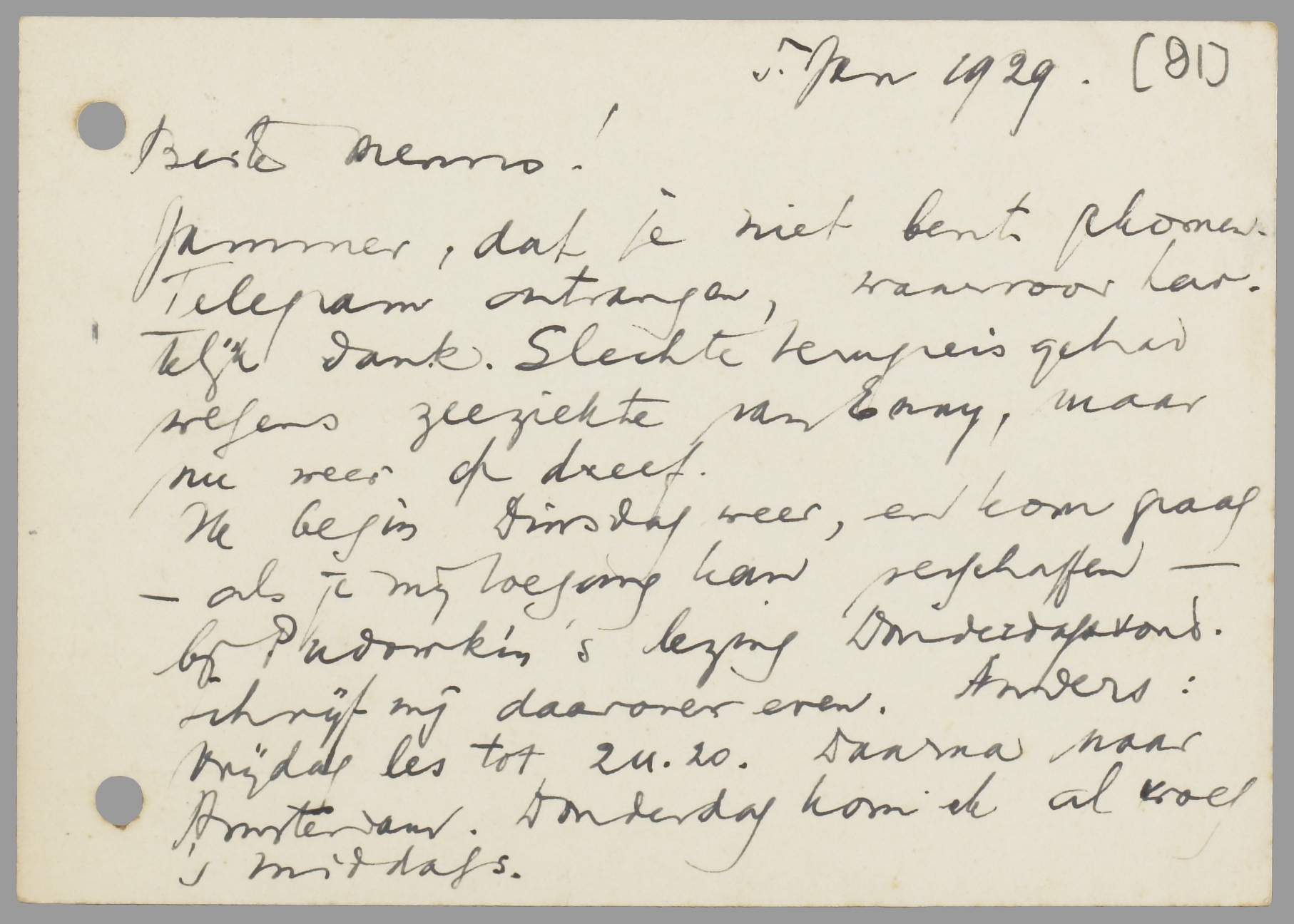 Ik begin Dinsdag weer, en kom graag - als je mij toegang kan verschaffen - bij Pudowkin's lezing Donderdagavond. Schrijf mij daarover even. Anders: Vrijdag les tot 2u.20. Daarna naar Amsterdam. Donderdag kom ik al vroeg 's middags. Zit Mr Scholte al in Spanje, dat jij zoo druk bent met de Liga?