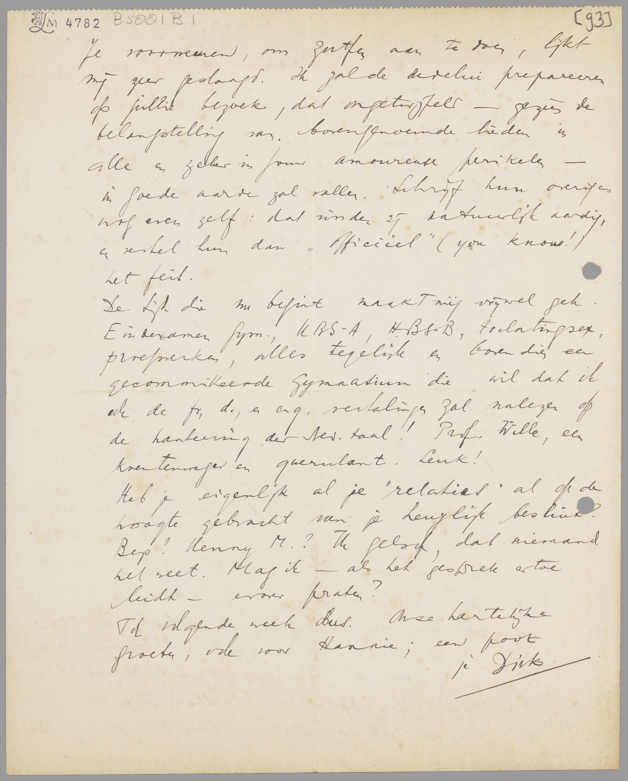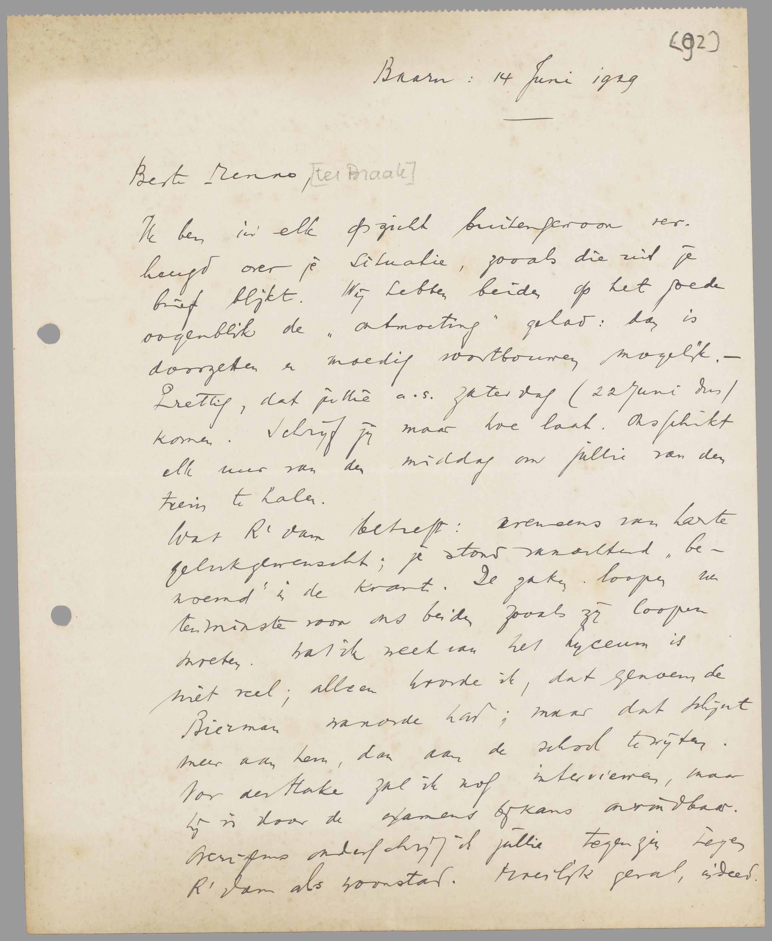 Wat R'dam betreft: eveneens van harte gelukgewenscht; je stond vanochtend ‘benoemd’ in de krant. De zaken loopen nu tenminste voor ons beiden zooals zij loopen moeten. Wat ik weet van het Lyceum is niet veel; alleen hoorde ik, dat genoemde Bierman wanorde had; maar dat schijnt meer aan hem, dan aan de school te wijten. Vor der Hake zal ik nog interviewen, maar hij is door de examens bijkans onvindbaar. Overigens onderschrijf ik jullie tegenzin tegen R'dam als woonstad. Moeilijk geval, indeed.
