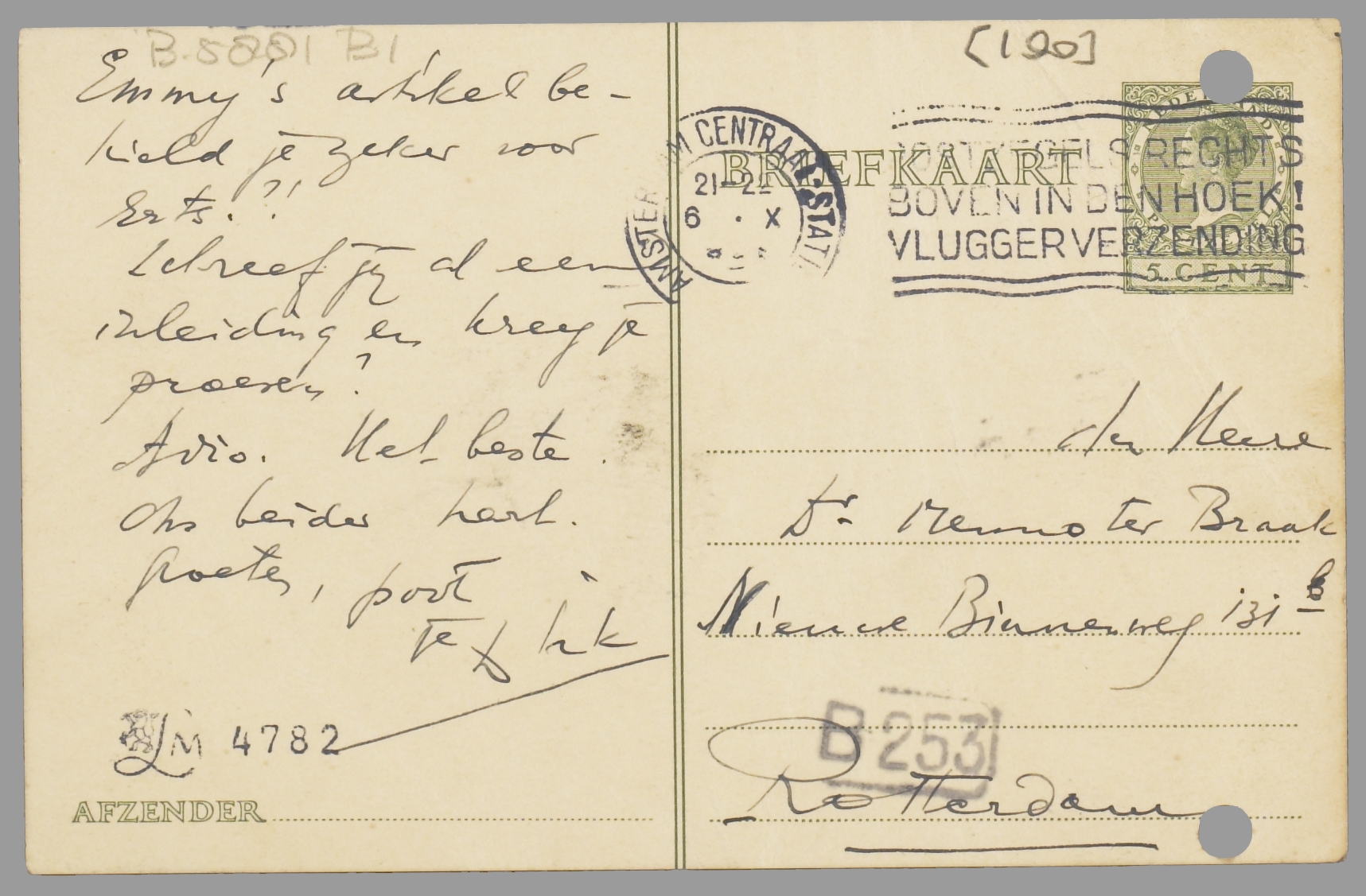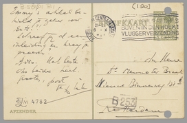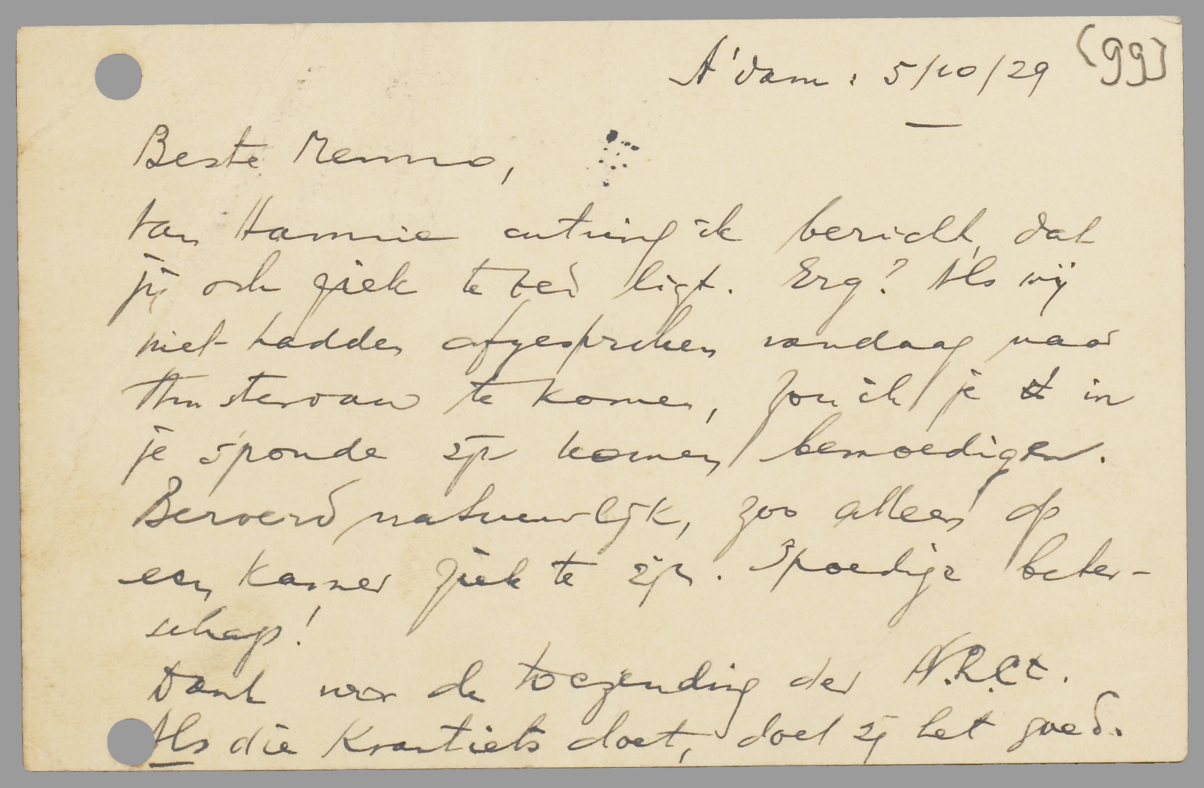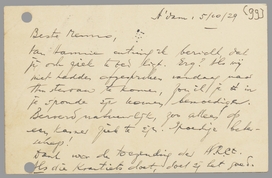 Van Hannie ontving ik bericht, dat jij ook ziek te bed ligt. Erg? Als wij niet hadden afgesproken vandaag naar Amsterdam te komen, zou ik je in je sponde zijn komen bemoedigen. Beroerd natuurlijk, zoo alleen op een kamer ziek te zijn. Spoedige beterschap!