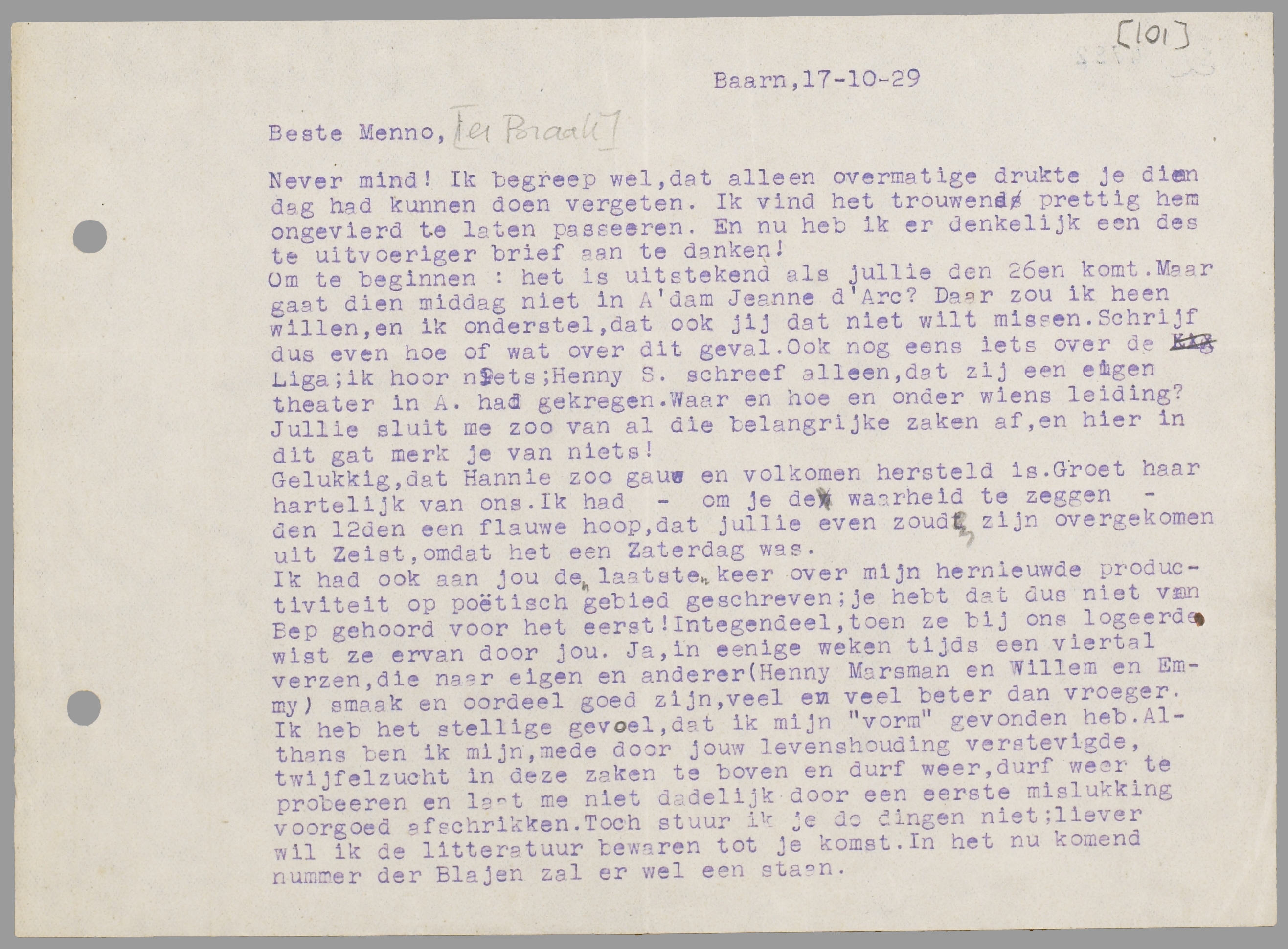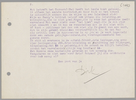 Om te beginnen: het is uitstekend als jullie den 26en komt. Maar gaat dien middag niet in A'dam Jeanne d'Arc? Daar zou ik heen willen, en ik onderstel, dat ook jij dat niet wilt missen. Schrijf dus even hoe of wat over dit geval. Ook nog eens iets over de Liga; ik hoor niets; Henny S. schreef alleen, dat zij een eigen theater in A. had gekregen. Waar en hoe en onder wiens leiding? Jullie sluit me zoo van al die belangrijke zaken af, en hier in dit gat merk je van niets!