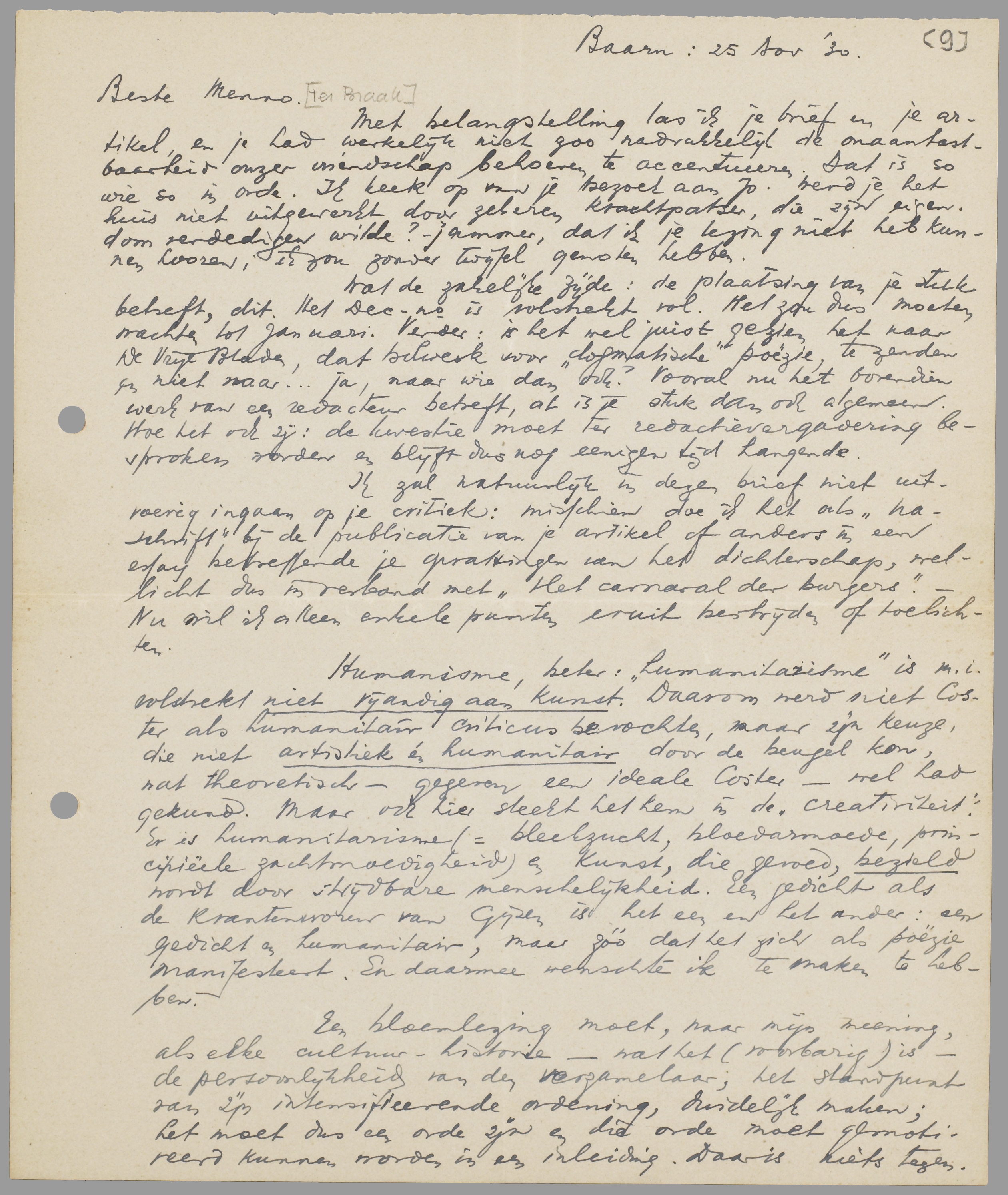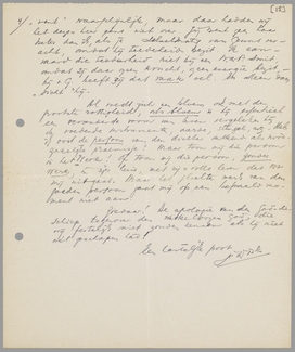 Met belangstelling las ik je brief en je artikel, en je had werkelijk niet zoo nadrukkelijk de onaantastbaarheid onzer vriendschap behoeven te accentueeren. Dat is so wie so in orde. Ik keek op van je bezoek aan Jo. Werd je het huis niet uitgewerkt door zekeren krachtpatser, die zijn eigendom verdedigen wilde? - Jammer, dat ik je lezing niet heb kunnen hooren; ik zou zonder twijfel genoten hebben.
