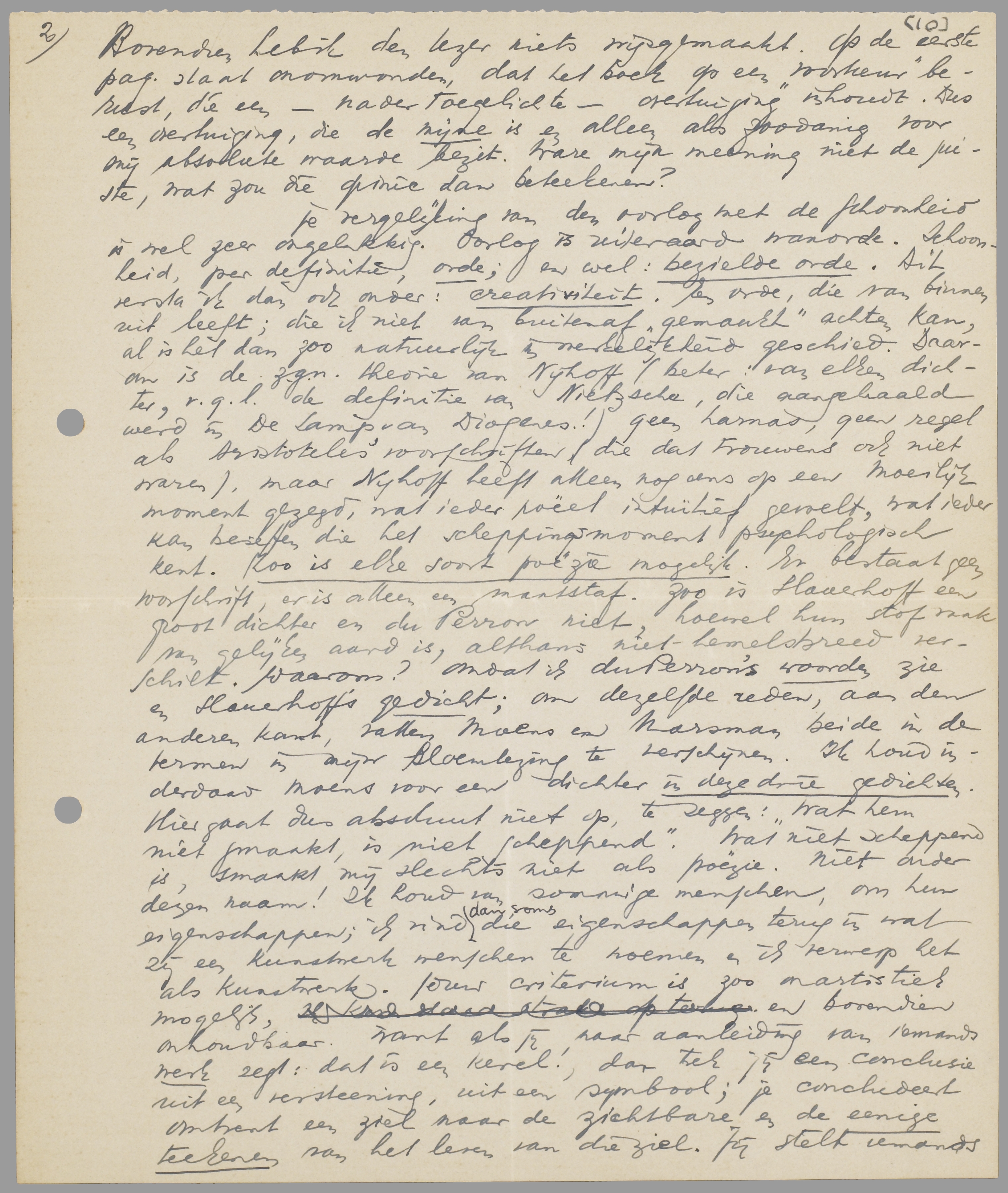 Ik zal natuurlijk in dezen brief niet uitvoerig ingaan op je critiek: misschien doe ik het als ‘naschrift’ bij de publicatie van je artikel of anders in een essay betreffende je opvattingen van het dichterschap, wellicht dus in verband met ‘Het carnaval der burgers’. - Nu wil ik alleen enkele punten eruit bestrijden of toelichten.