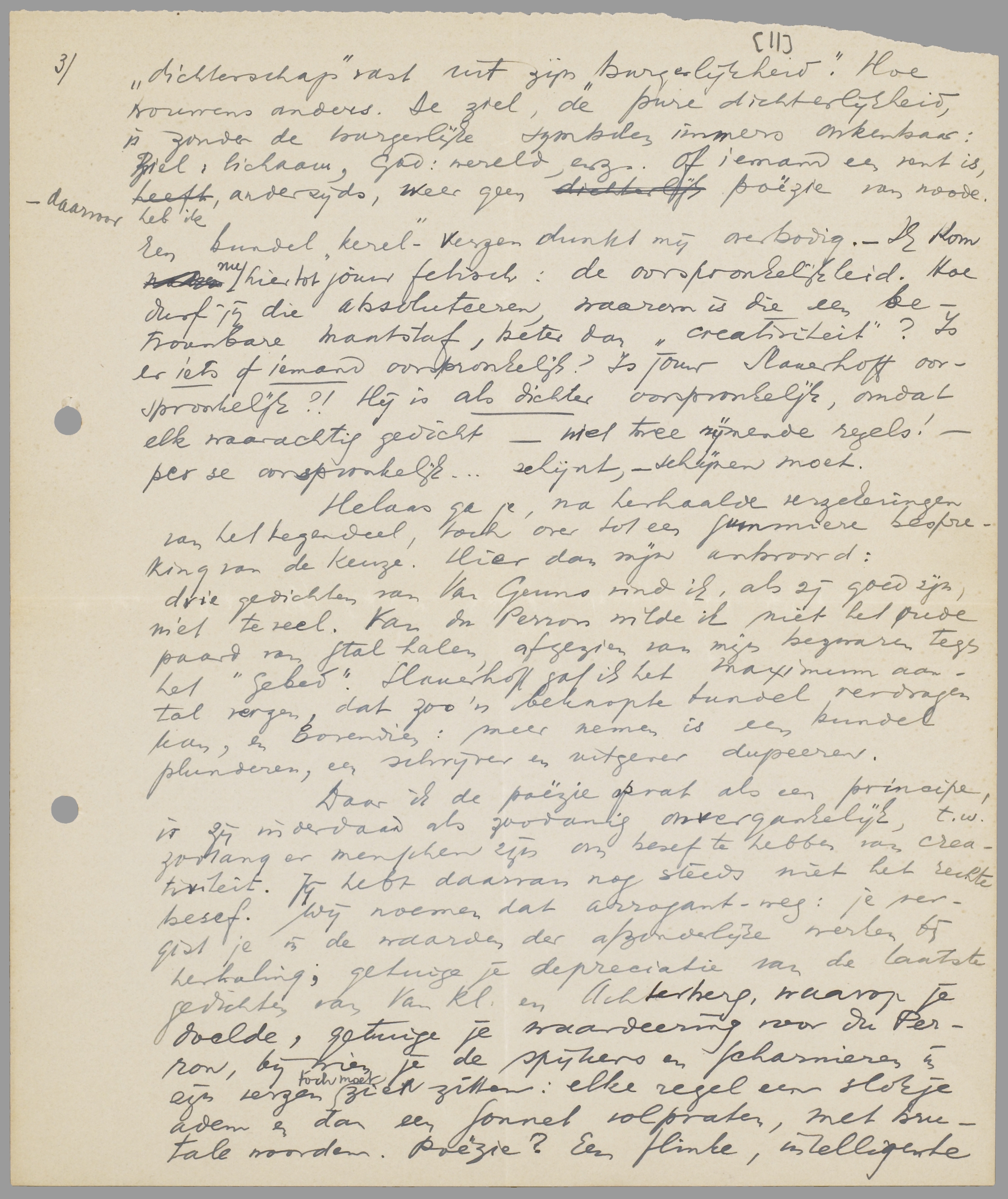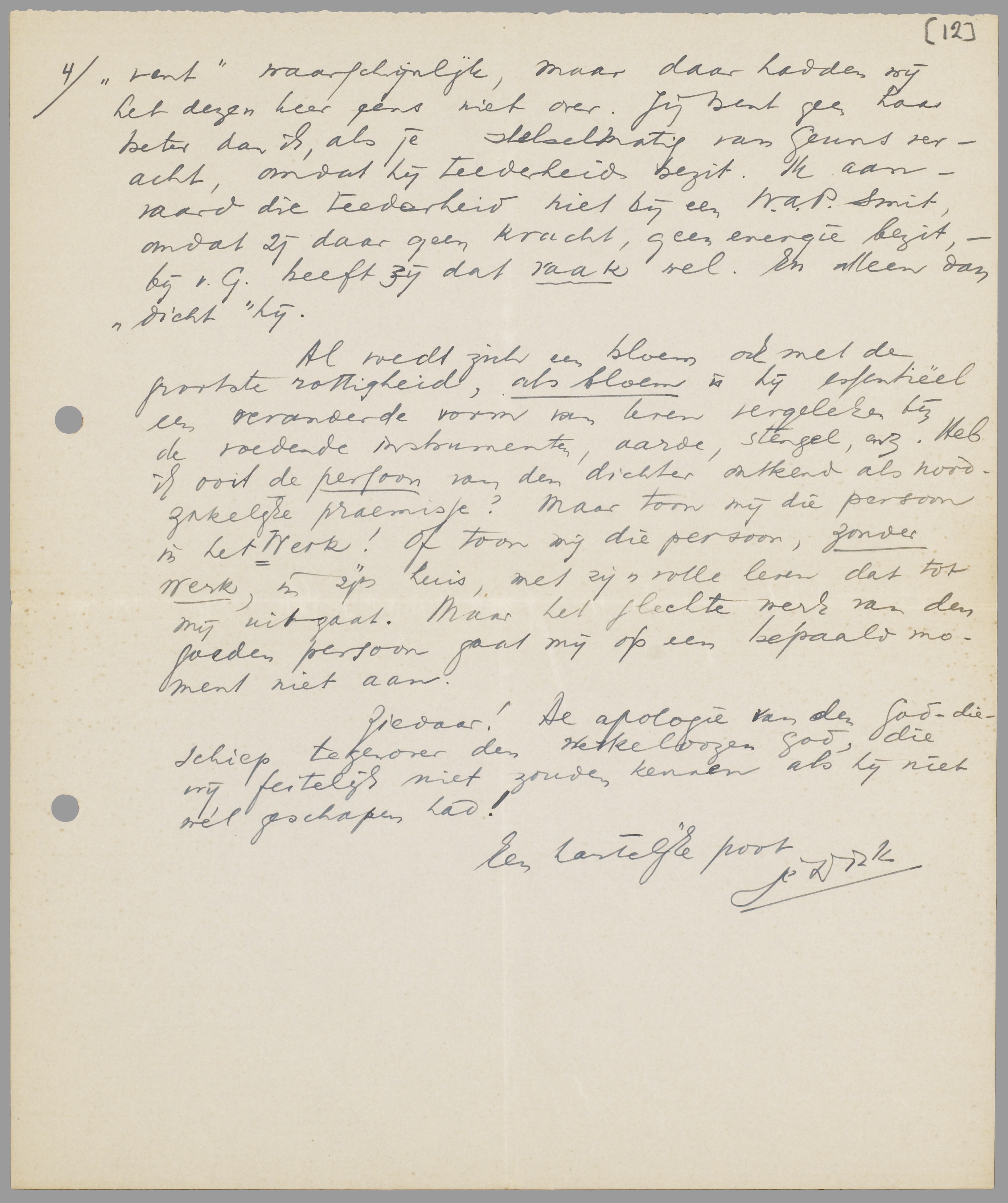 Daar ik de poëzie opvat als een principe, is zij inderdaad als zoodanig onvergankelijk, t.w. zoolang er menschen zijn om besef te hebben van creativiteit. Jij hebt daarvan nog steeds niet het rechte besef. Wij noemen dat arrogant-weg: je vergist je in de waarden der afzonderlijke werken bij herhaling, getuige je depreciatie van de laatste gedichten van Van Kl. en Achterberg, waarop je doelde, getuige je waardeering voor du Perron, bij wien je de spijkers en scharnieren in zijn verzen <toch moet> zien zitten: elke regel een slokje adem en dan een Sonnet volpraten, met brutale woorden. Poëzie? Een flinke, intelligente ‘vent’ waarschijnlijk, maar daar hadden wij het dezen keer eens niet over. Jij bent geen haar beter dan ik, als je stelselmatig van Geuns veracht, omdat hij teederheid bezit. Ik aanvaard die teederheid niet bij een W.A.P. Smit, omdat zij daar geen kracht, geen energie bezit, - bij v. G. heeft zij dat vaak wel. En alleen dan ‘dicht’ hij.
