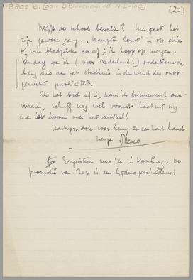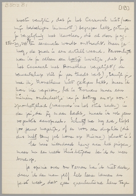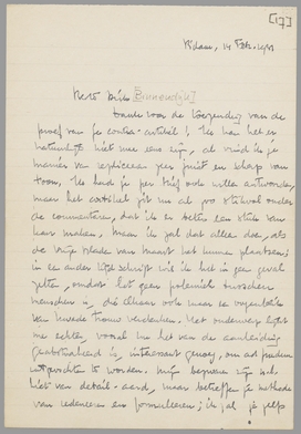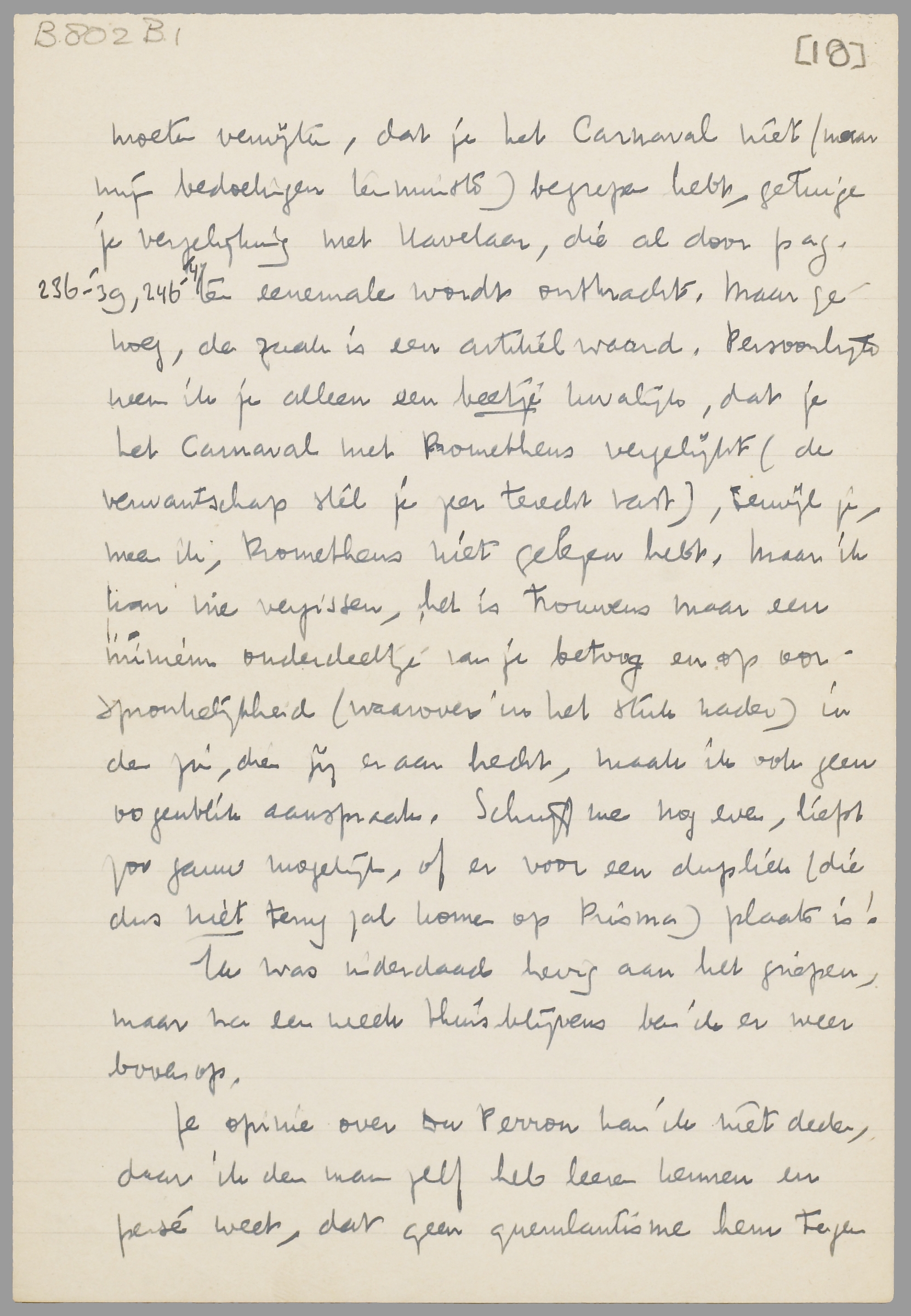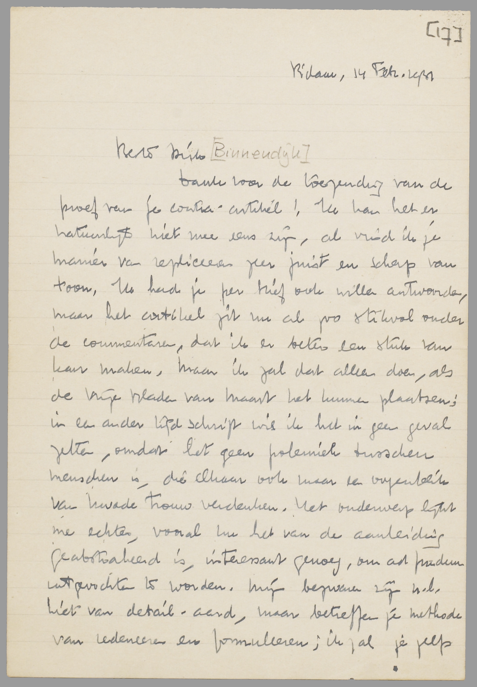 Dank voor de toezending van de proef van je contra-artikel! Ik kan het er natuurlijk niet mee eens zijn, al vind ik je manier van repliceeren zeer juist en scherp van toon. Ik had je per brief ook willen antwoorden, maar het artikel zit nu al zoo stikvol onder de commentaren, dat ik er beter een stuk van kan maken. Maar ik zal dat alleen doen, als de Vrije Bladen van Maart het kunnen plaatsen; in een ander tijdschrift wil ik het in geen geval zetten, omdat het geen polemiek tusschen menschen is, die elkaar ook maar een oogenblik van kwade trouw verdenken. Het onderwerp lijkt me echter, vooral nu het van de aanleiding geabstraheerd is, interessant genoeg, om ad fundum uitgevochten te worden. Mijn bezwaren zijn n.l. niet van detail-aard, maar betreffen je methode van redeneeren en formuleeren; ik zal je zelfs moeten verwijten, dat je het Carnaval niet (naar mijn bedoelingen tenminste) begrepen hebt, getuige je vergelijking met Havelaar, die al door pag. 236-’39, 246-’47 ten eenenmale wordt ontkracht. Maar genoeg, de zaak is een artikel waard. Persoonlijk neem ik je alleen een beetje kwalijk, dat je het Carnaval met Prometheus vergelijkt (de verwantschap stel je zeer terecht vast), terwijl je, meen ik, Prometheus niet gelezen hebt. Maar ik kan me vergissen, het is trouwens maar een miniem onderdeeltje van je betoog en op oorspronkelijkheid (waarover in het stuk nader) in den zin, dien jij er aan hecht, maak ik ook geen oogenblik aanspraak. Schrijf me nog even, liefst zoo gauw mogelijk, of er voor een dupliek (die dus niet terug zal komen op Prisma) plaats is!