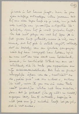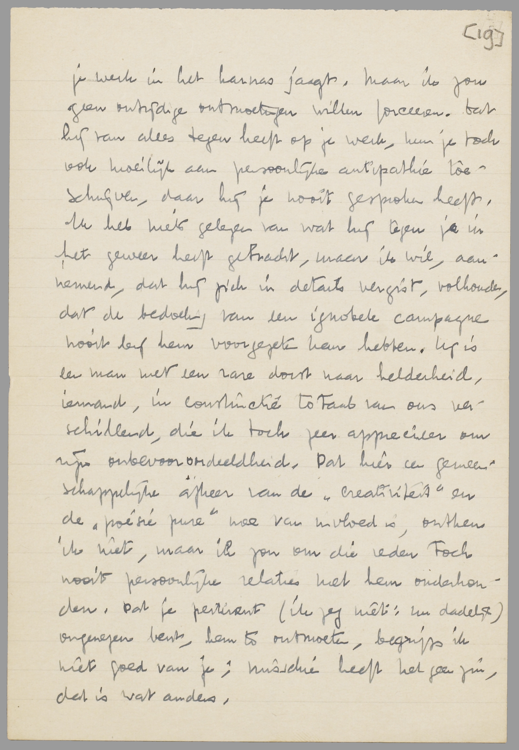 Je opinie over Du Perron kan ik niet deelen, daar ik den man zelf heb leeren kennen en persé weet, dat geen querulantisme hem tegen je werk in het harnas jaagt. Maar ik zou geen ontijdige ontmoetingen willen forceeren. Dat hij van alles tegen heeft op je werk, kun je toch ook moeilijk aan persoonlijke antipathie toeschrijven, daar hij je nooit gesproken heeft. Ik heb niets gelezen van wat hij tegen je in het geweer heeft gebracht, maar ik wil, aannemend, dat hij zich in details vergist, volhouden, dat de bedoeling van een ignobele campagne nooit bij hem voorgezeten kan hebben. Hij is een man met een rare dorst naar helderheid, iemand, in consciëntie totaal van ons verschillend, die ik toch zeer apprecieer om zijn onbevooroordeeldheid. Dat hier een gemeenschappelijke afkeer van de ‘creativiteit’ en de ‘poésie pure’ mee van invloed is, ontken ik niet, maar ik zou om die reden toch nooit persoonlijke relaties met hem onderhouden. Dat je pertinent (ik zeg niet: nu dadelijk) ongenegen bent, hem te ontmoeten, begrijp ik niet goed van je; misschien heeft het geen zin, dat is wat anders.